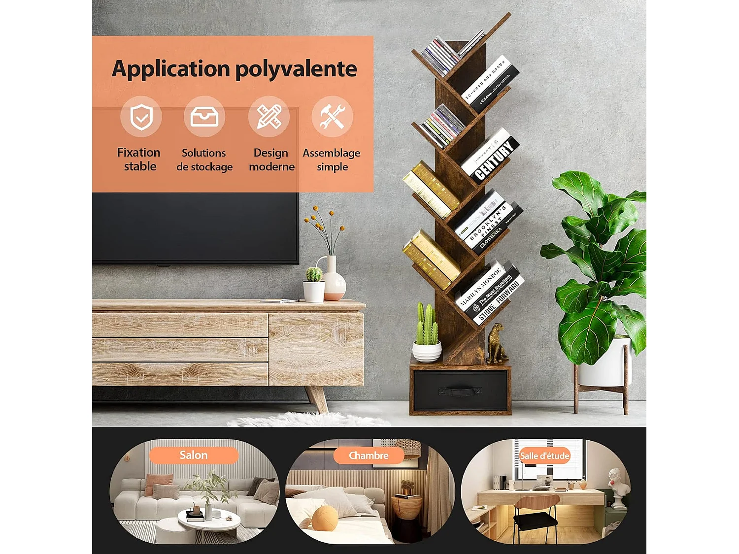 Bibliothèque industrielle à 5 niveaux en forme d’arbre, avec tiroir, marron rustique