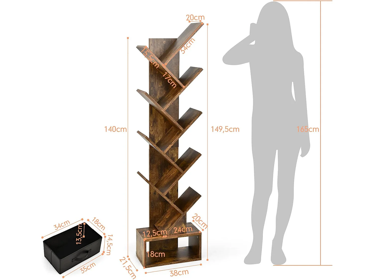 Bibliothèque à 8 niveaux en forme arbre avec tiroir tissu amovible, marron