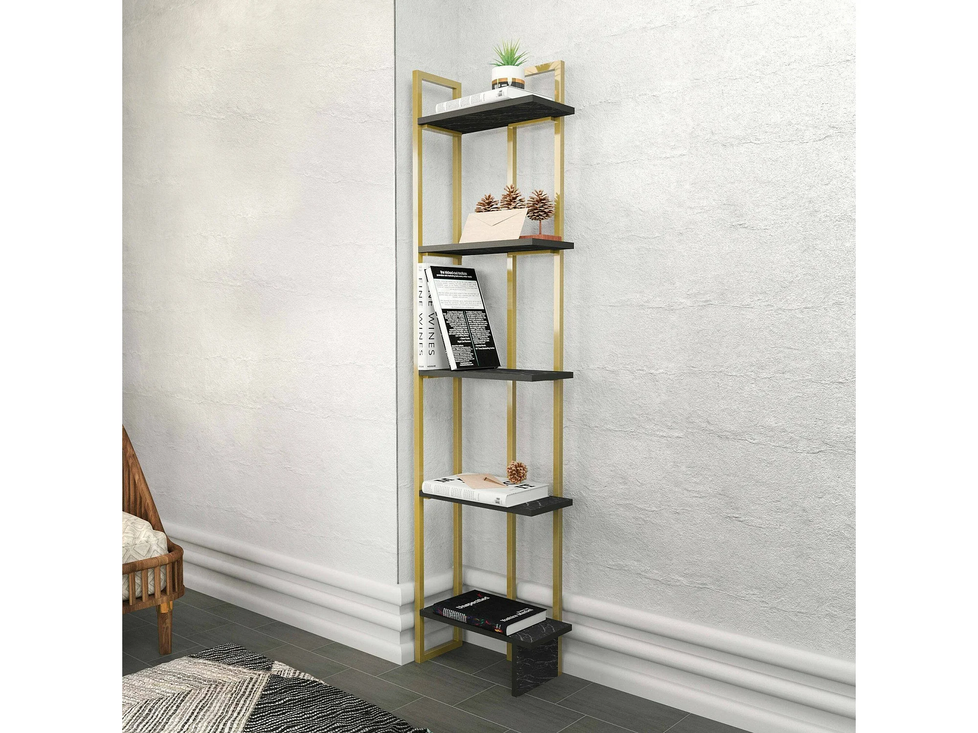 Bibliothèque Alnair, Etagère de bureau, Porte-livre mobile, Librairie, 45x22h180 cm, Noir et Or