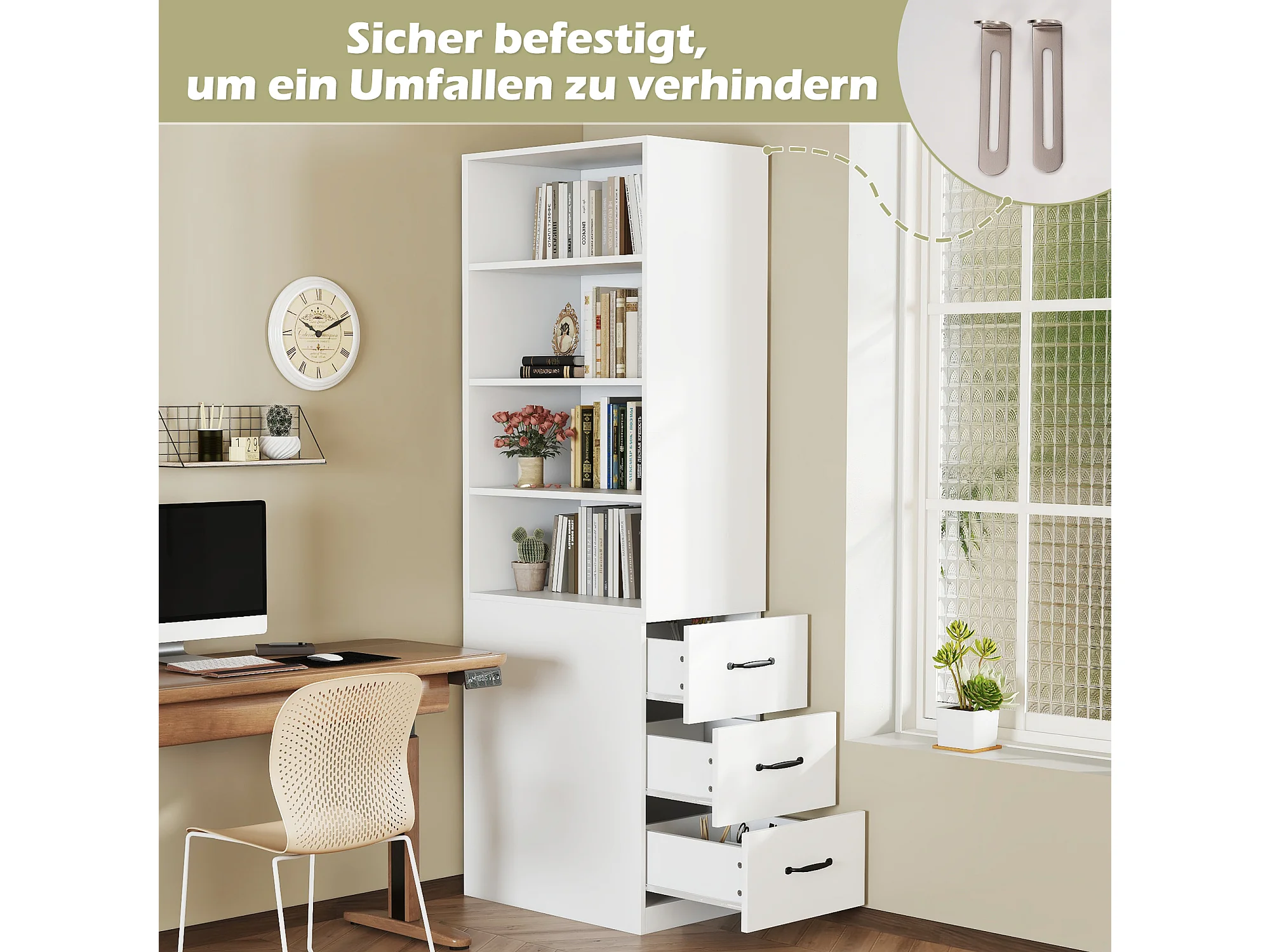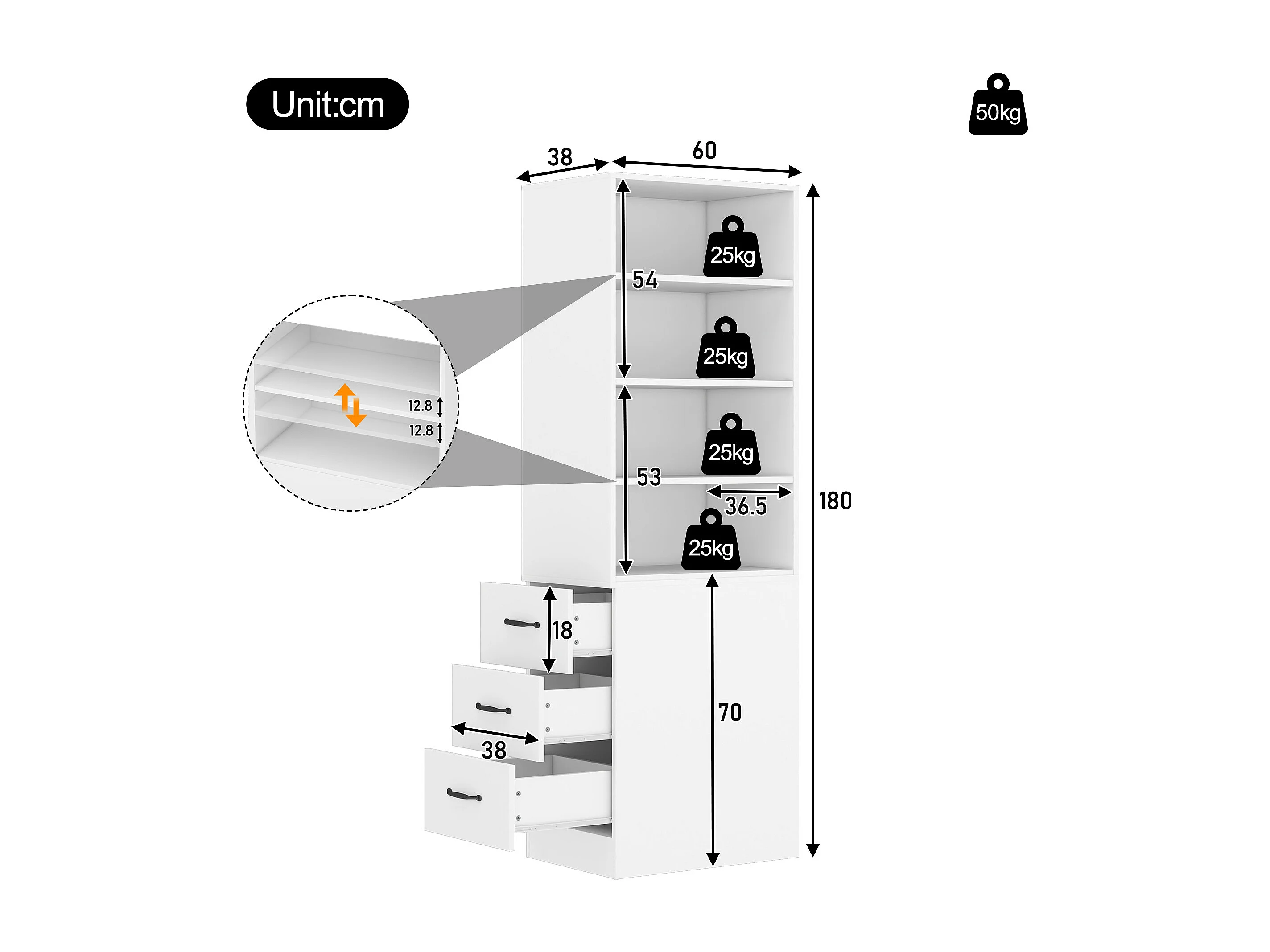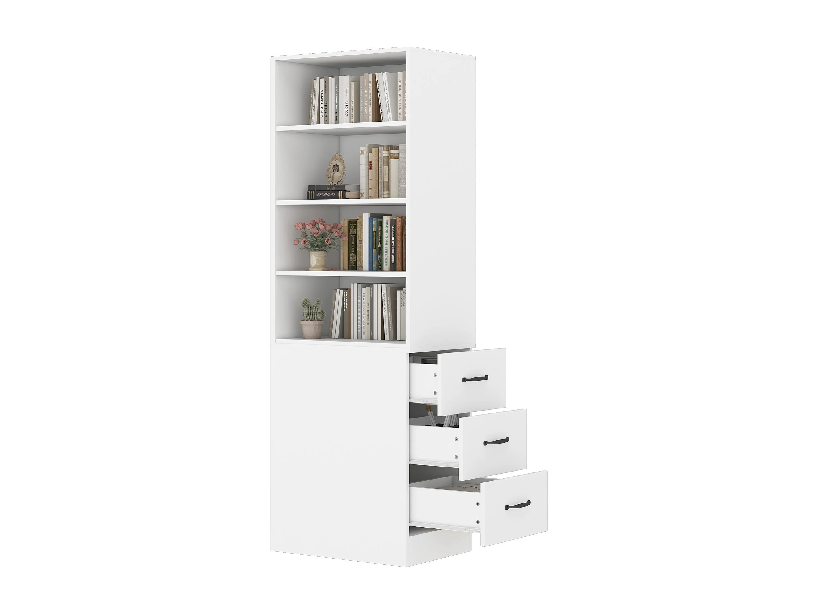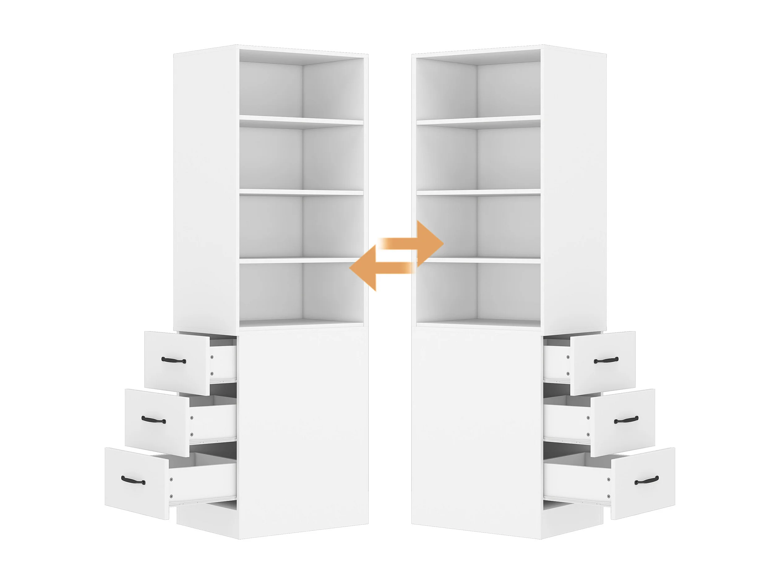 Bibliothèque avec 3 tiroirs latéraux et étagères - Blanc 60x38x180 cm