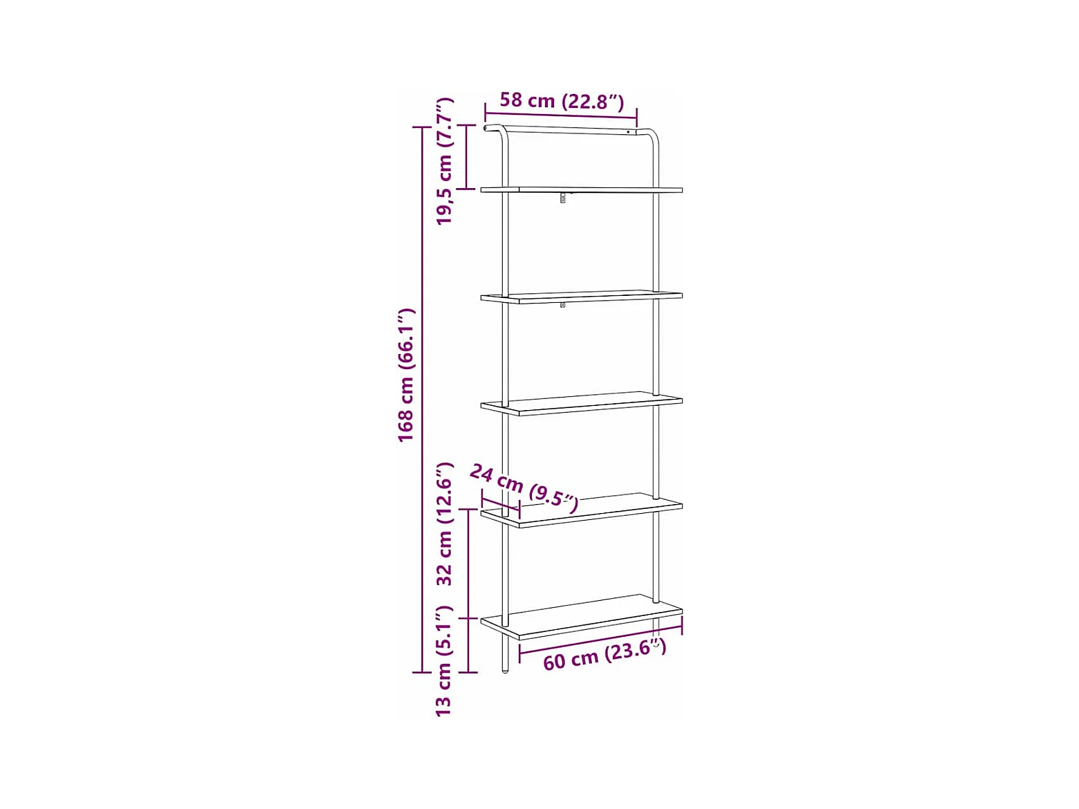 Bibliothèque industrielle à 4 niveaux, 64 x 24 x 119,5 cm, étagère de rangement avec crochets