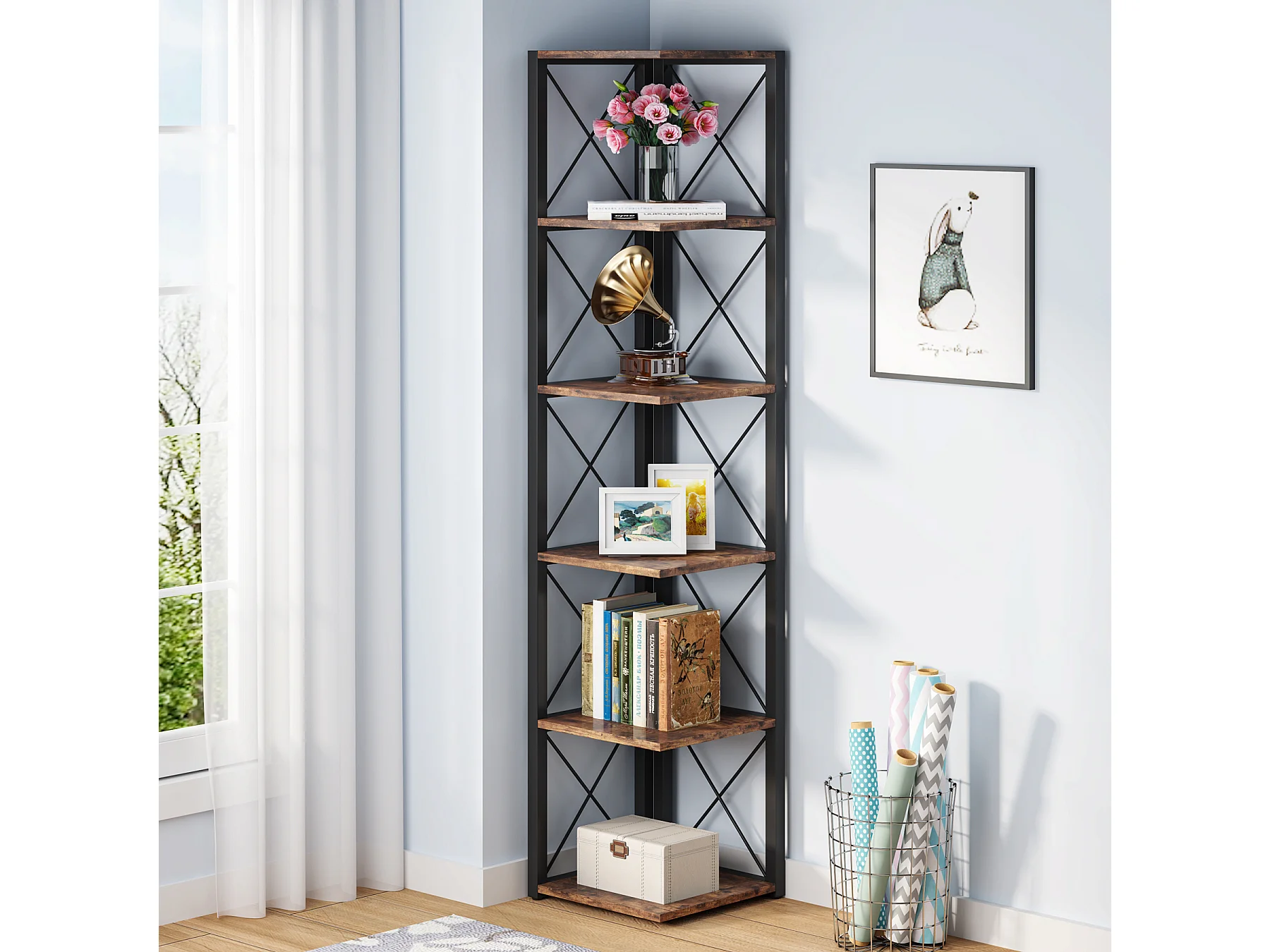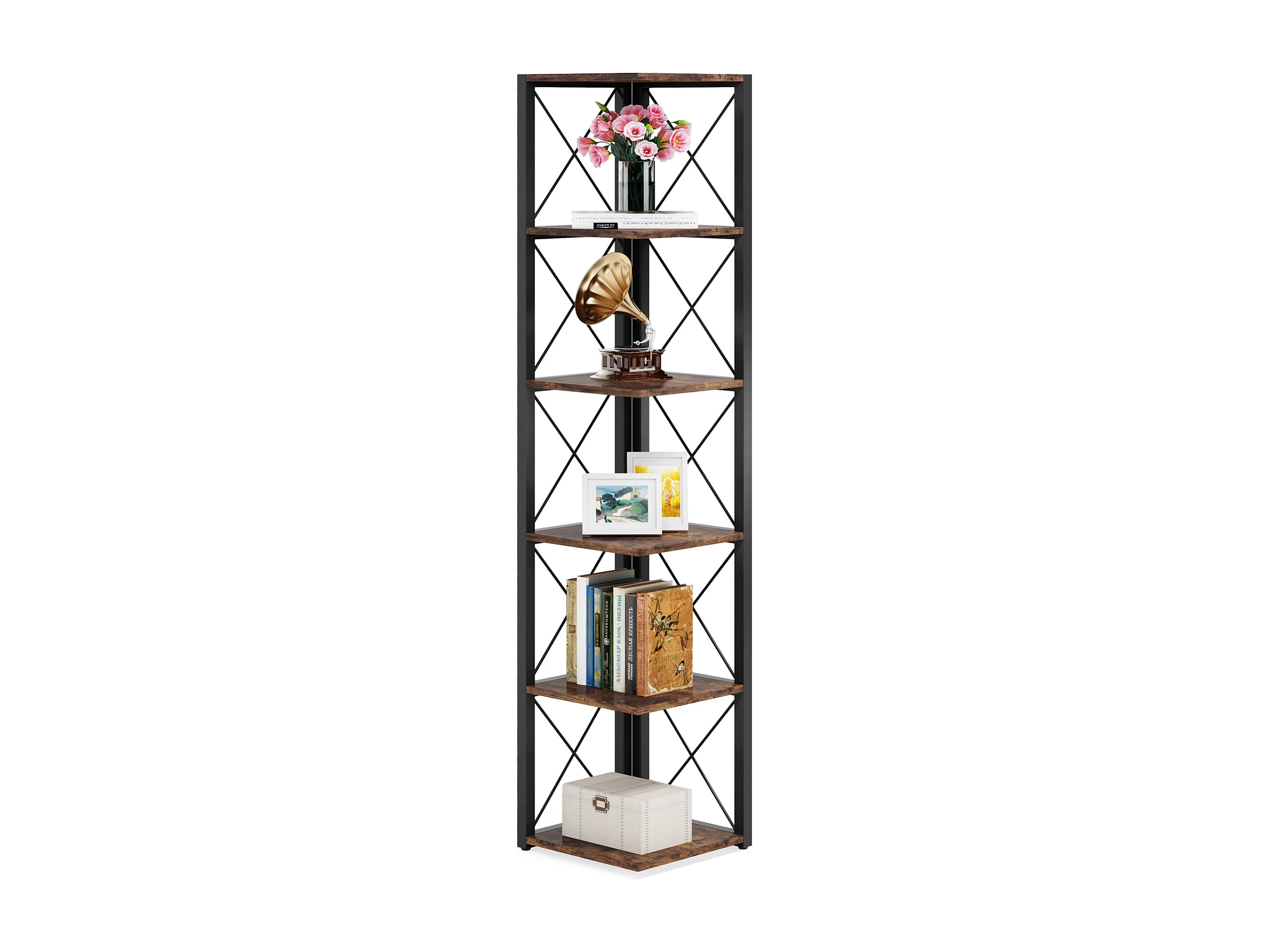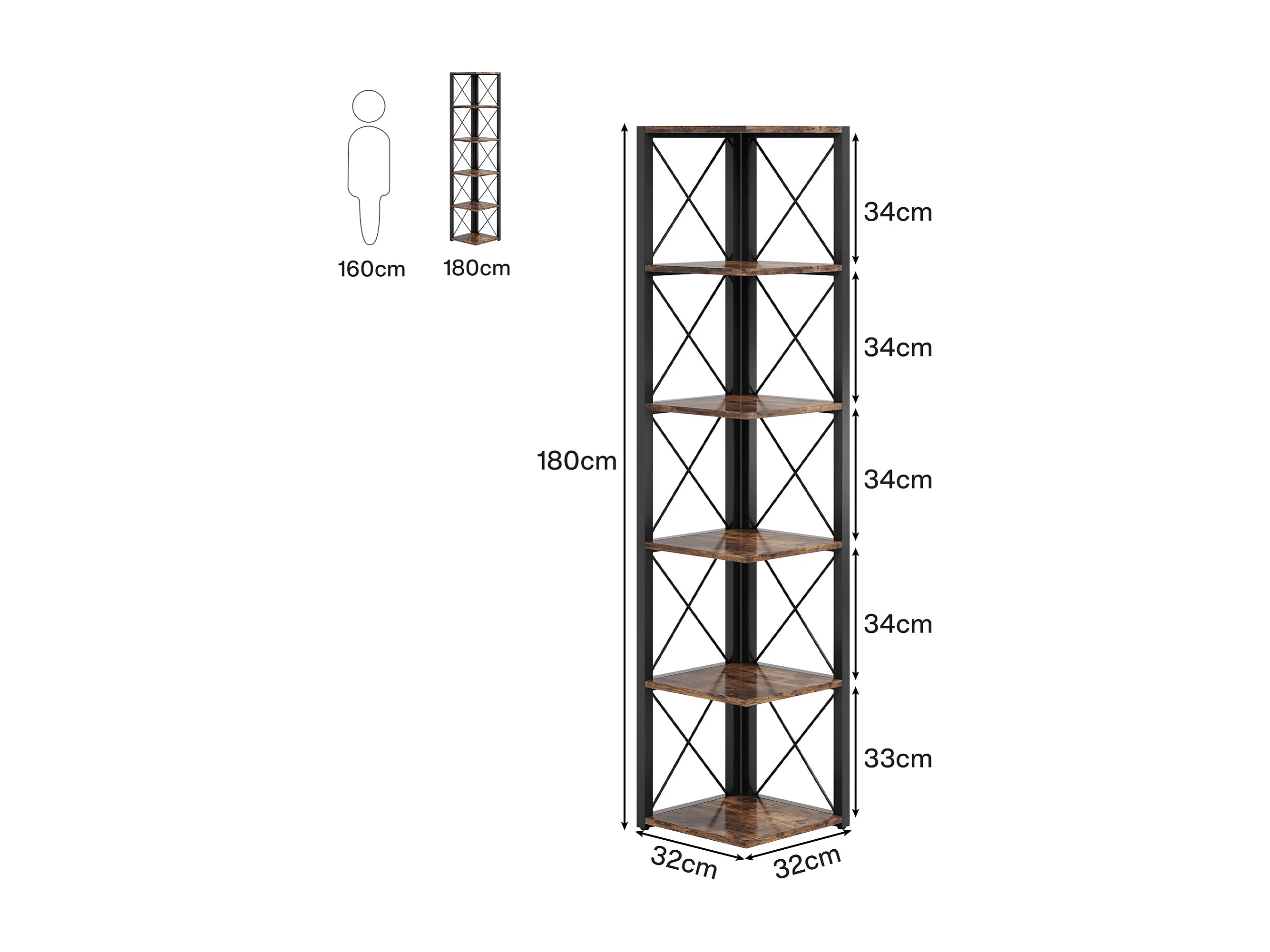 Bibliothèque d'angle, étagère de Rangement étagère, Support de Plante, 6 Niveaux Industriel pour la Maison, Bureau, Salon, Marron Vintage, 32x32x180cm
