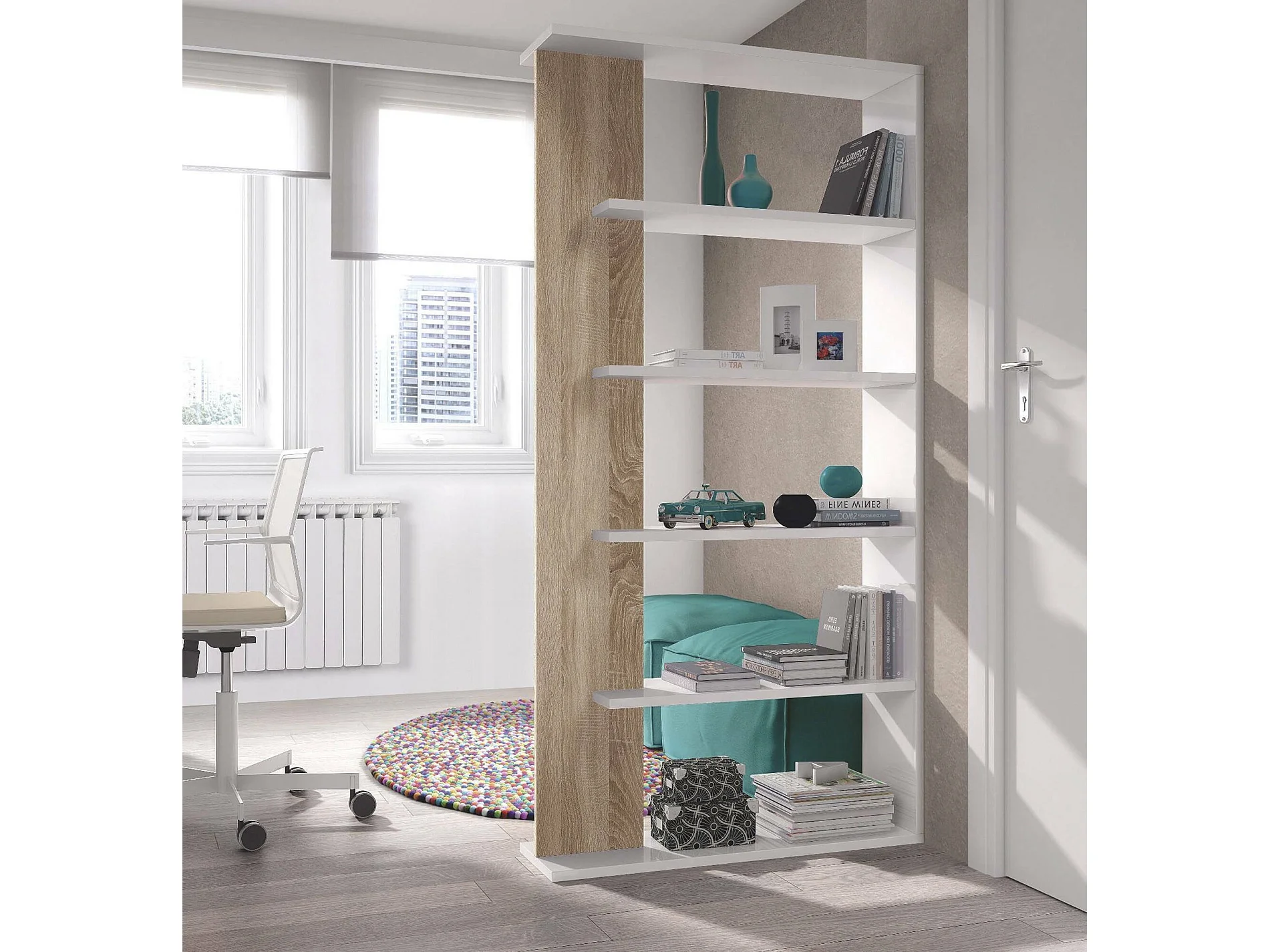 Bibliothèque Dblanc, Bibliothèque double face avec 5 étagères, Etagère de séparation pour bureau ou chambre, 90x25h180 cm, Blanc et Chêne
