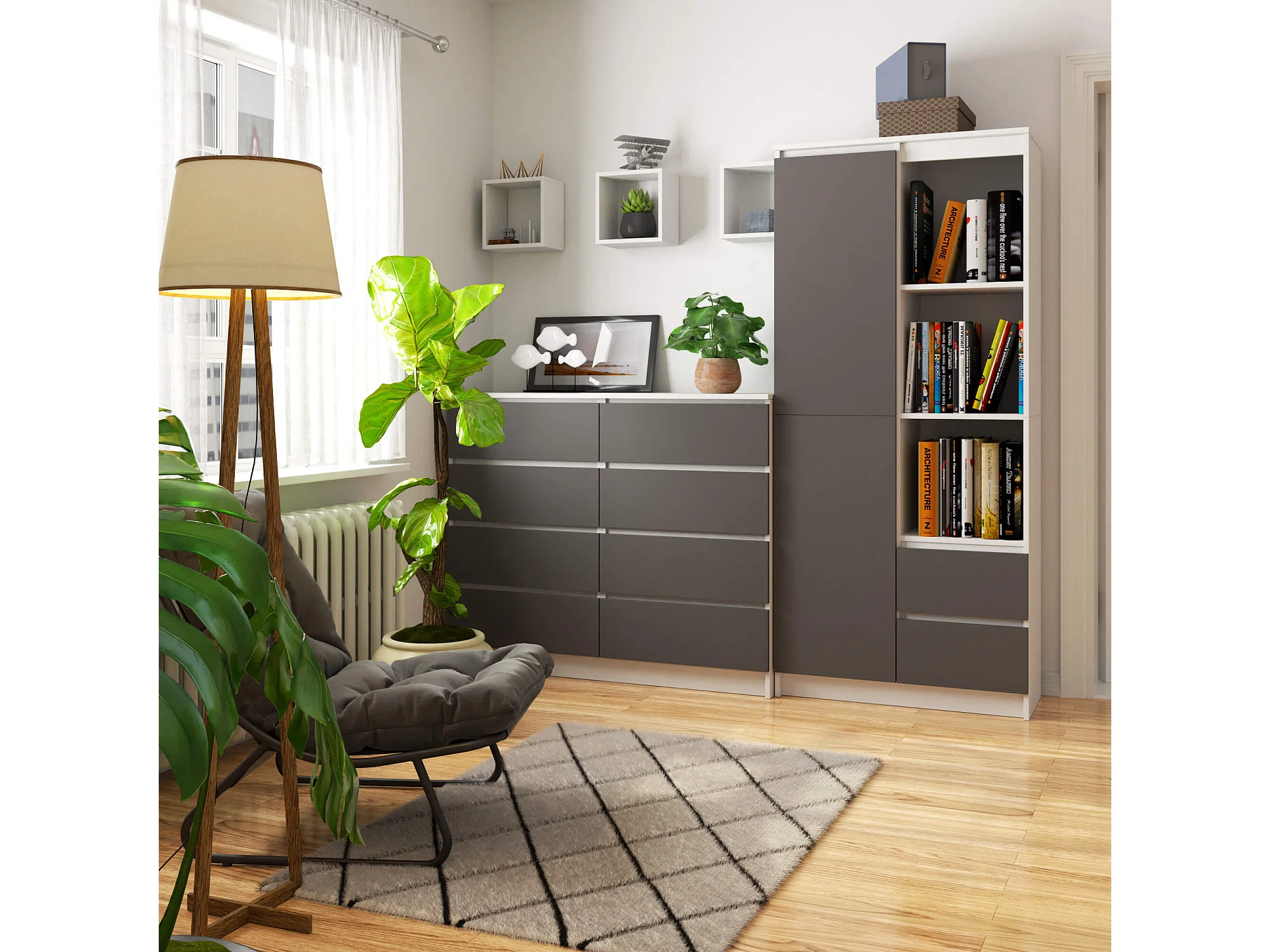 Bibliothèque de bureau AKORD R11 Blanche 80 cm 1 porte 2 tiroirs façade Gris Graphite mat 7 étagères 80x35x180 cm