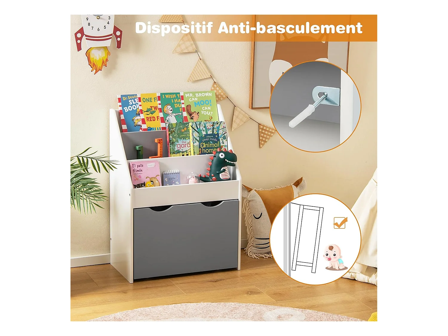 Bibliothèque enfant avec 3 étagères et boîte à jouets roulant, charge 11kg