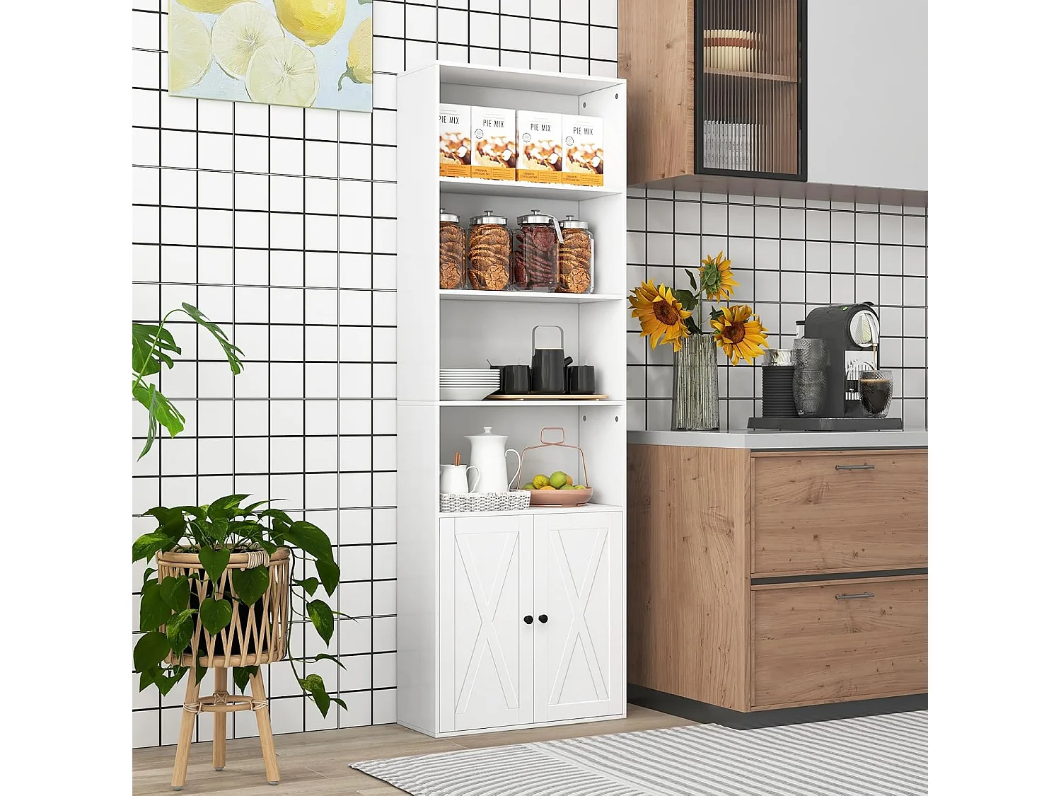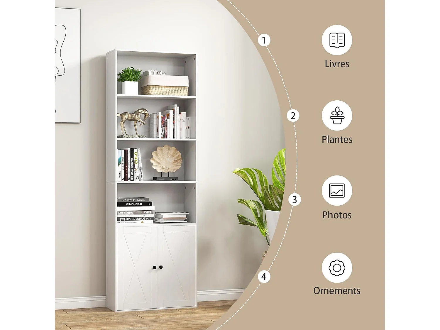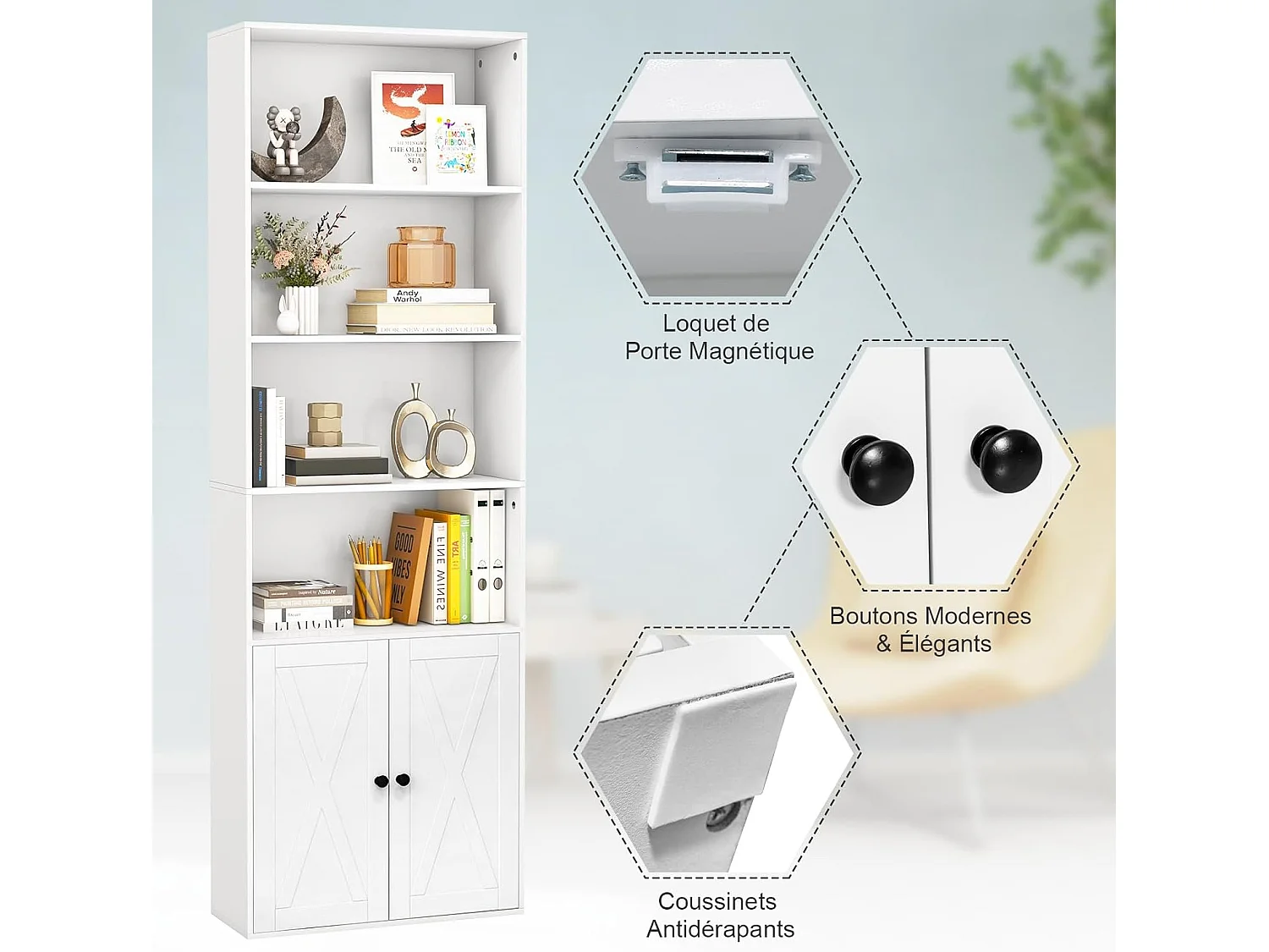 Bibliothèque Étagère 180 cm, Colonne de Rangement 6 Étagères, Armoire d'Affichage à 2 Portes avec Étagère Réglable, pour Salon, Bureau, Chambre, 60 x 24 x 180 cm, Blanc