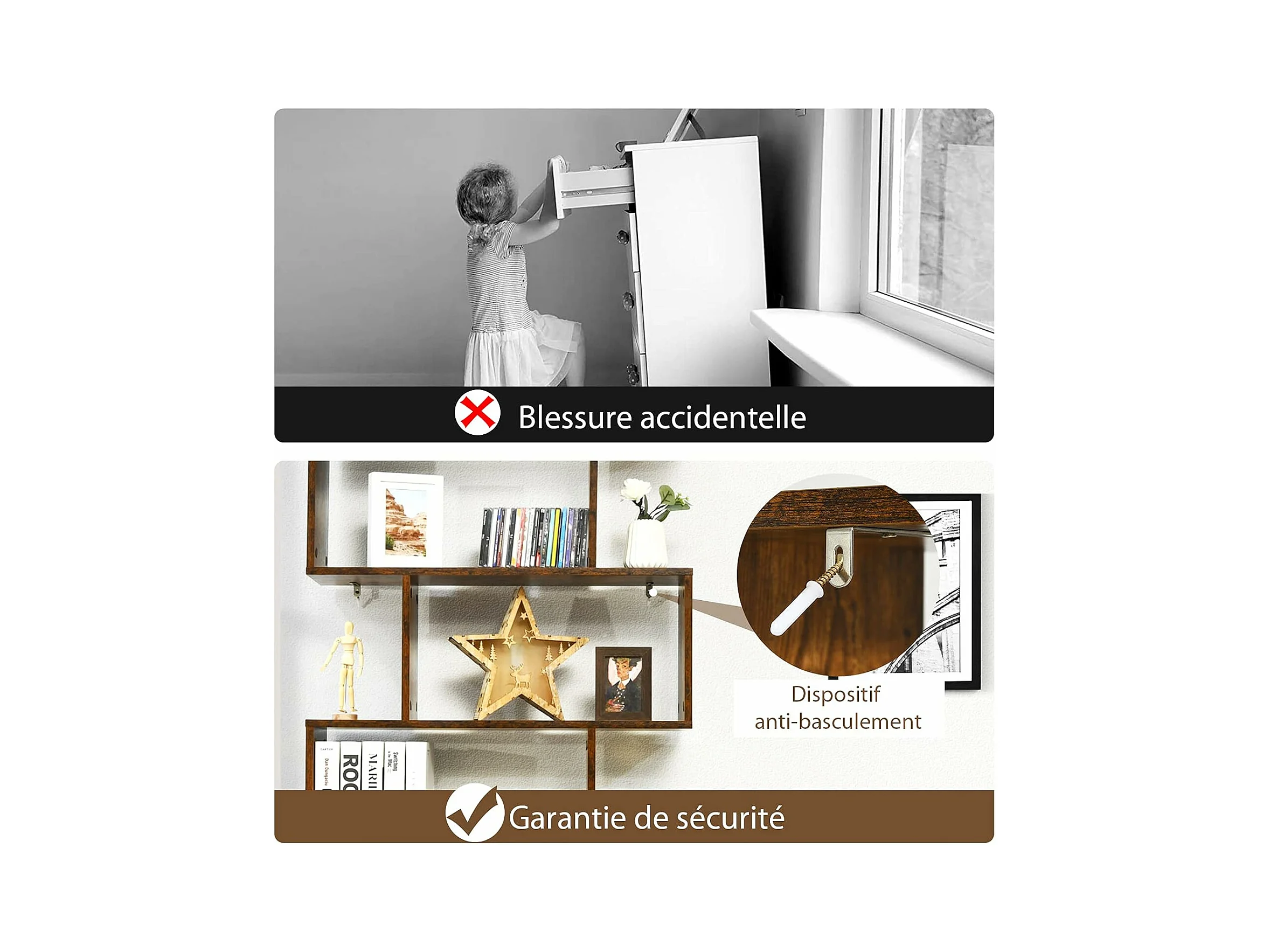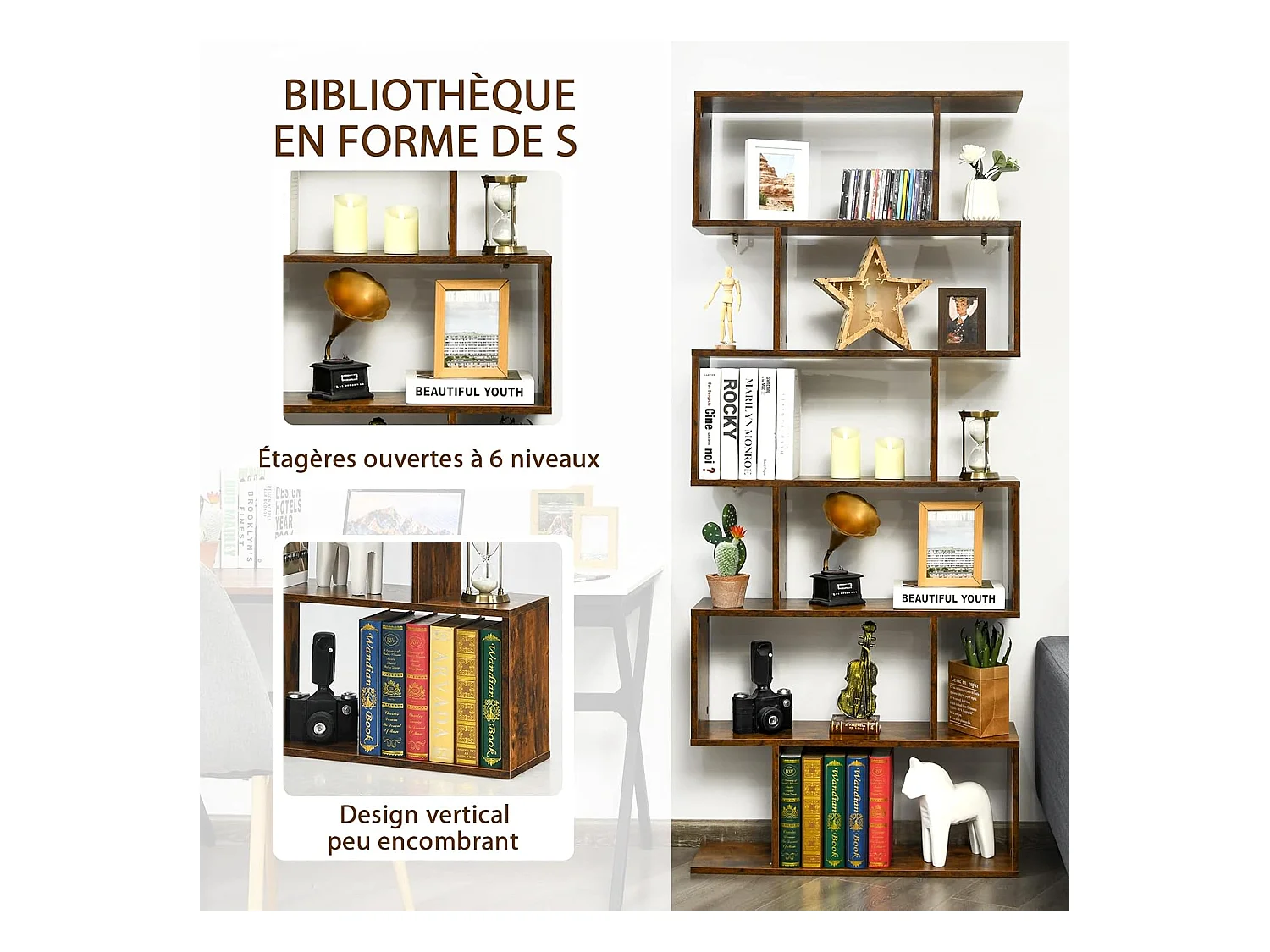 Bibliothèque Industriel en Forme de S, Étagère à 6 Niveaux, Meuble de Rangement avec Anti-basculement, 80 x 23 x 191 cm, pour Salon, Chambre, Bureau, Marron