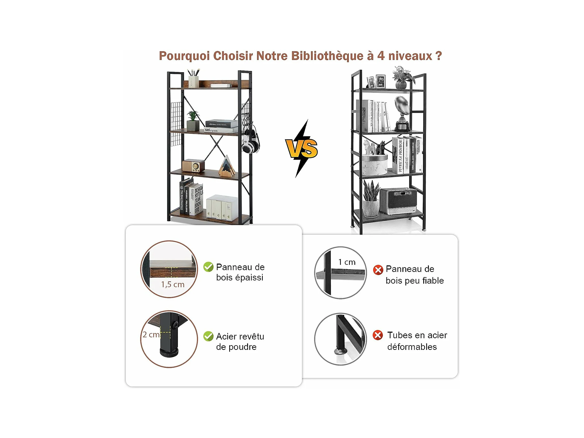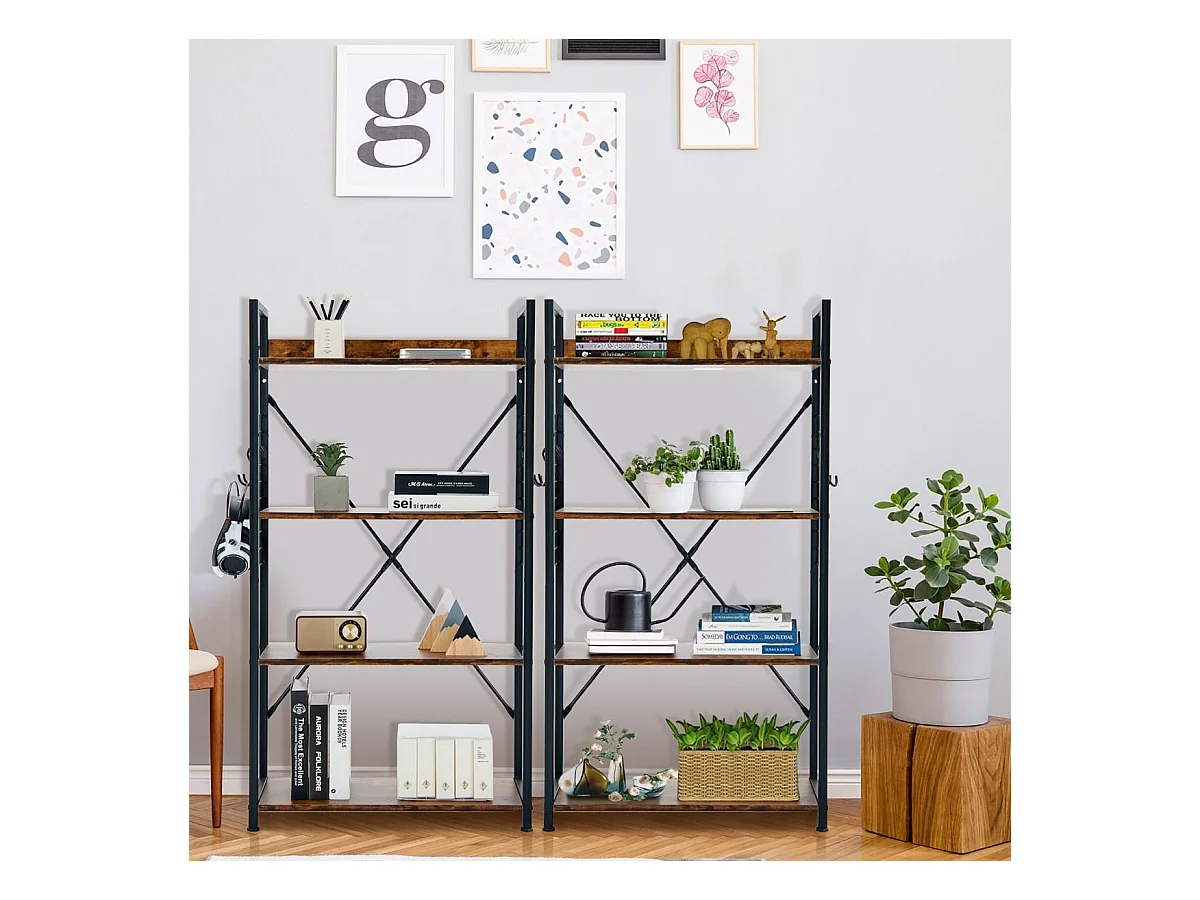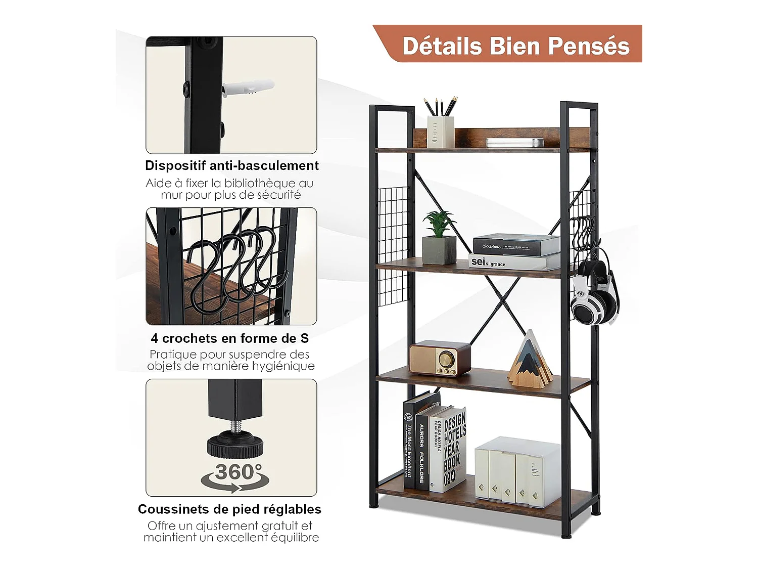 Bibliothèque industrielle à 4 niveaux, 64 x 24 x 119,5 cm, étagère de rangement avec crochets