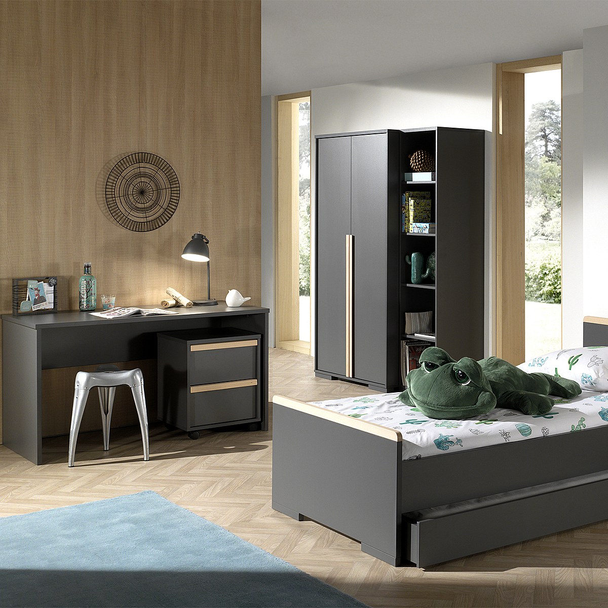 Bibliothèque 3 portes 1 tiroir Paul Bois et Gris anthracite