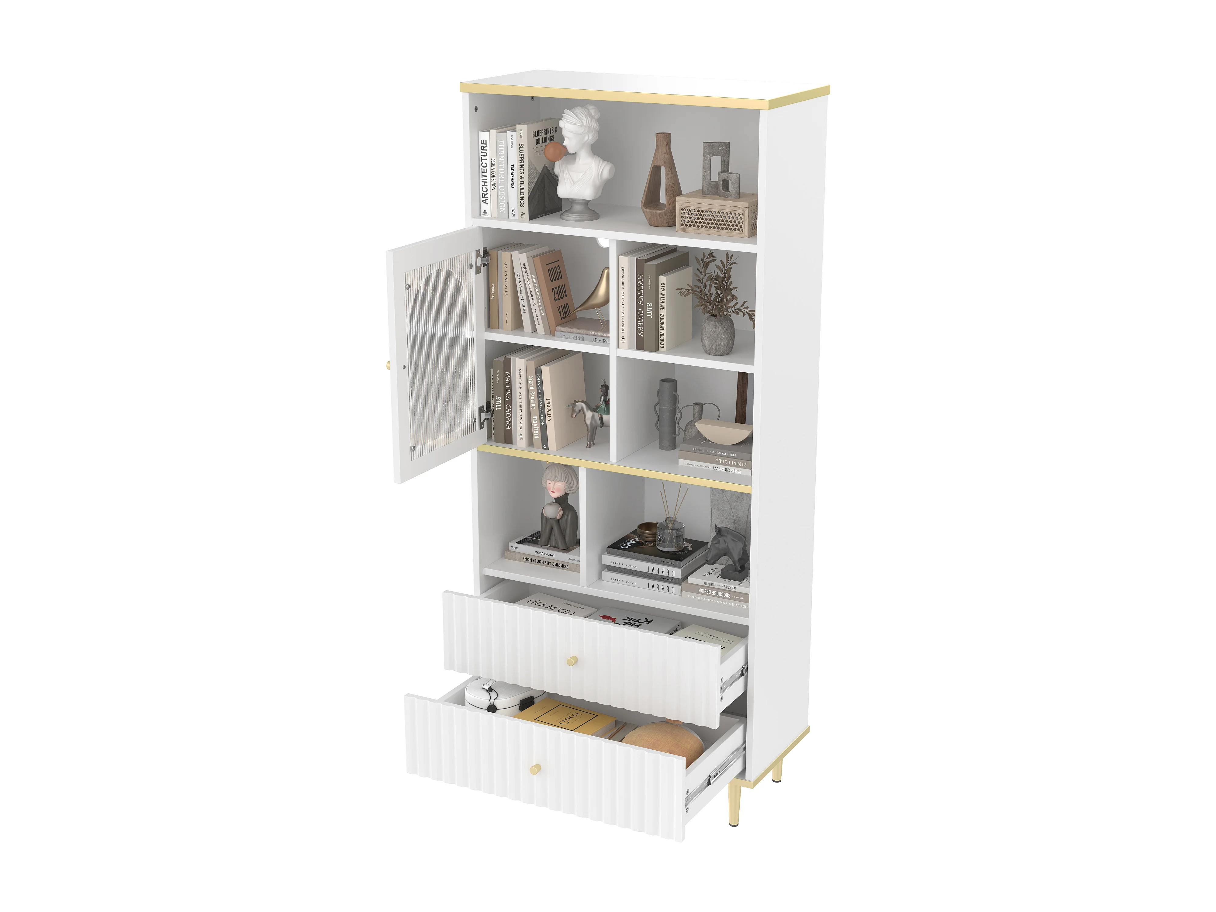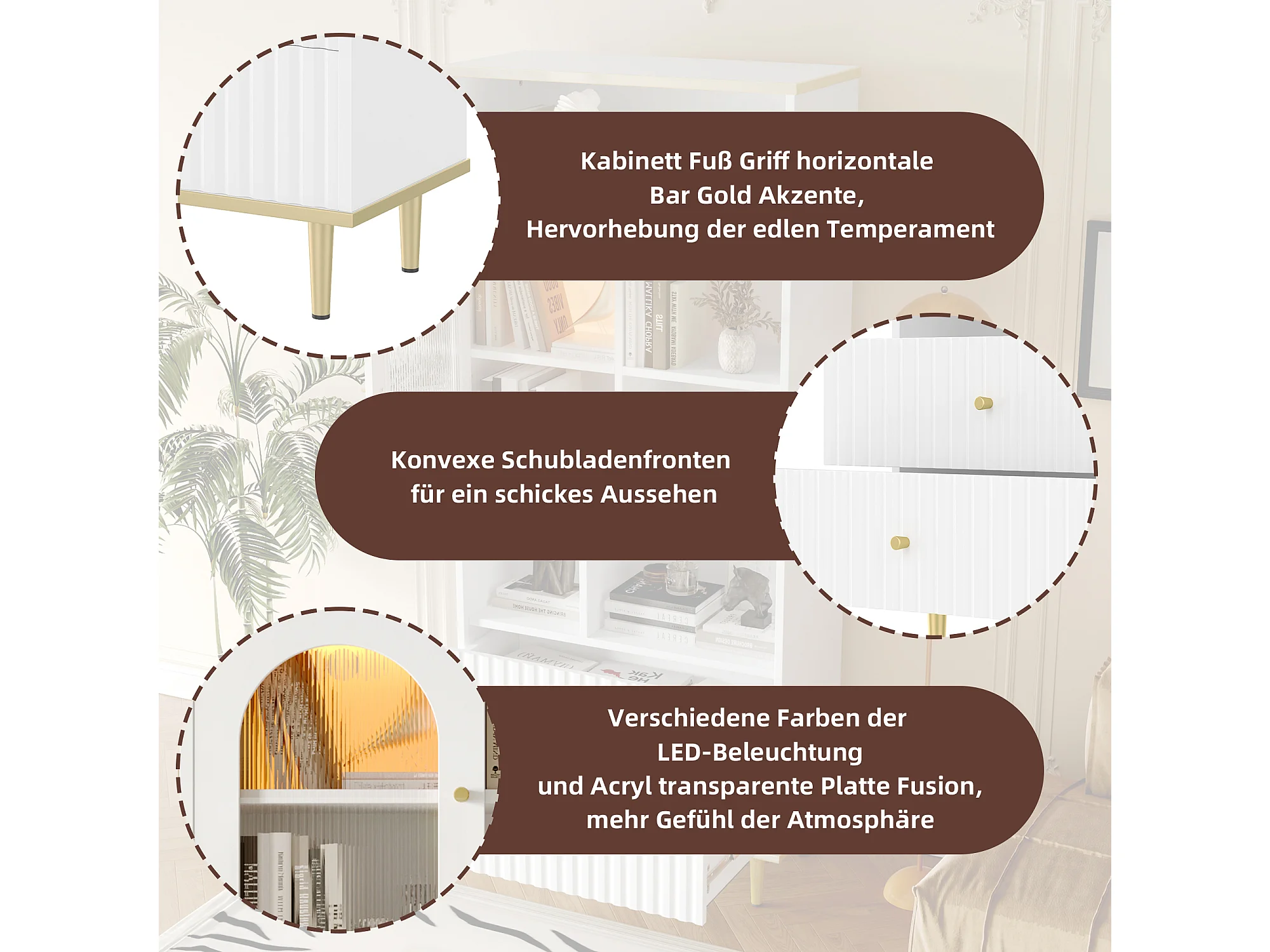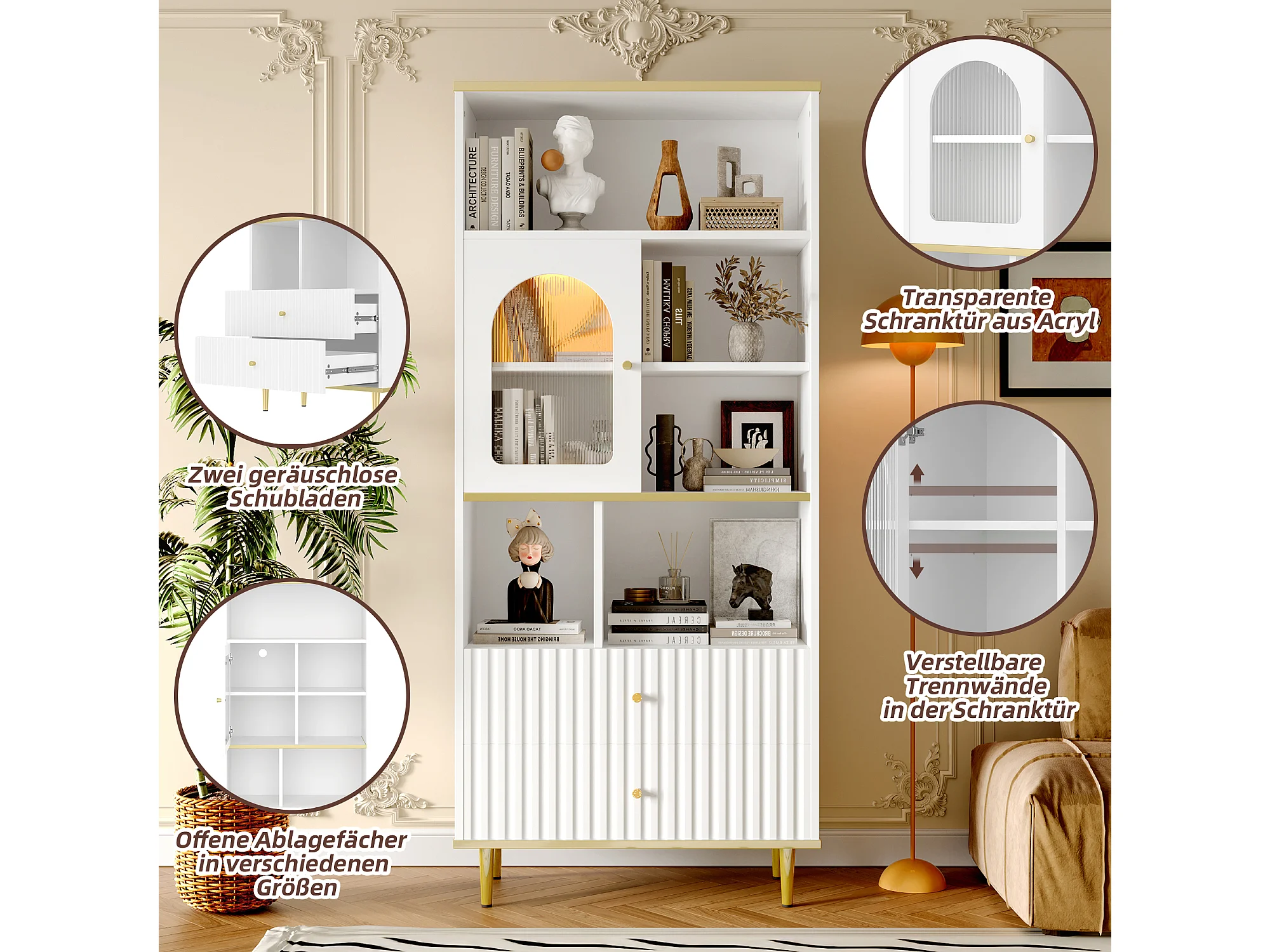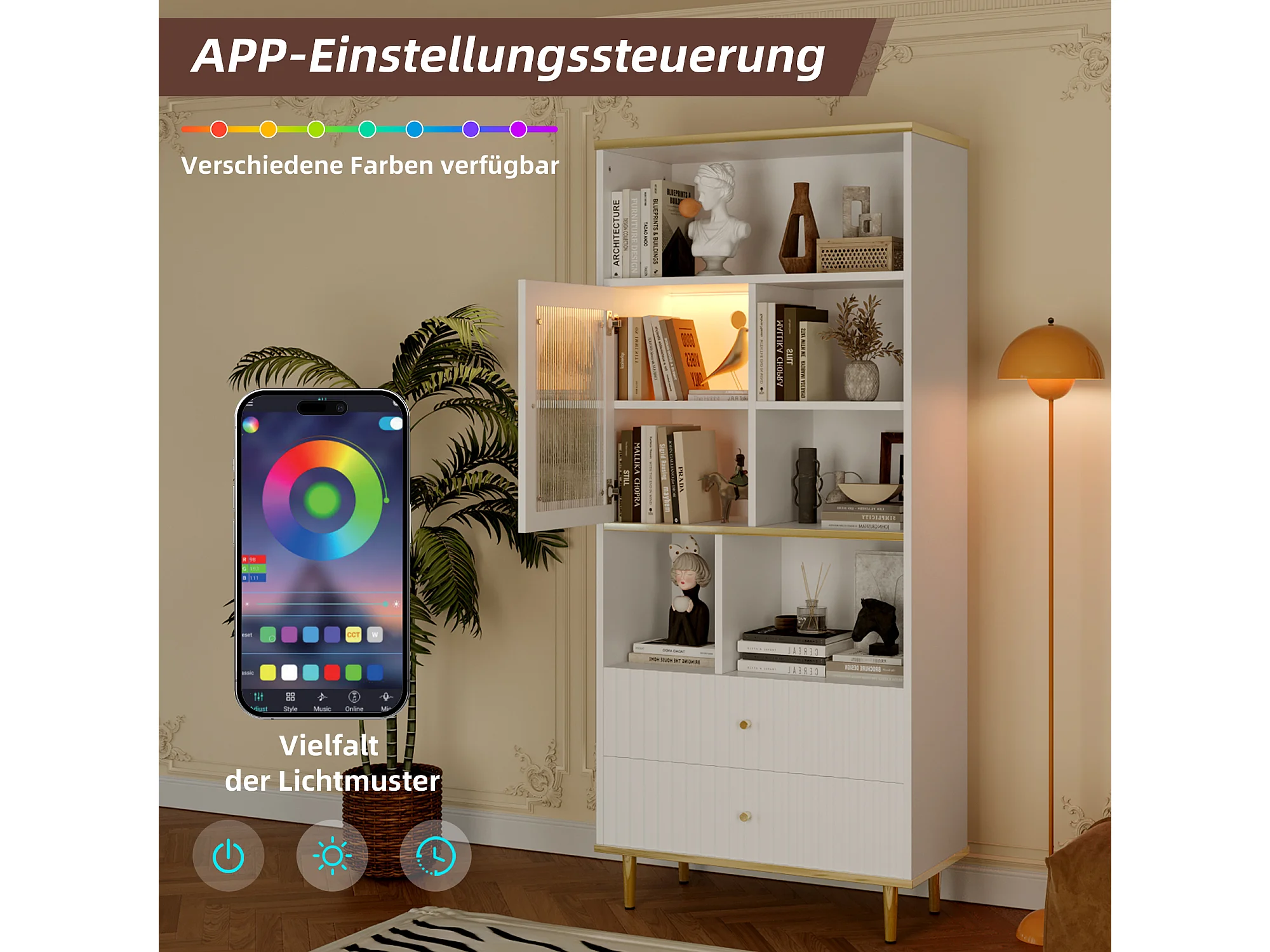 Bibliothèque multifonctionnelle, étagères avec portes transparentes, 2 tiroirs silencieux, éclairage LED multicolore (78x36x180 cm)