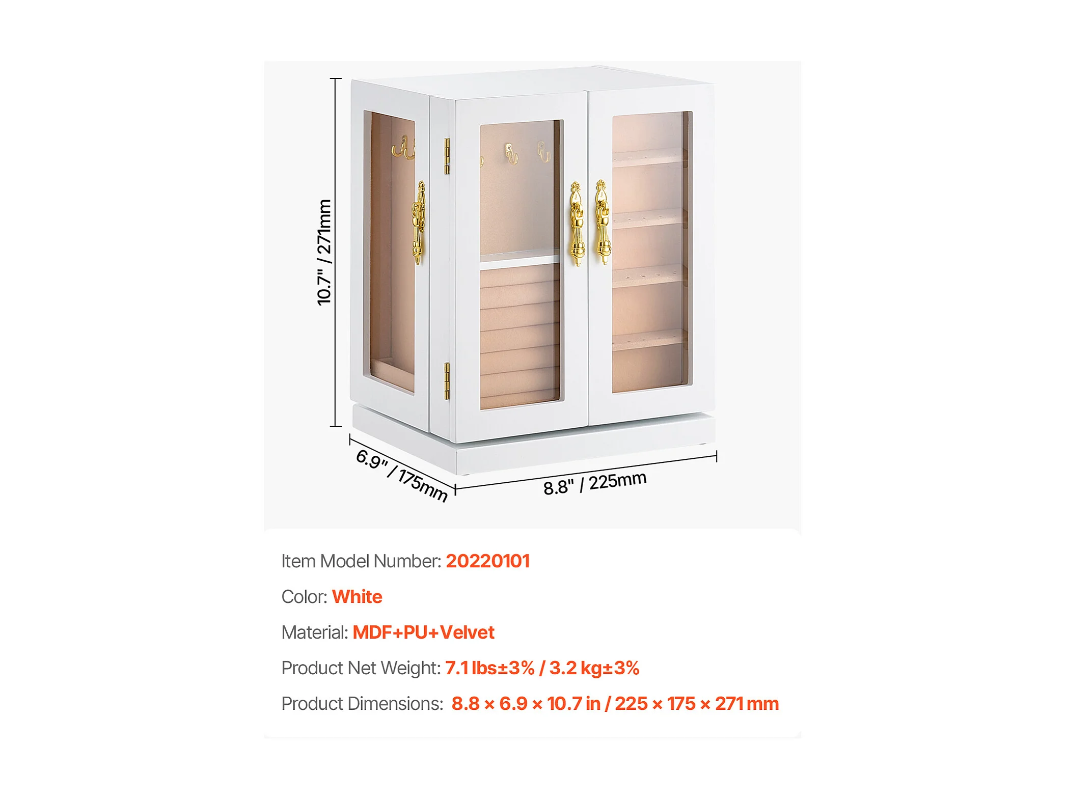 Boîte à Bijoux Rotative SucceBuy à 360°, avec Porte Magnétique, Fenêtre en Acrylique, 4 Crochets Intégrés de Colliers, Poignées Métal, Doublure en Flanelle Douce
