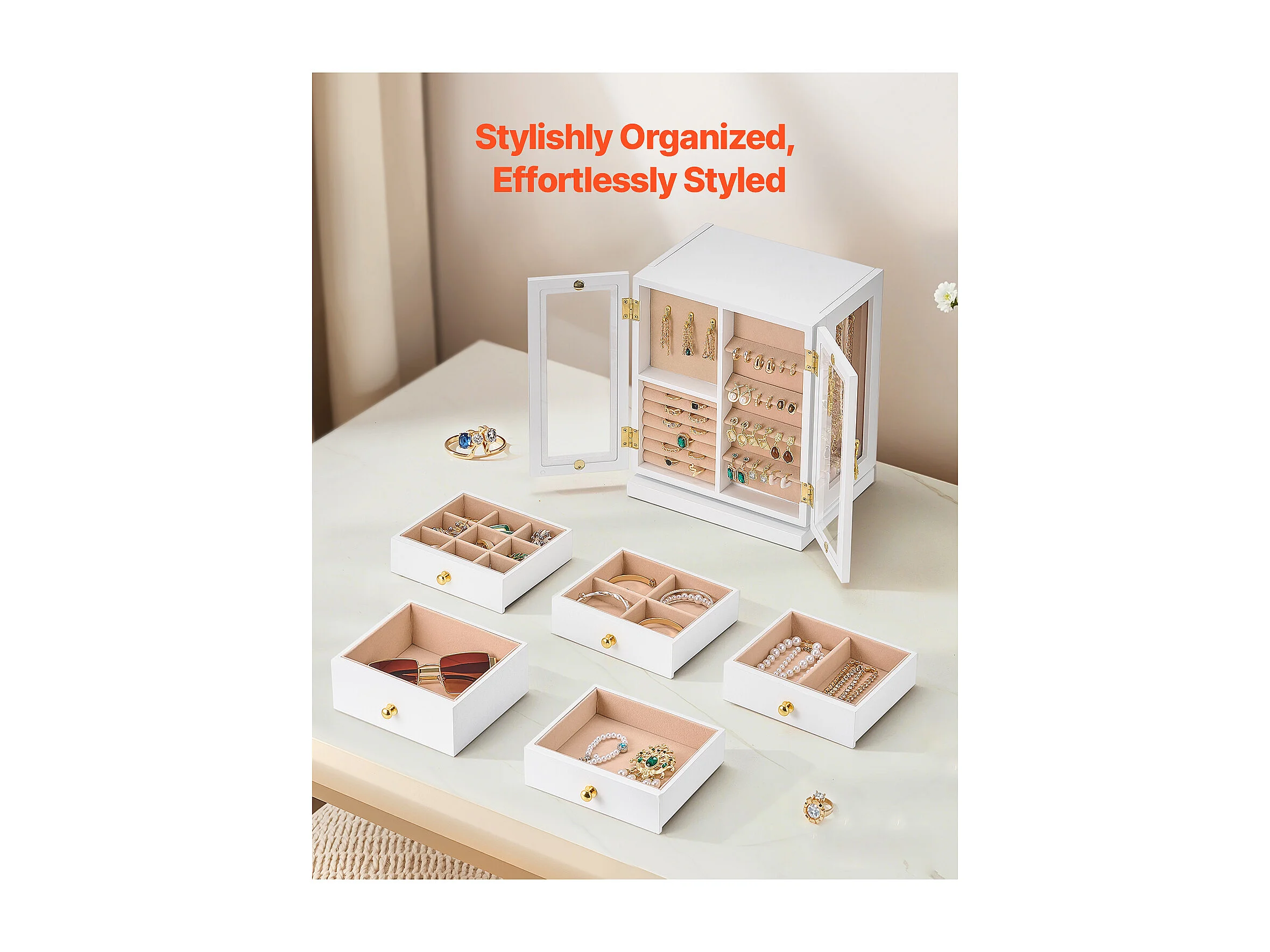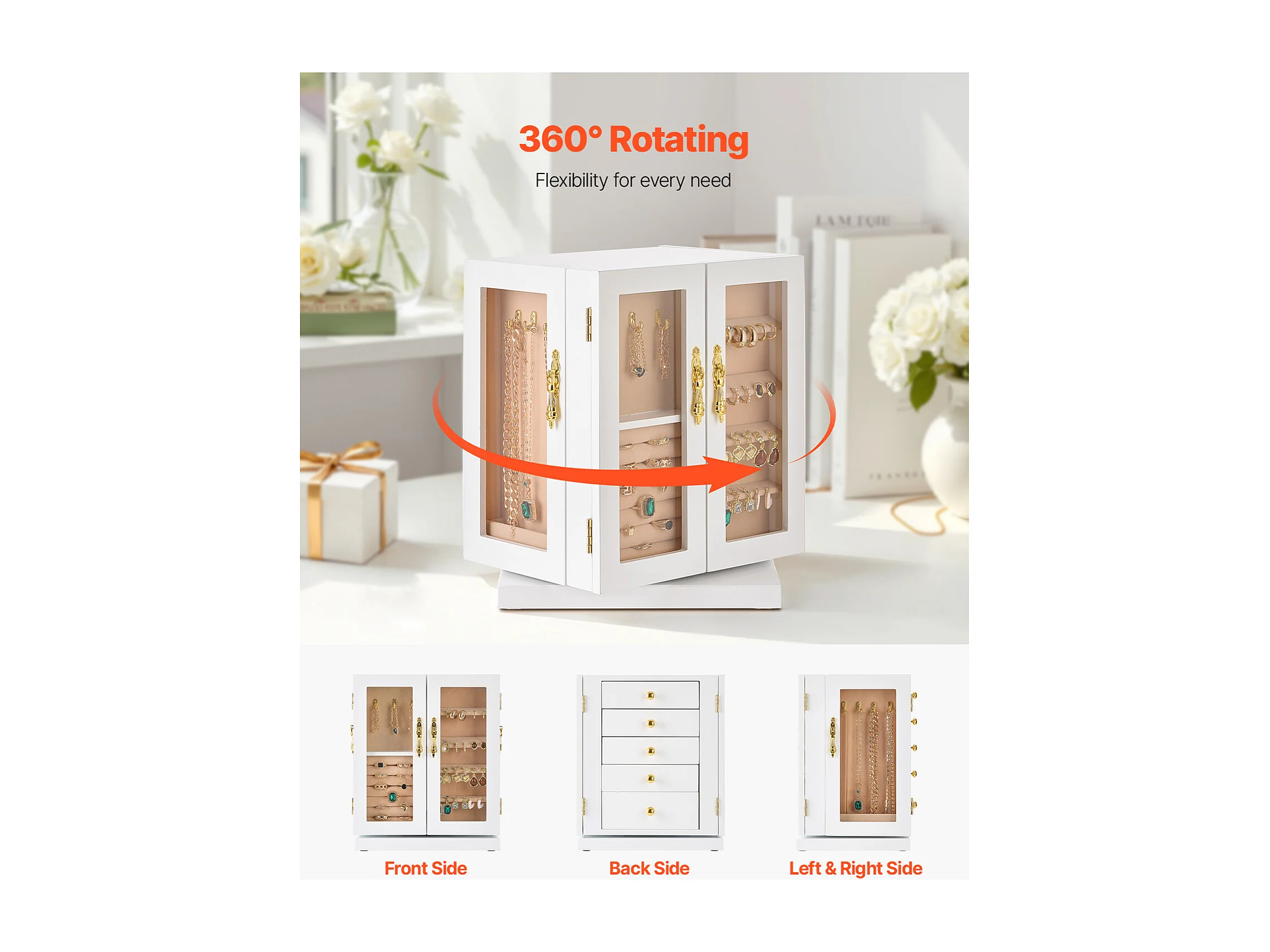 Boîte à Bijoux Rotative SucceBuy à 360°, avec 5 Tiroirs et Fenêtre en Acrylique, Grand Étui de Rangement avec Poignées en Métal, Doublure en Velours Doux, Blanc