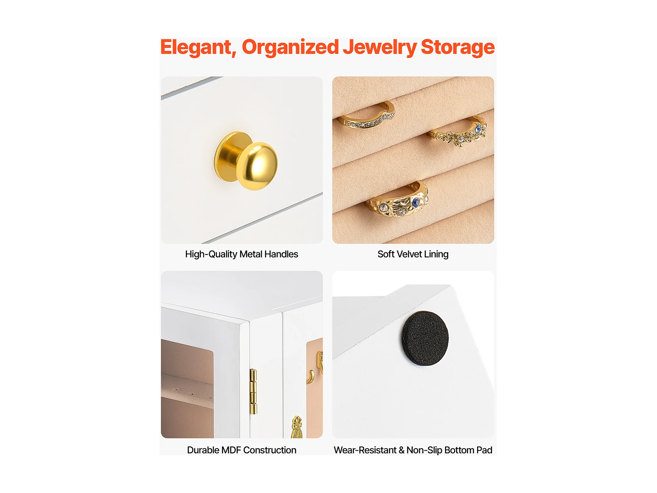 Armoire à Bijoux SucceBuy sur Pied en Bois, Coffre Rangement à Bijoux avec 4 Tiroirs, Miroir Rabattable, 4 Compartiments Rangement Supérieurs, Poignées