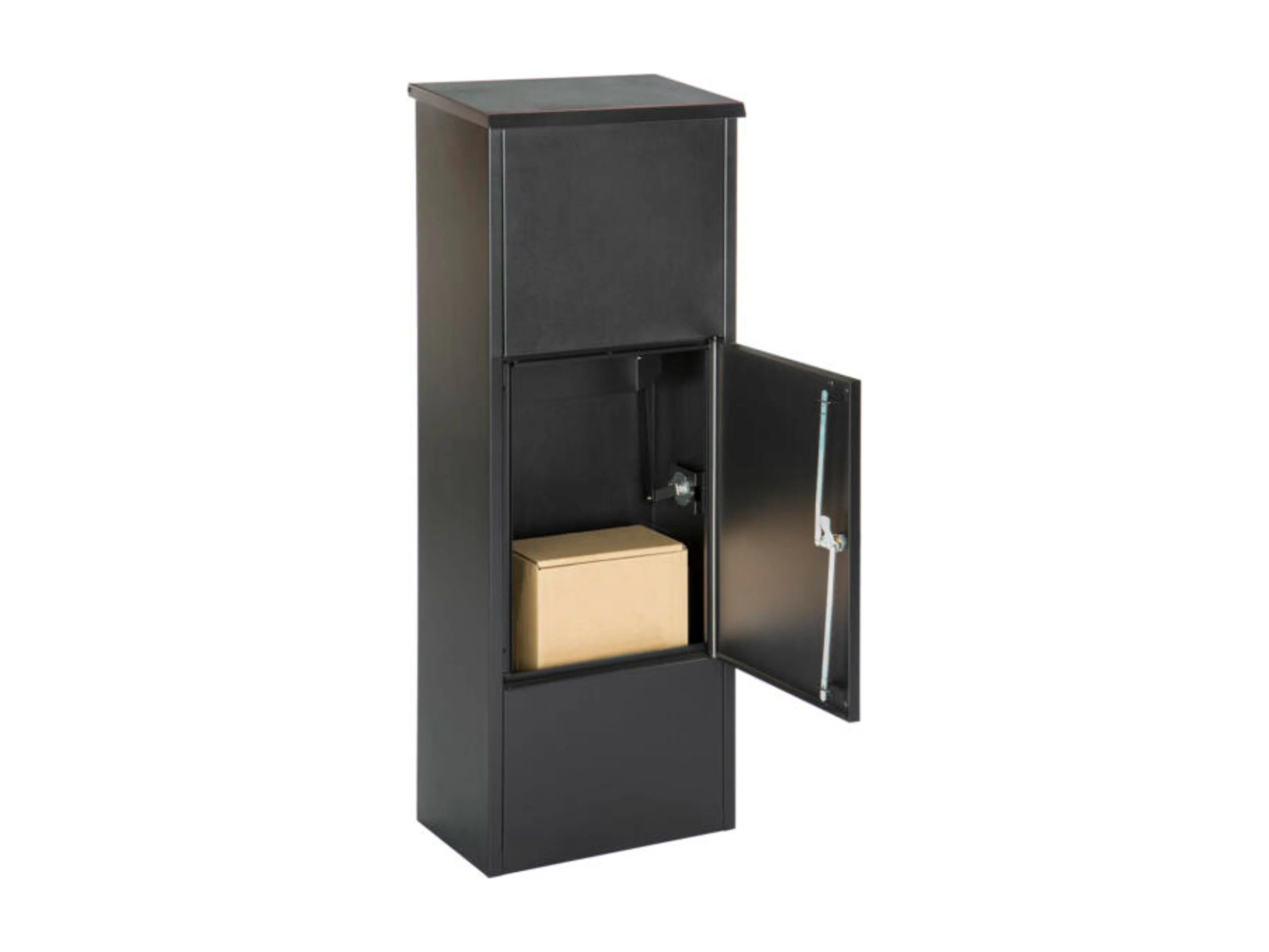 Boîte aux lettres pour colis – Colonne noire – Grande ouverture 19 x 34 cm – Fixation au sol – Serrure à clé