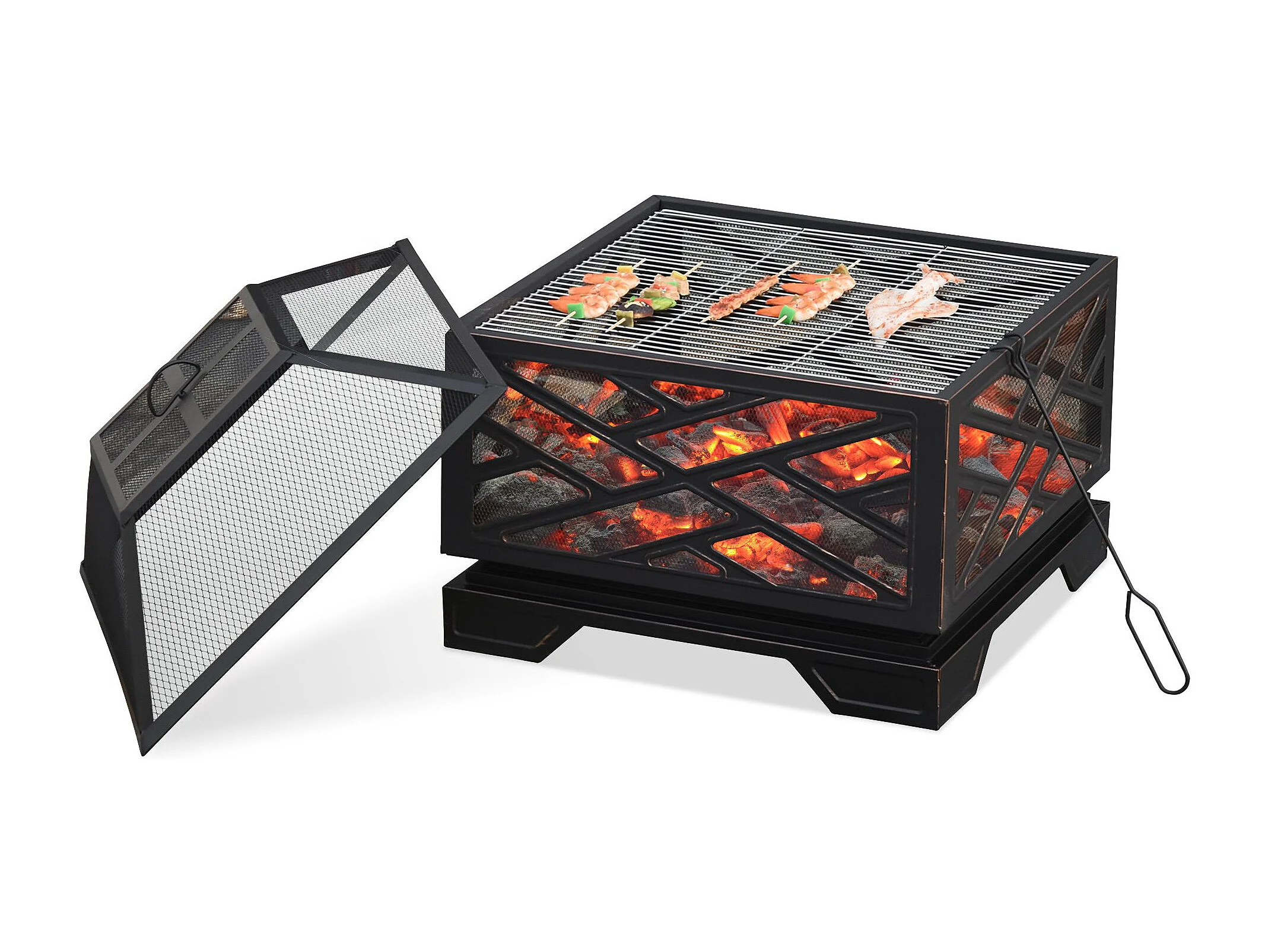 Brasero avec pare-étincelles, grille de cuisson et crochet, métal noir (66x66x66cm)