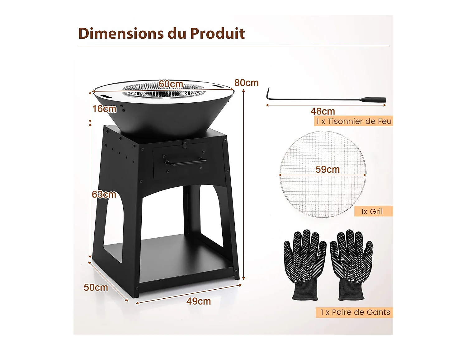 Brasero Foyer de Terrasse avec Rangement, Bol de Feu à Bois avec Grille et Boîte à Cendres Etagère, Tisonnier et Gants, Foyer Multifonctionnel pour Barbecue