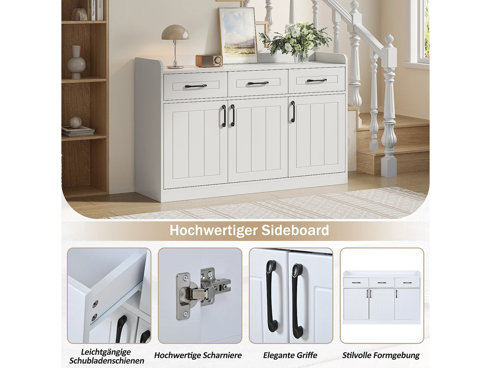 Buffet 120x35x80 cm - 3 tiroirs, 3 portes - Poignées et étagères réglables - Panneaux de particules - Blanc