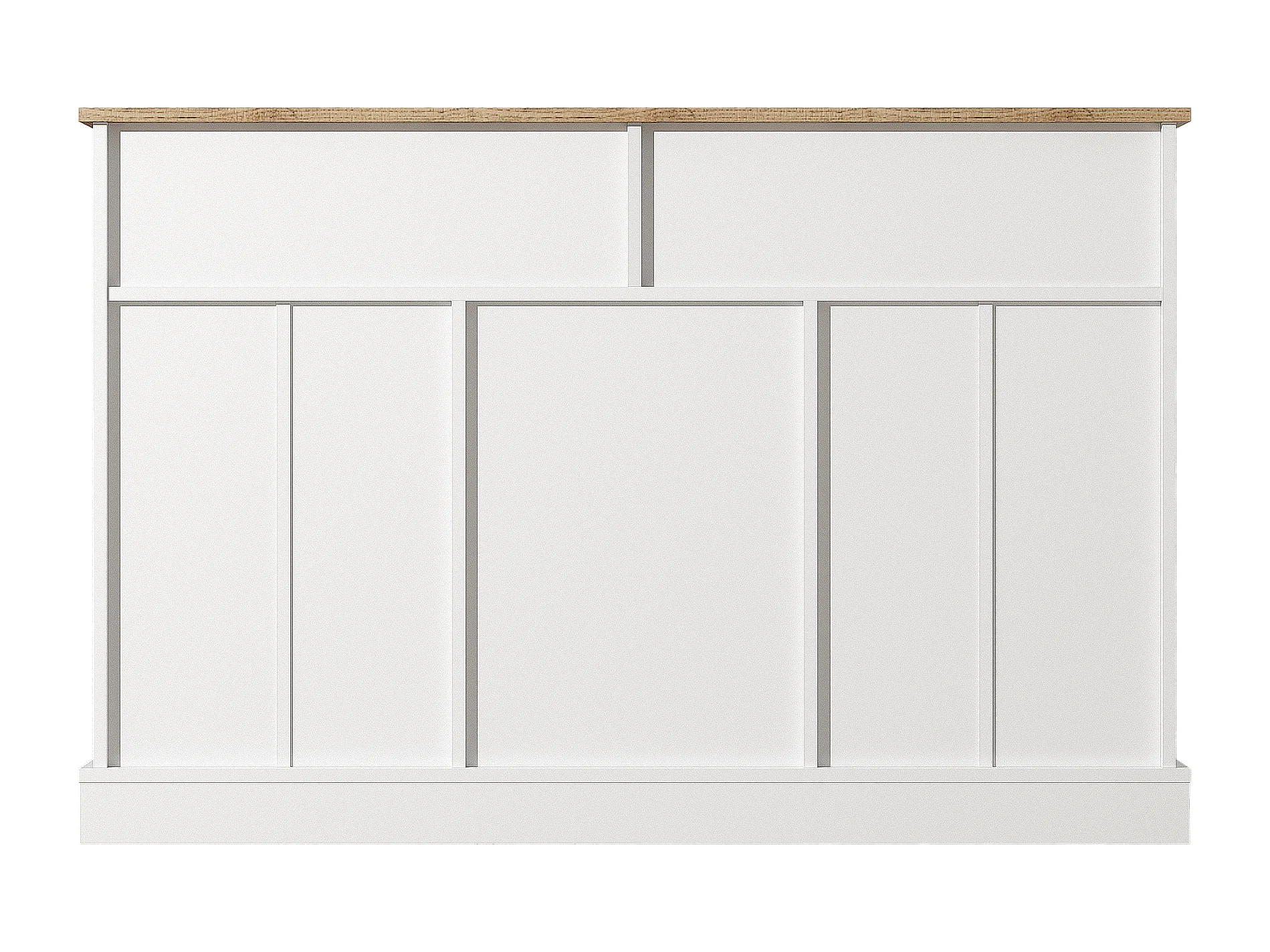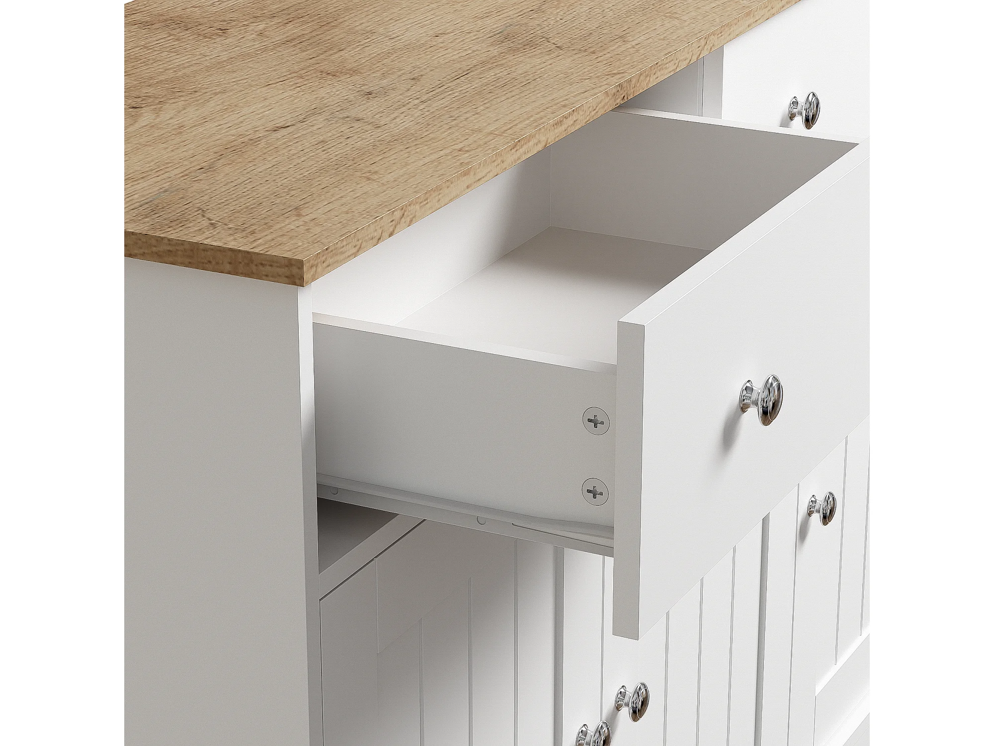 Buffet 120x36x80.5 cm, 3 portes et 2 tiroirs, ouverture push to open, charnières amorties, panneaux de particules, blanc