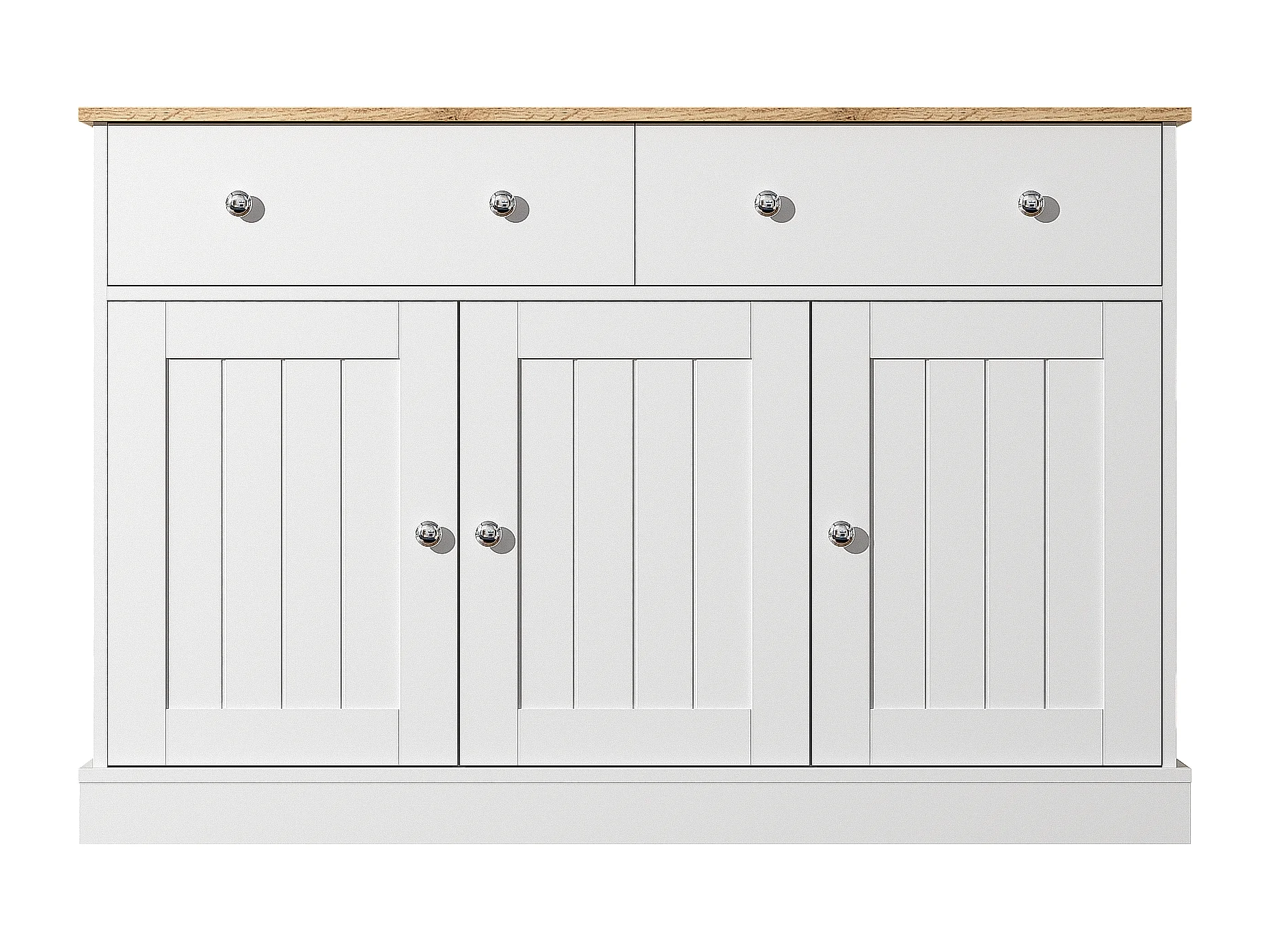 Buffet 120x36x80.5cm avec 2 tiroirs et 3 portes, plateau en woodgrain naturel clair, corps blanc avec poigneés argenté