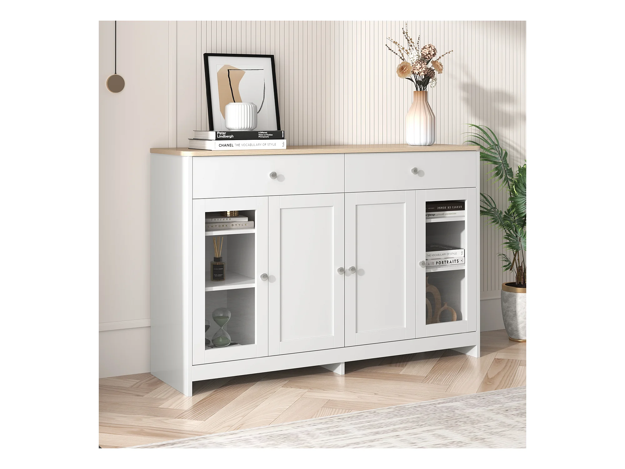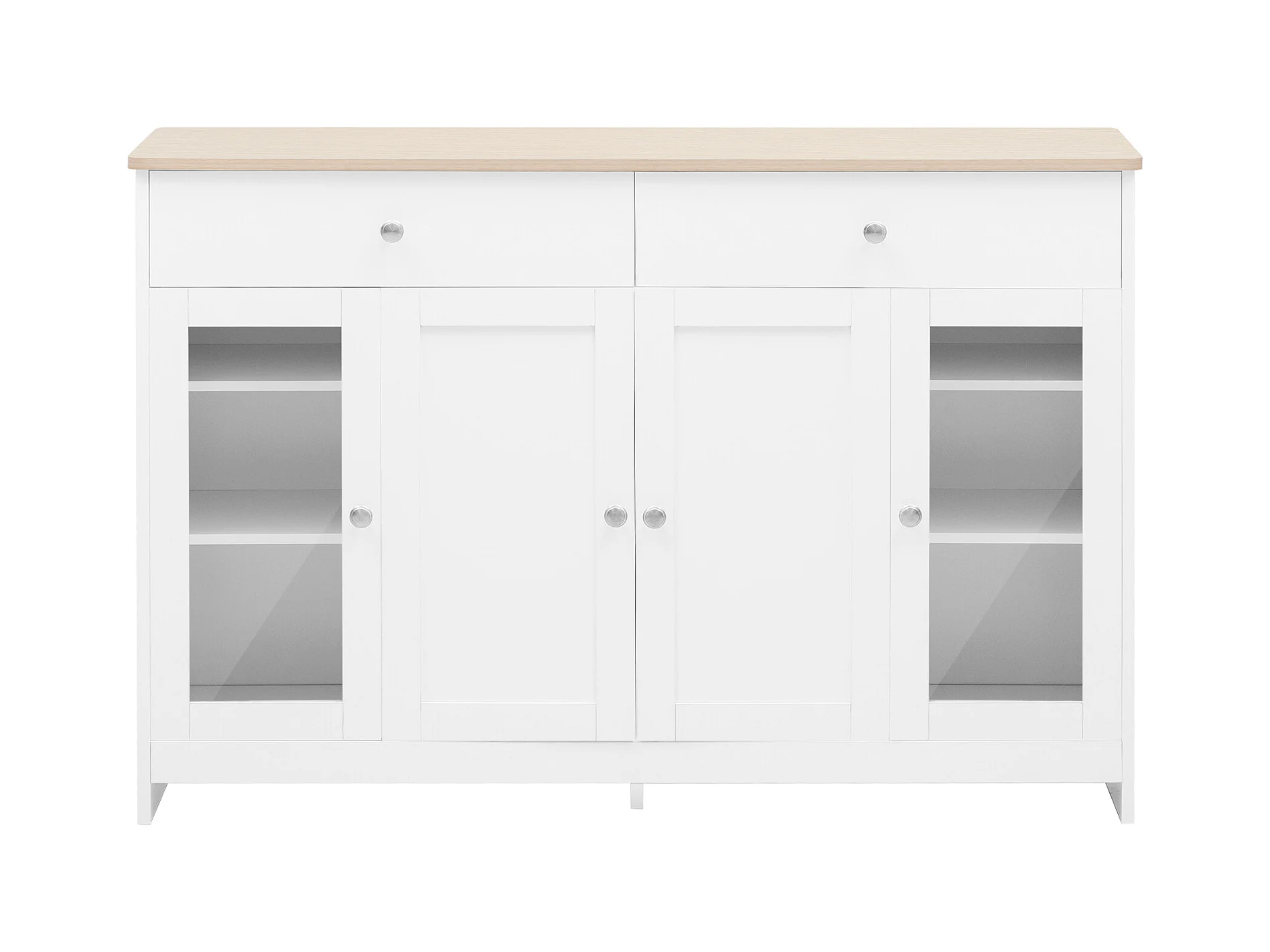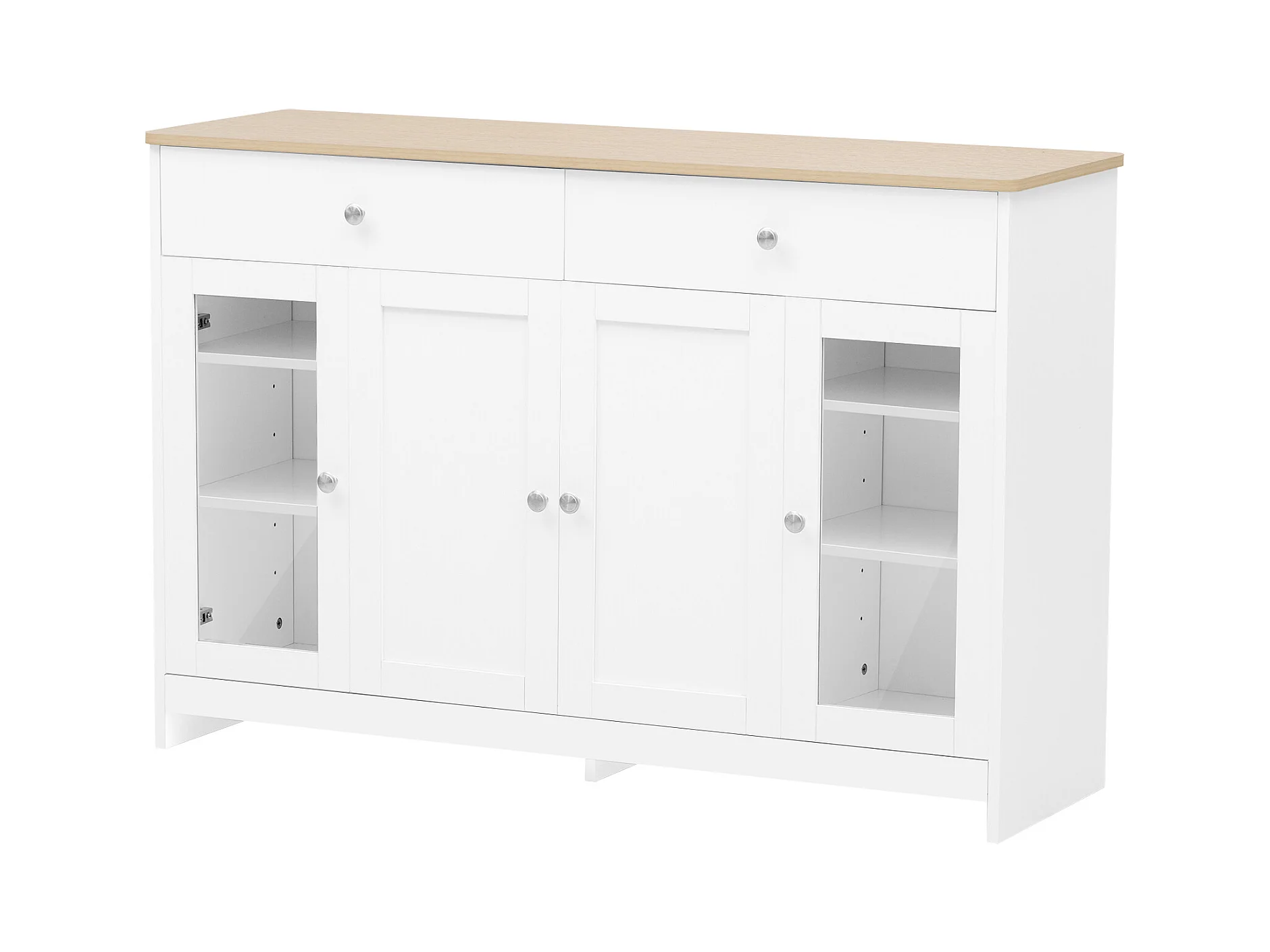Buffet 120x36x80.5cm avec 2 tiroirs et 3 portes, plateau en woodgrain naturel clair, corps blanc avec poigneés argenté