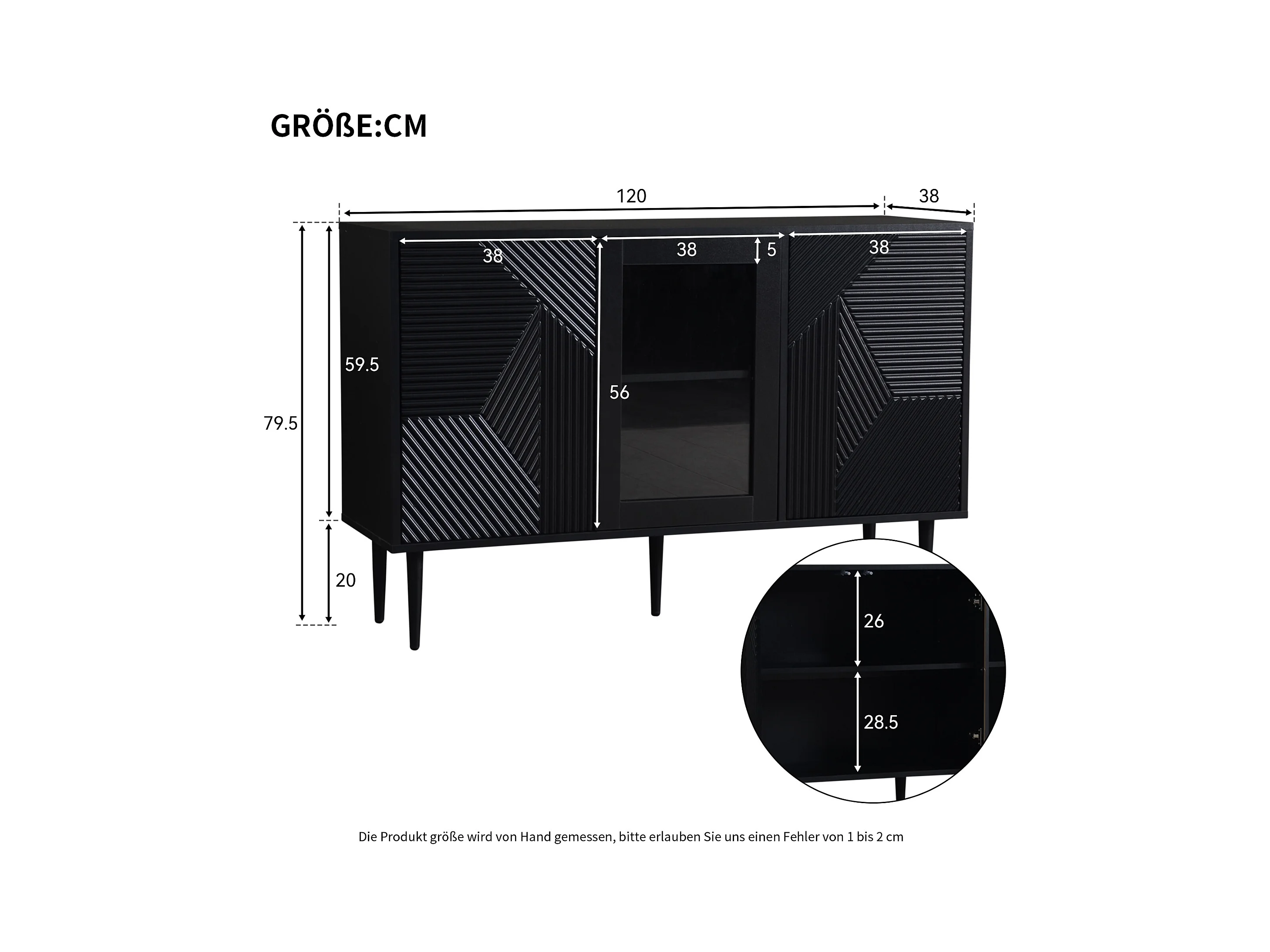 Buffet 120x38x79,5cm - avec 3 portes - avec pieds en métal + portes vitrées - noir