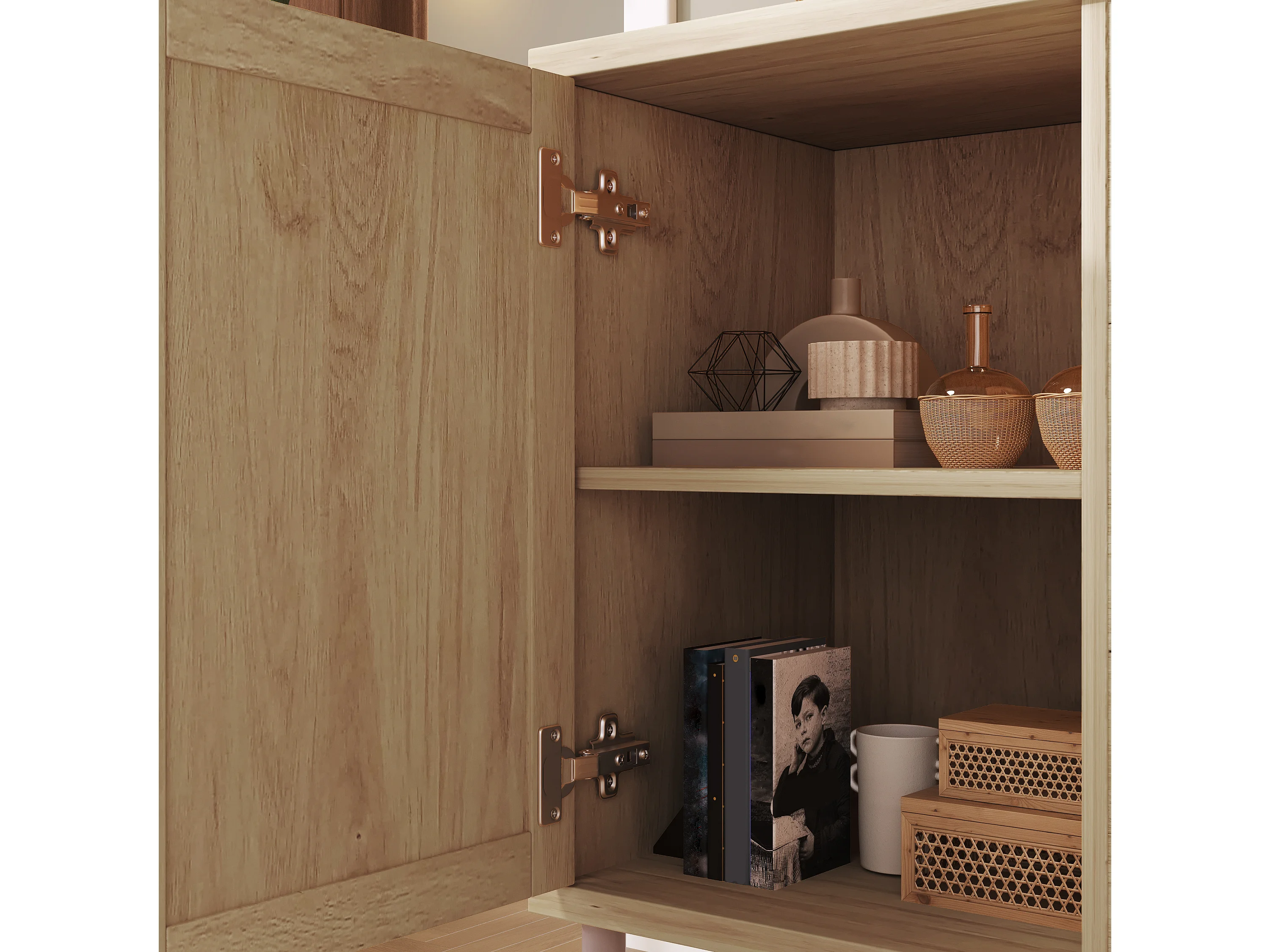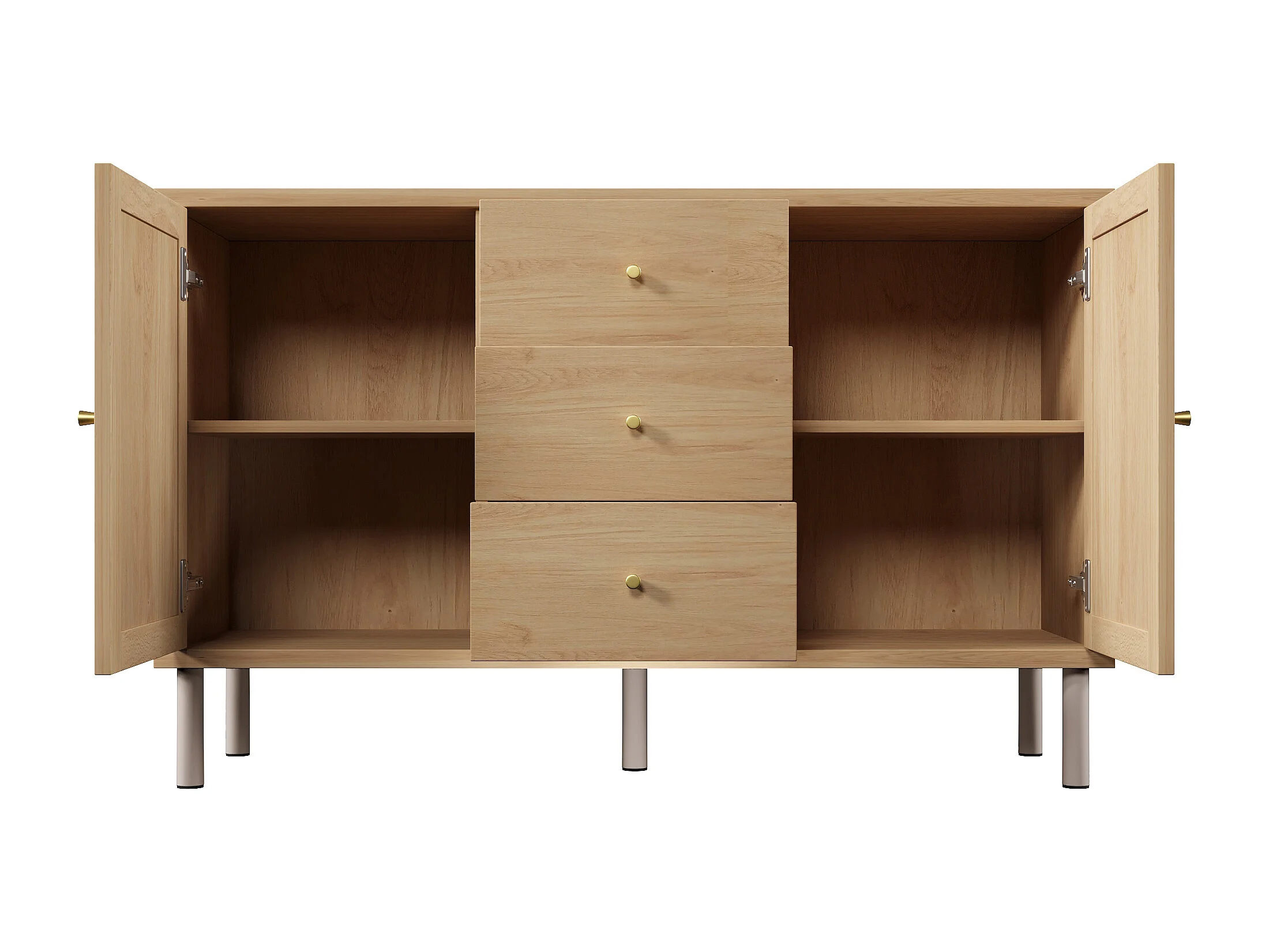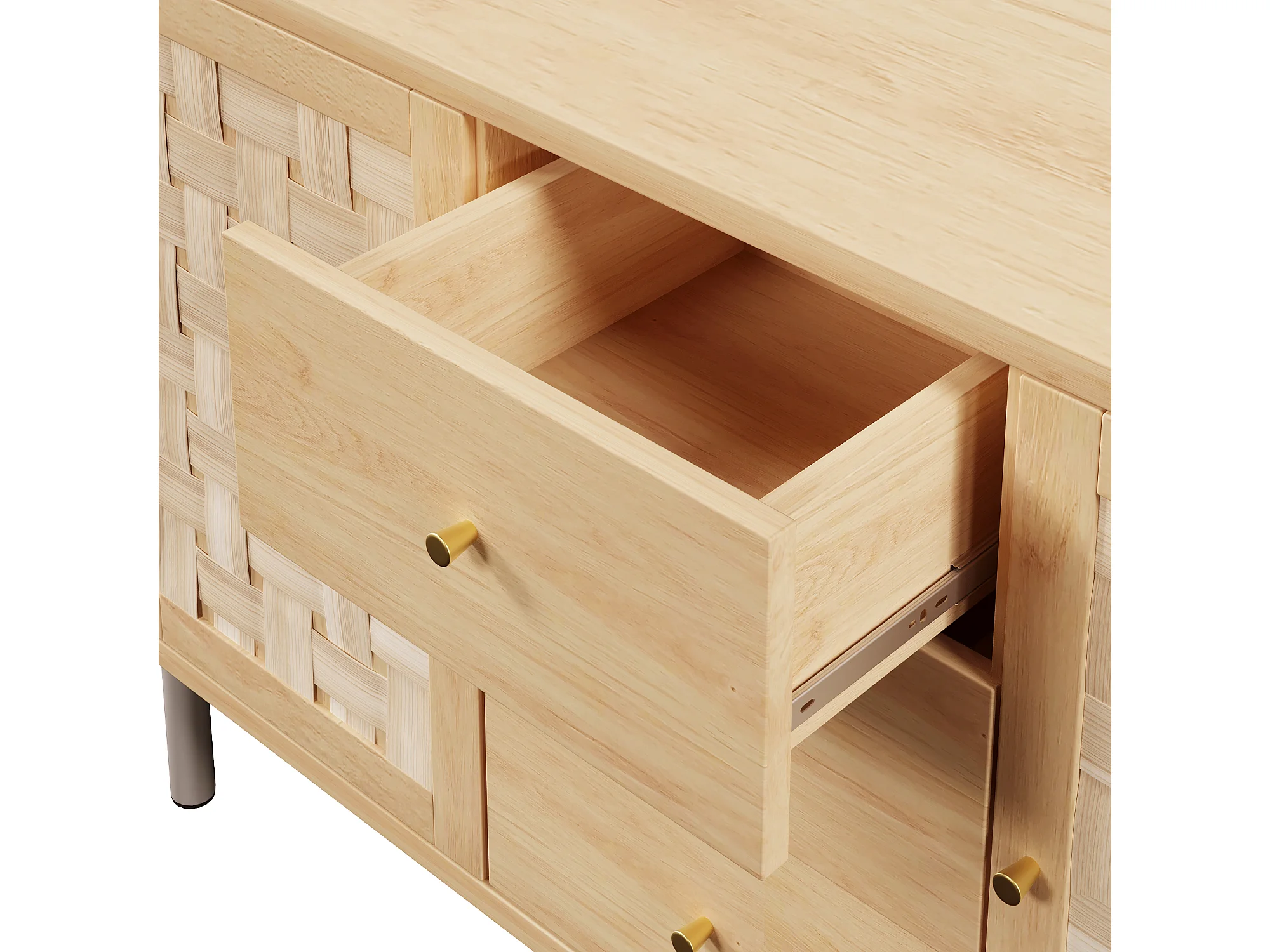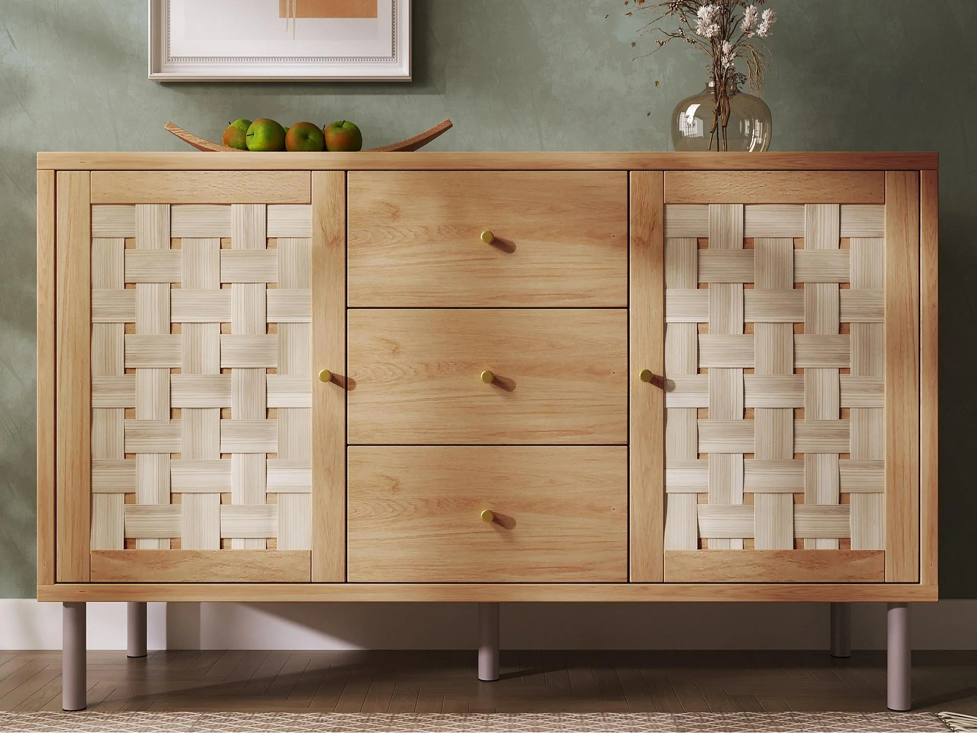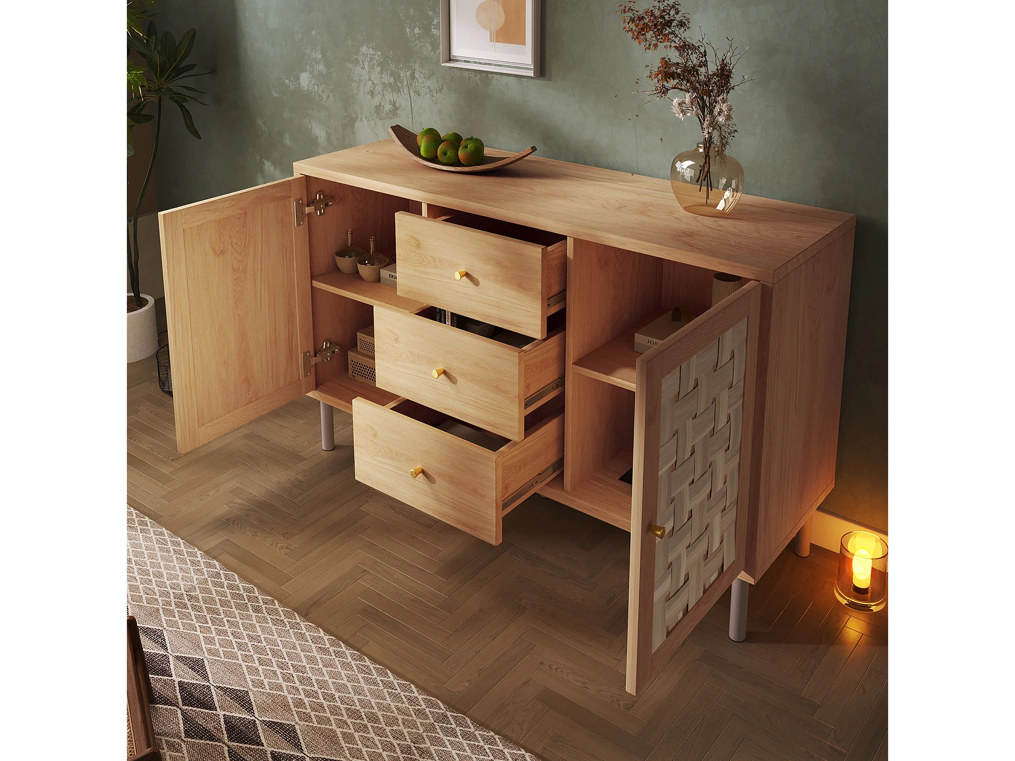 Buffet 120x40x70cm - avec 3 tiroirs et 2 portes - aspect rotin - style campagnard - avec des étagères réglables - couleur chêne