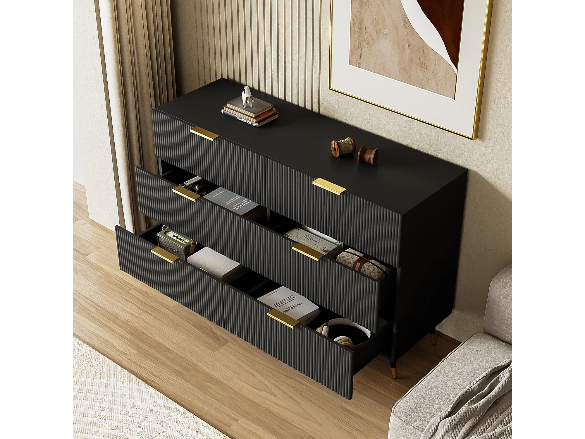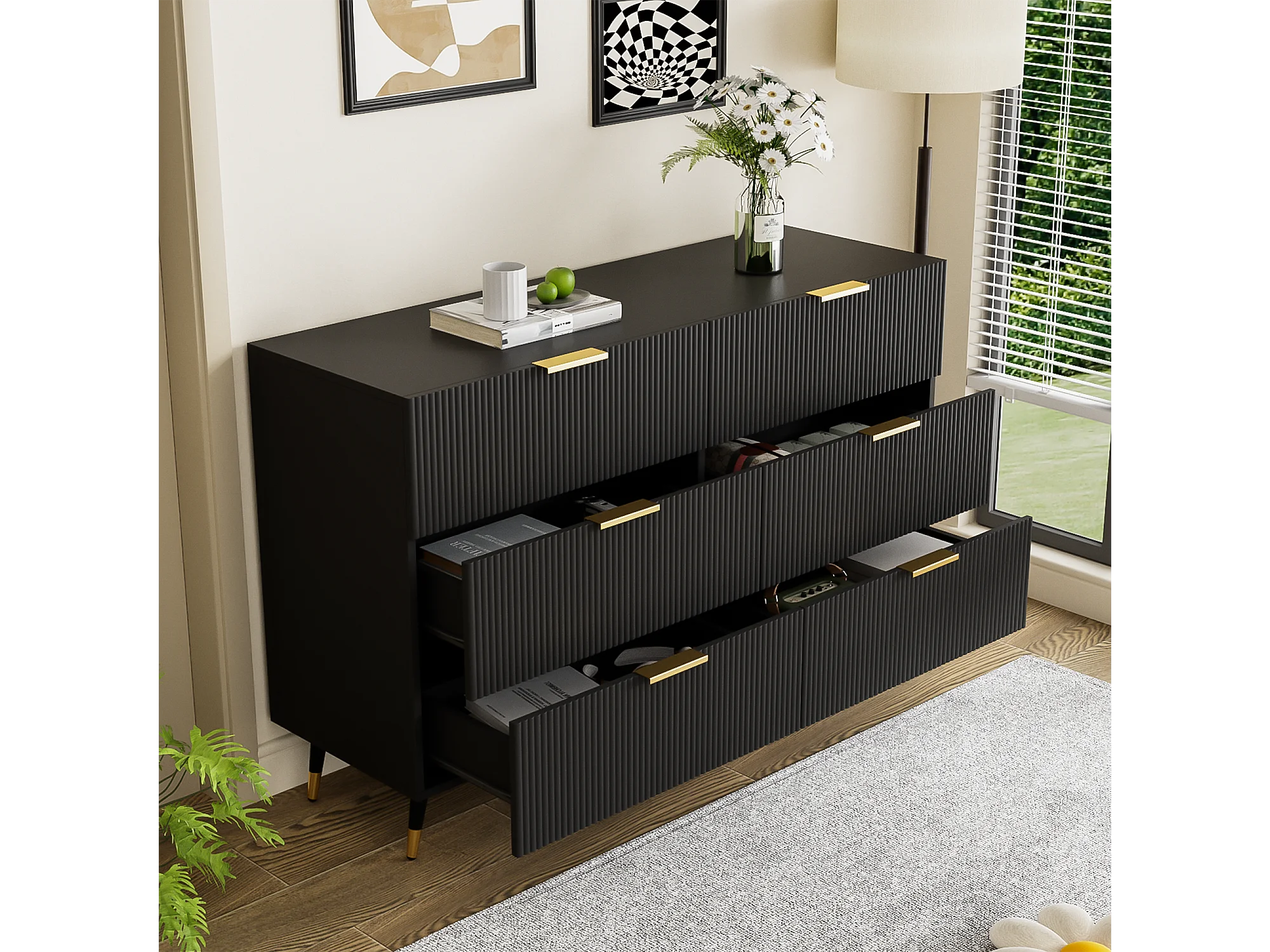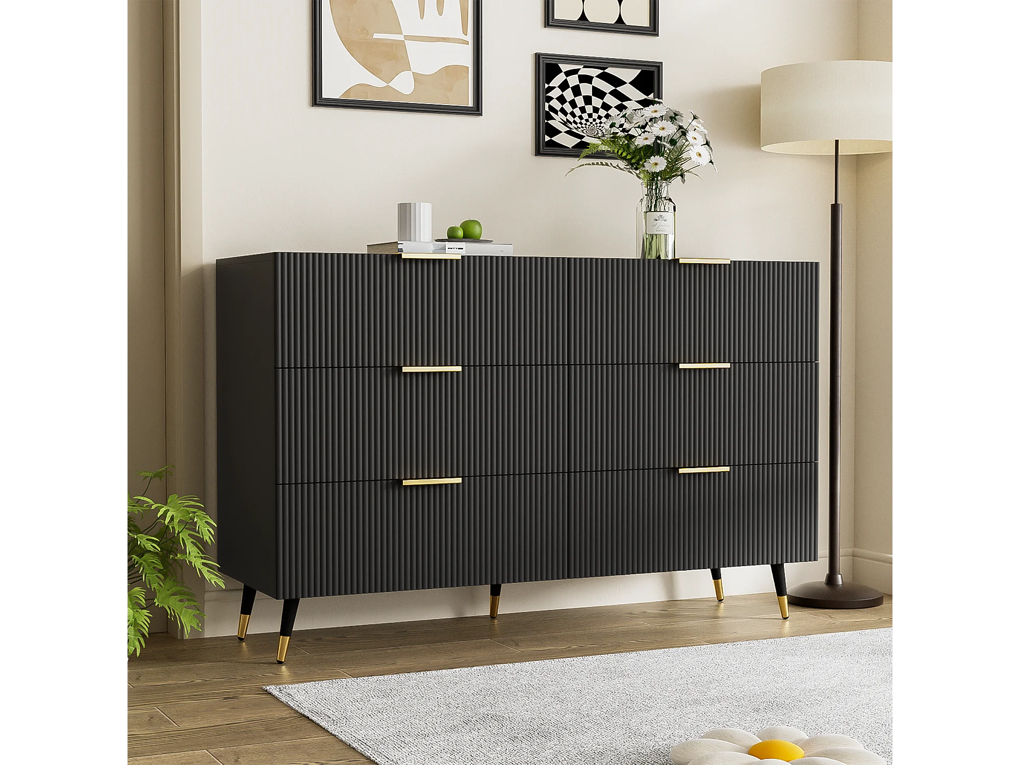 Buffet 120x40x77cm avec 6 tiroirs, pieds et poignées dorées, corps noir