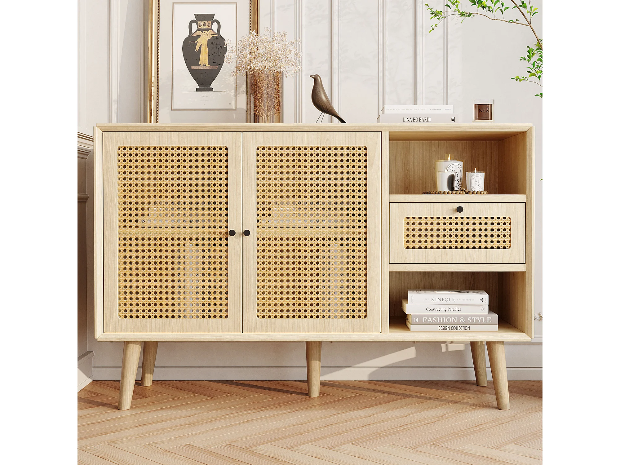 Buffet 120x40x80 cm, 1 tiroir, 2 portes magnétiques, étagères réglables, MDF, chêne
