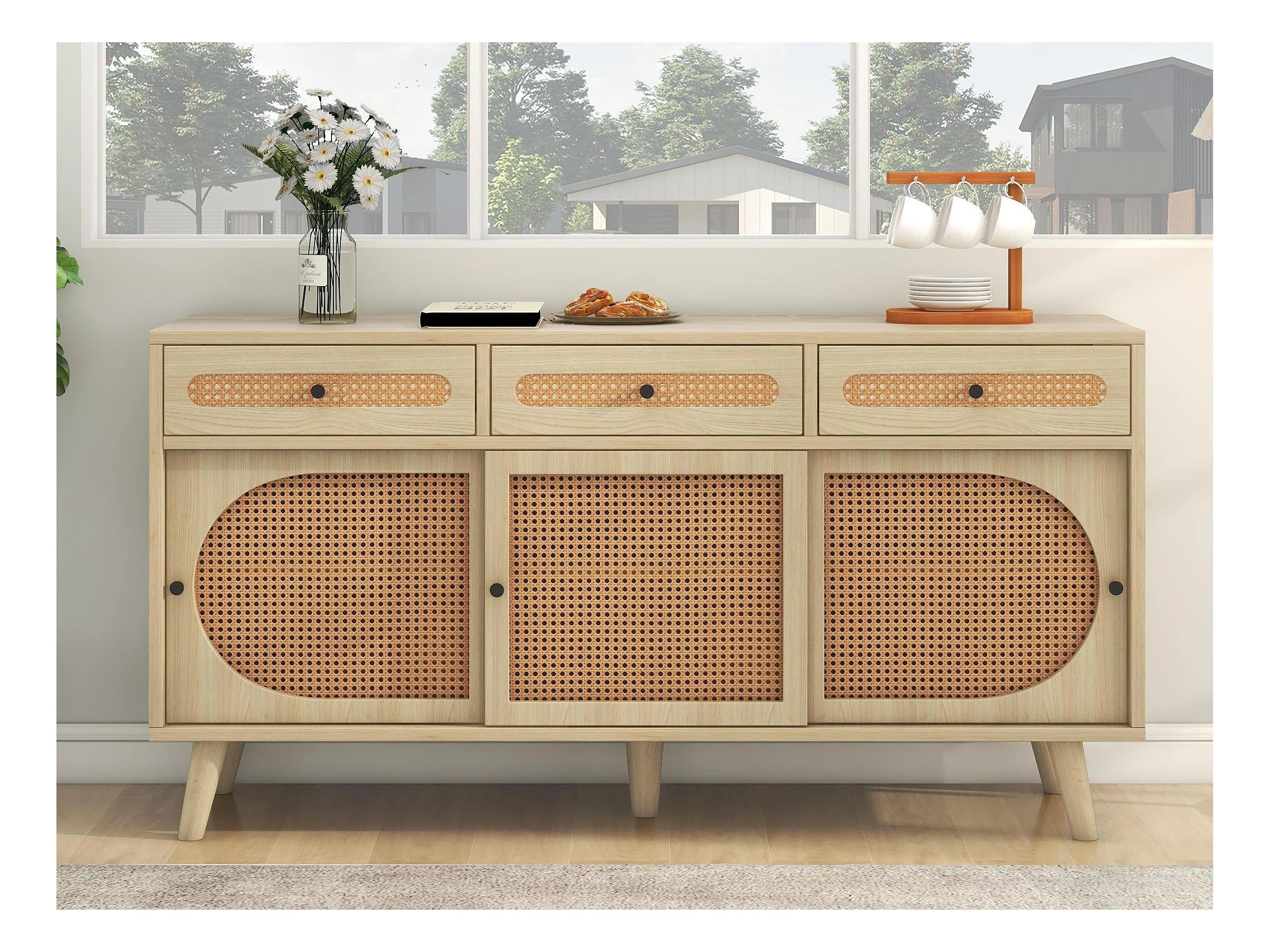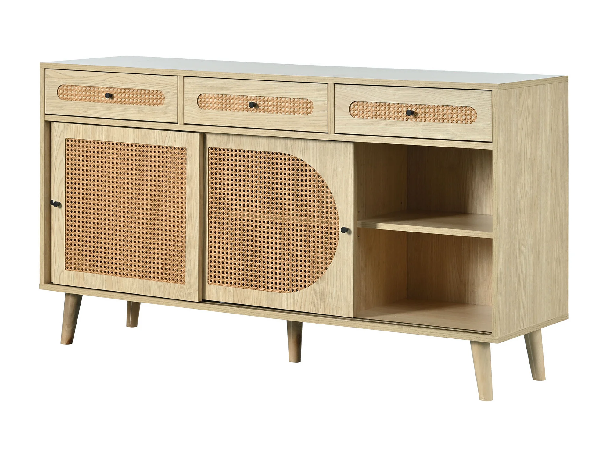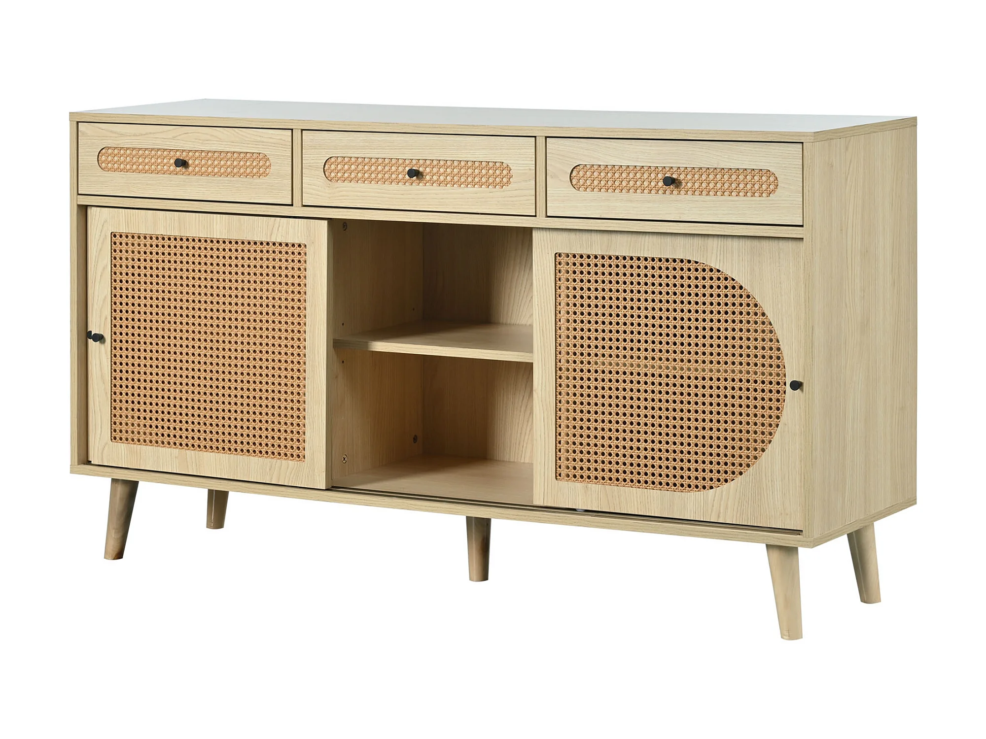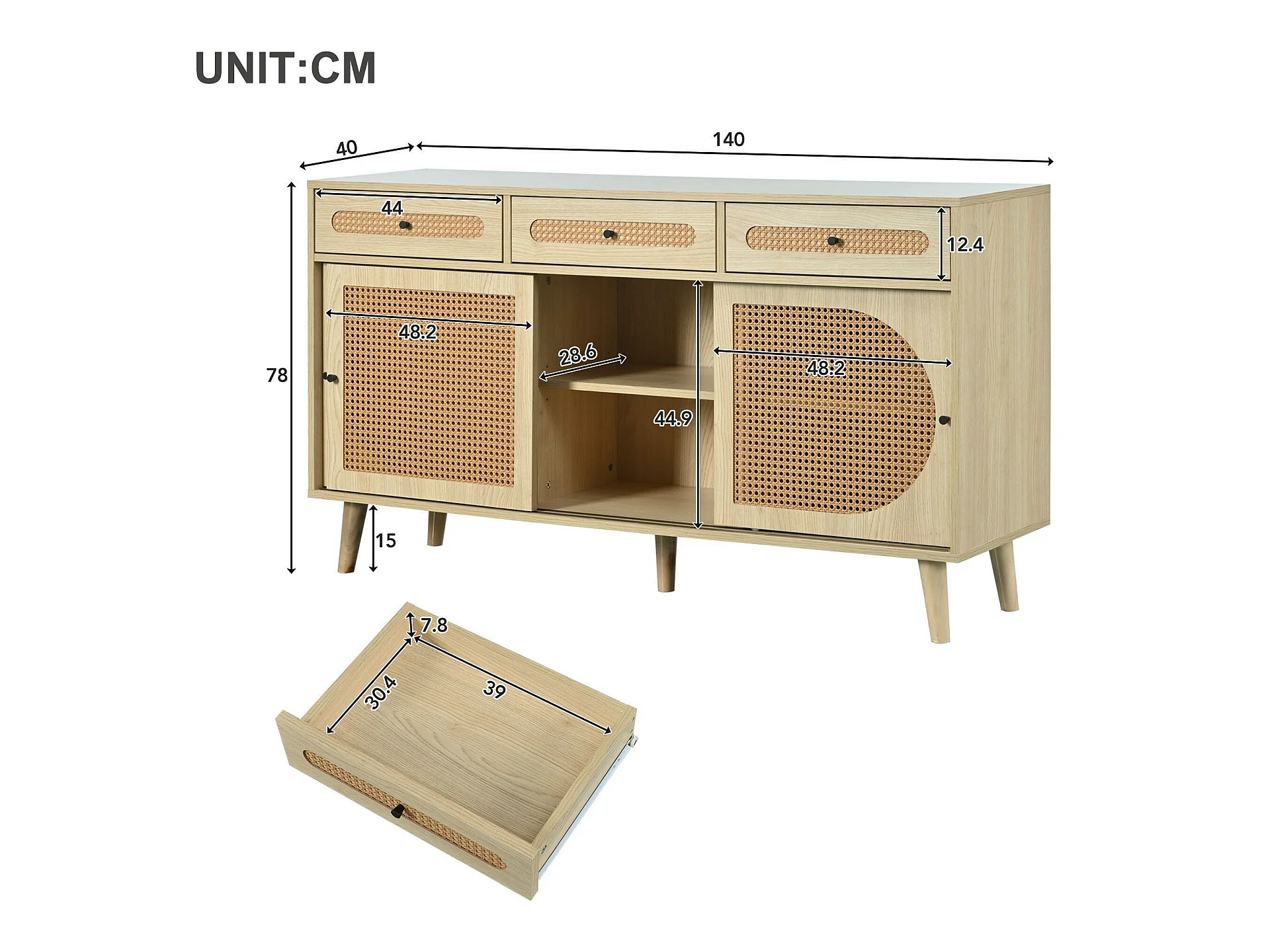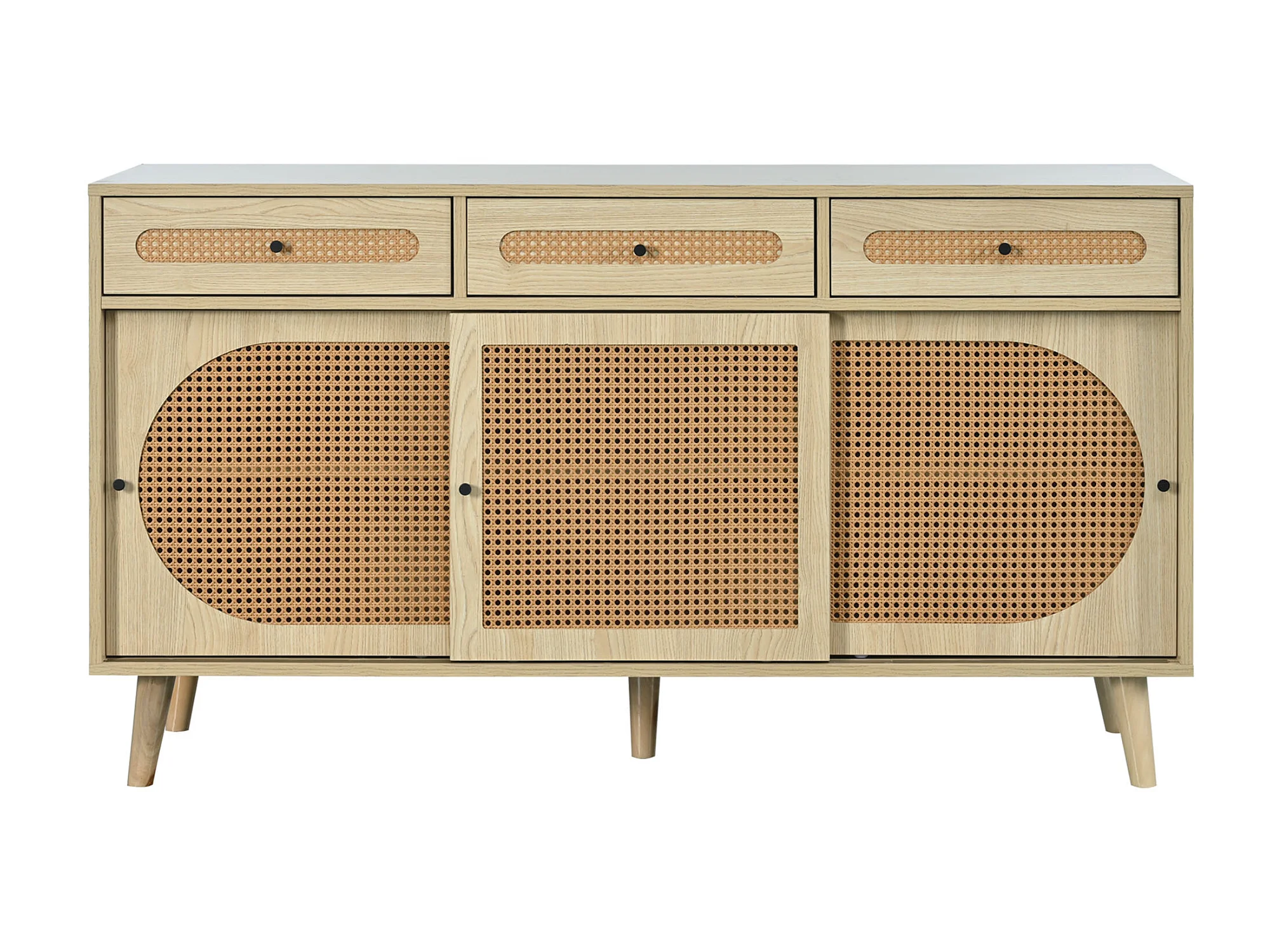 Buffet 140cm avec 3 portes coulissantes en rotin et 3 tiroirs - étagères internes réglables - Naturel