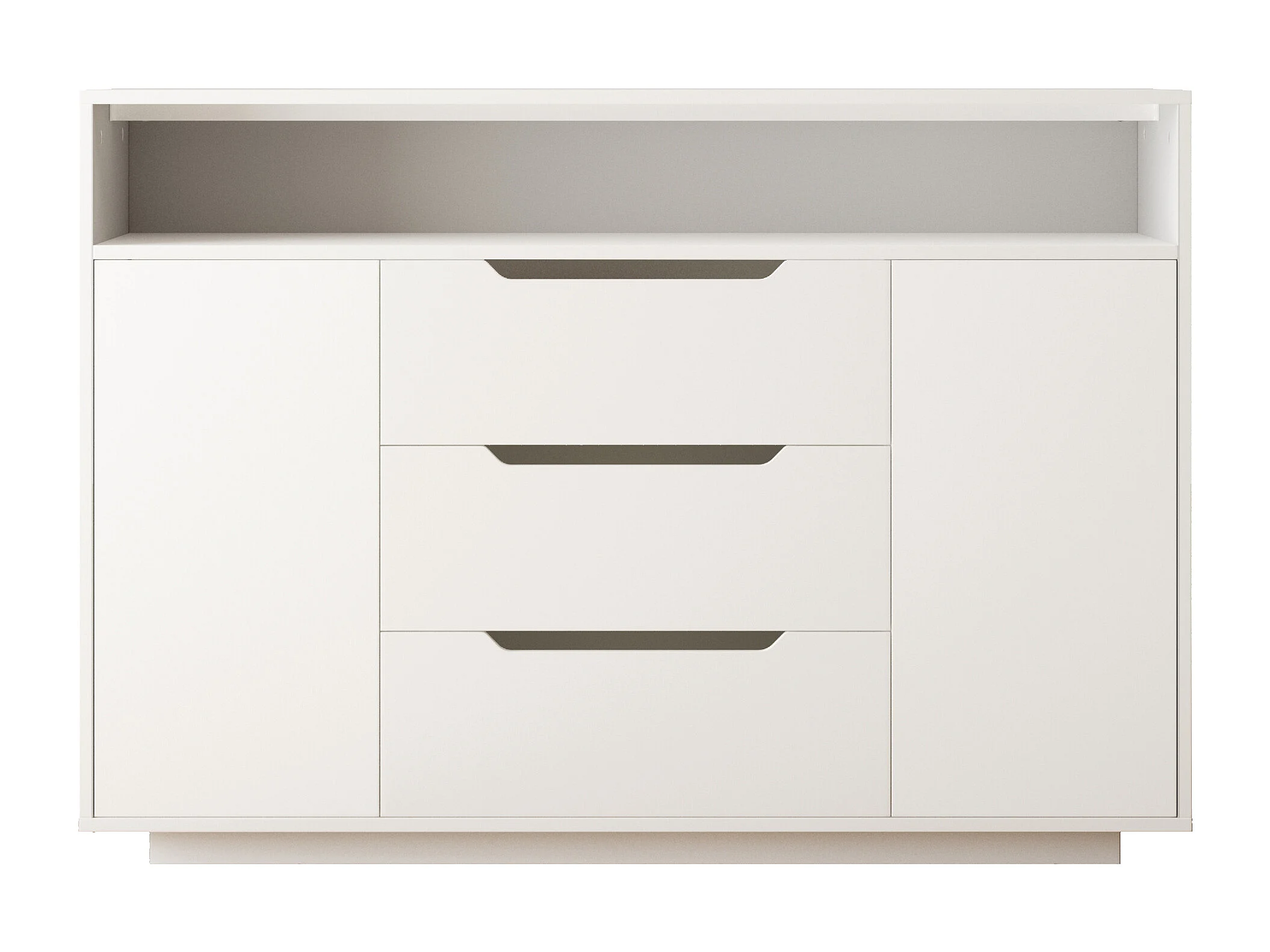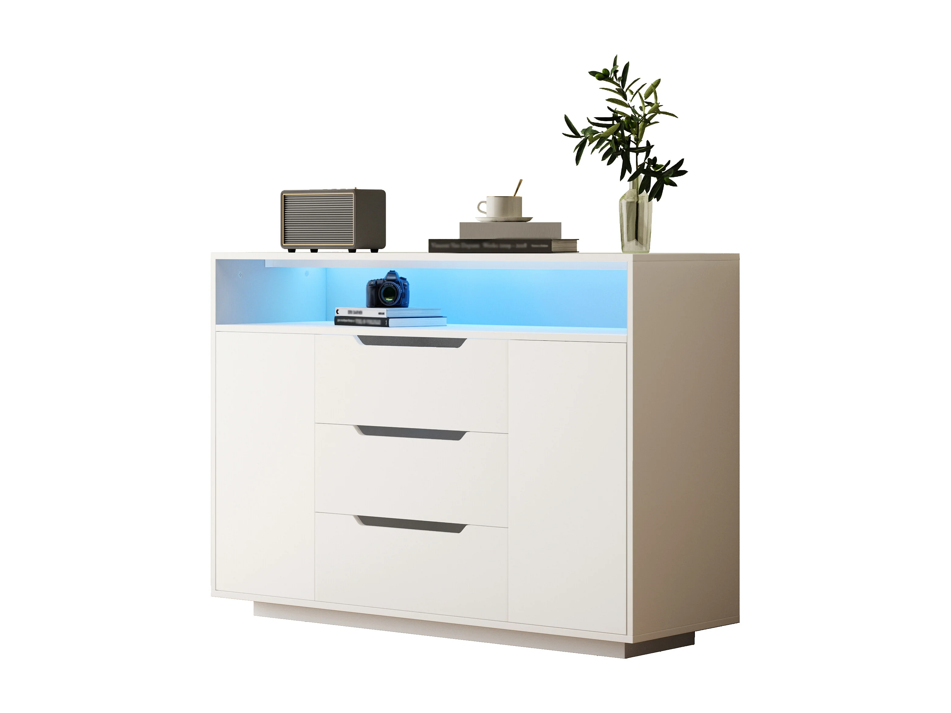 Buffet 120x40x85cm avec LED etagères ouvertes trois tiroirs et portes d'armoire latérales en blanc pour salon et salle à manger ou bureau