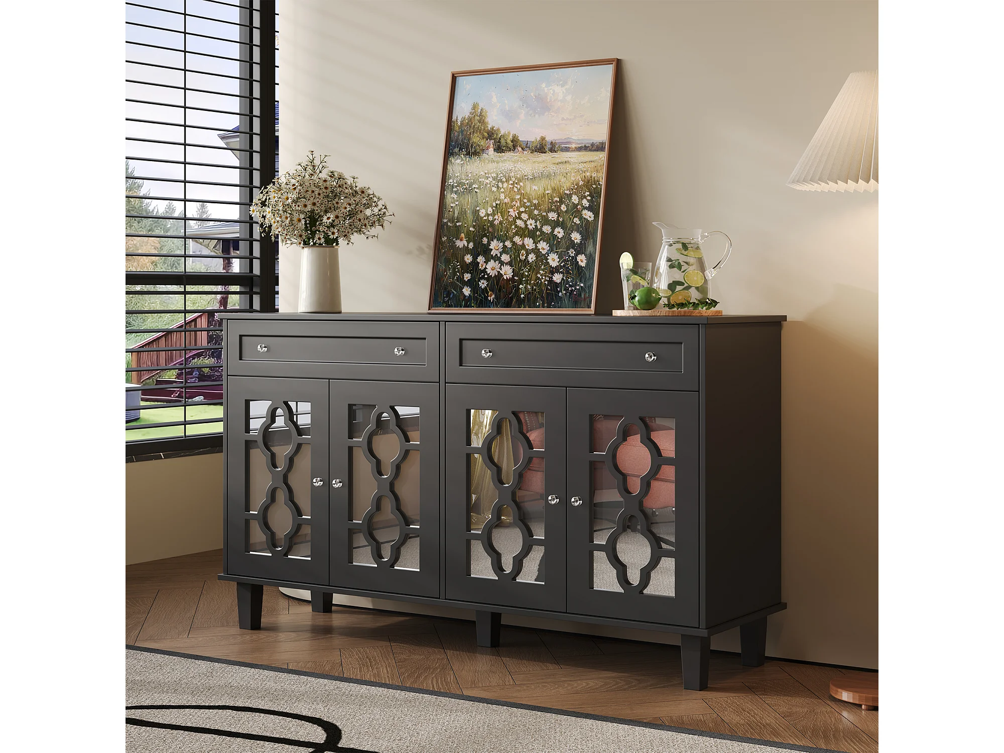Buffet 140x40x83cm - avec 4 portes miroir et 2 tiroirs - étagères réglables et poignées en cristal - Noir