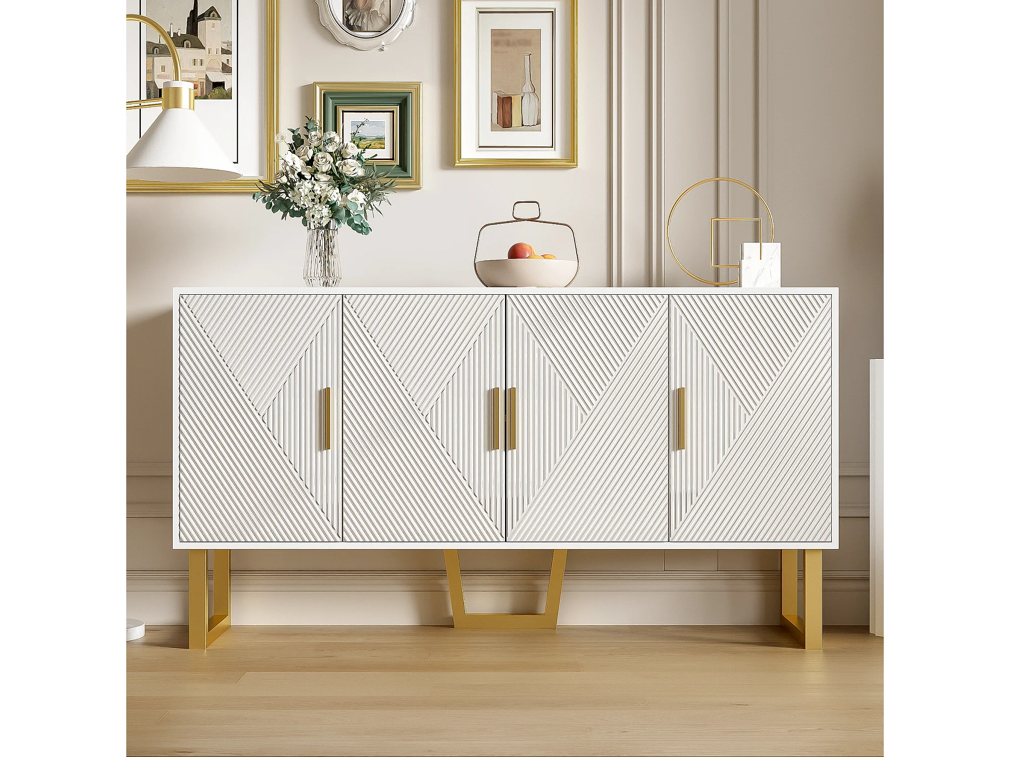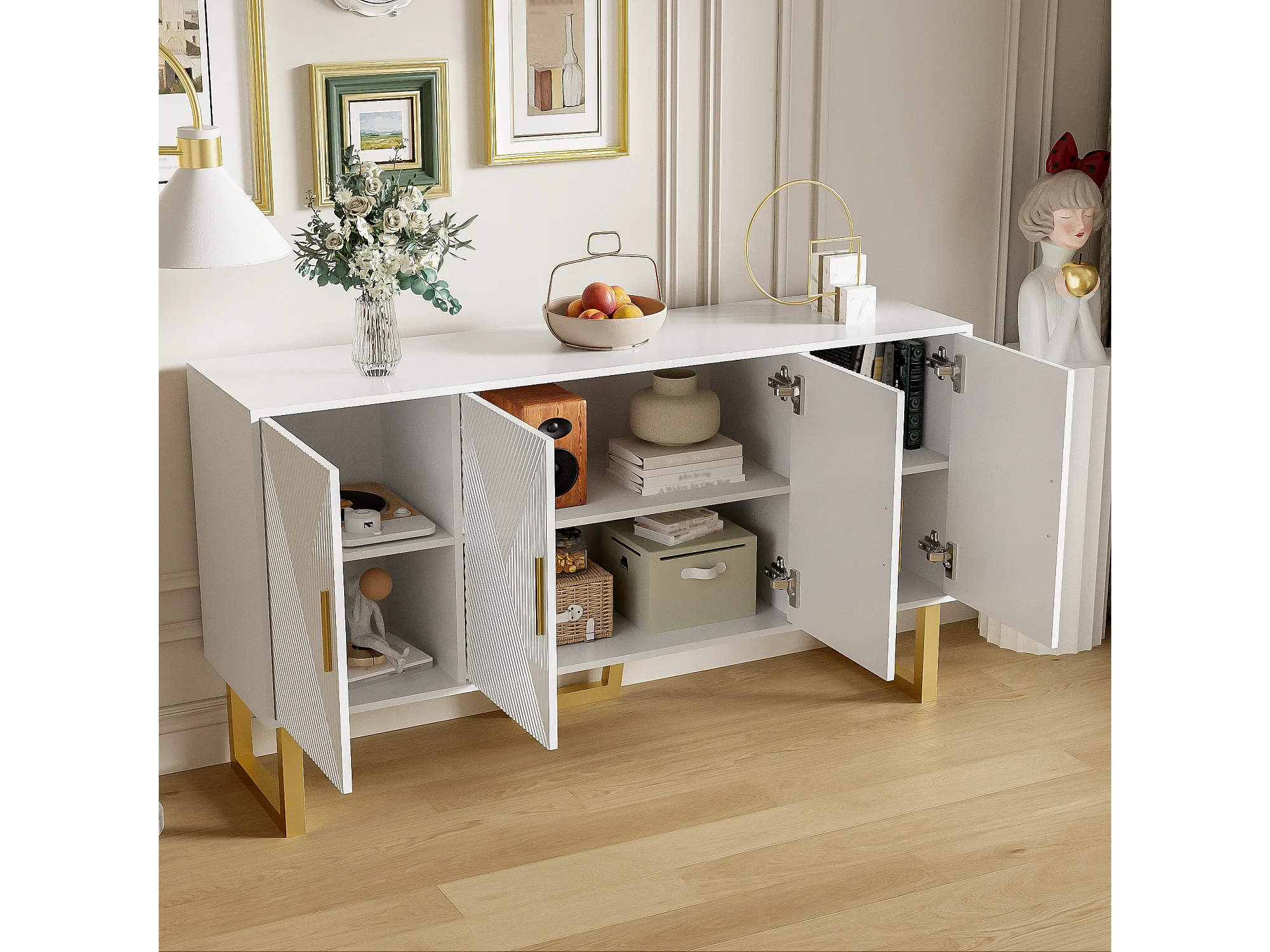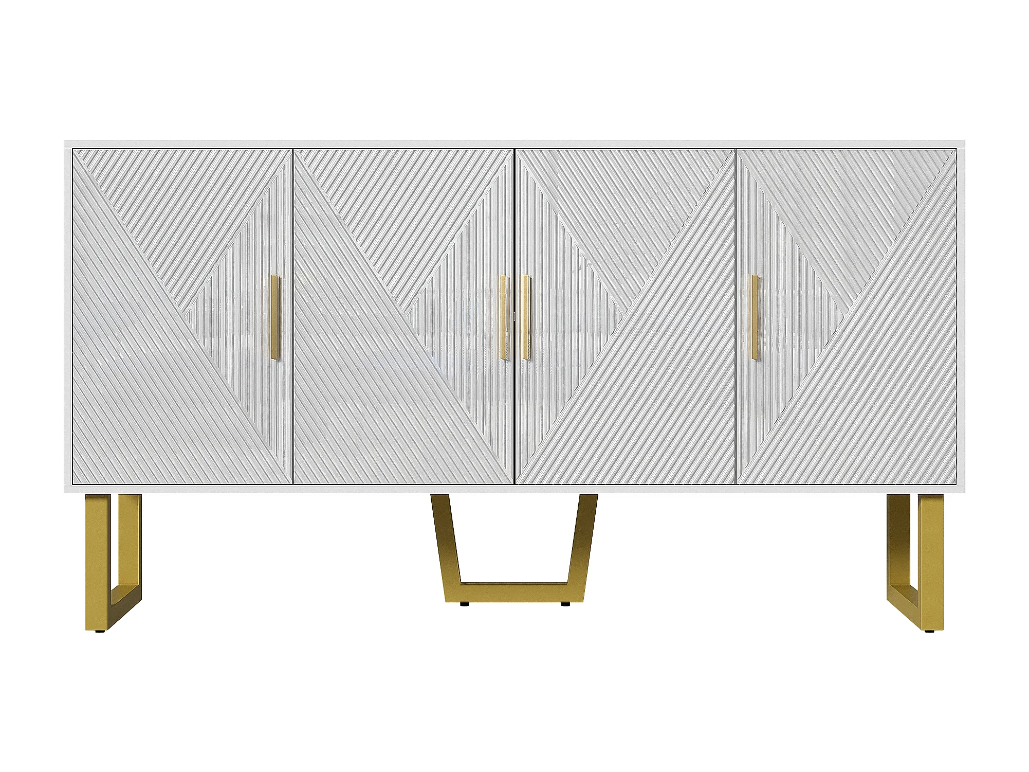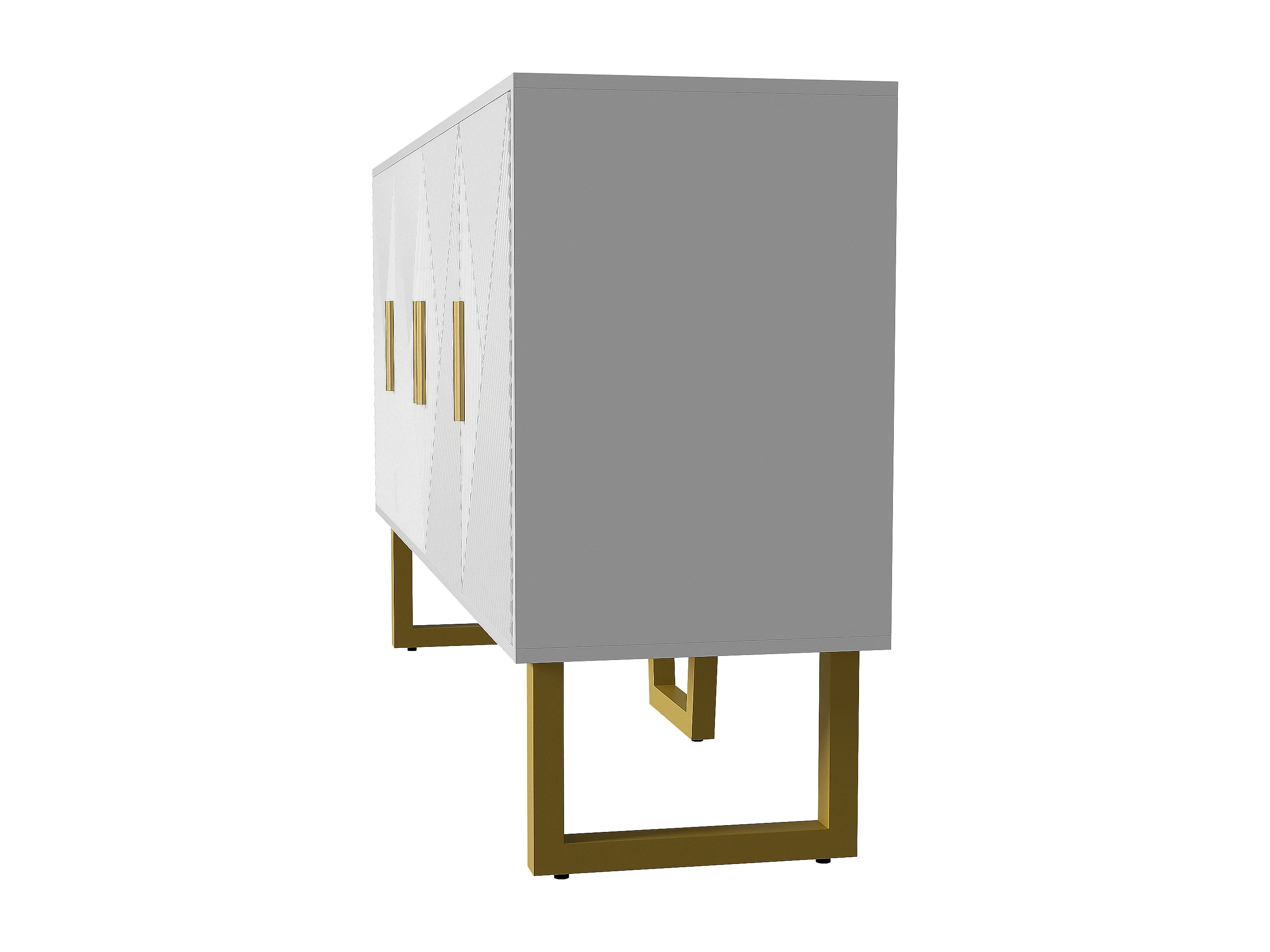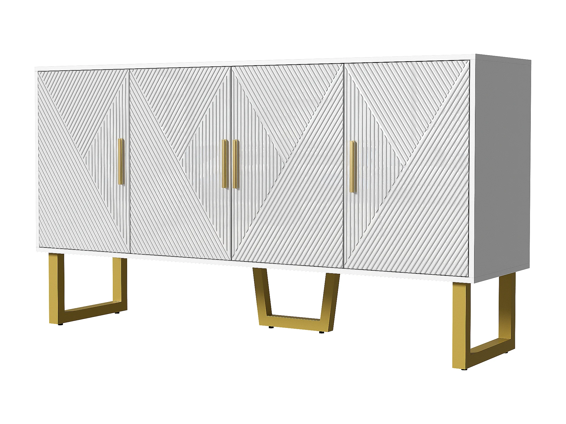 Buffet 150x40x82 cm, 4 portes, étagères réglables, finition brillante texturée, MDF et panneaux de particules blanc
