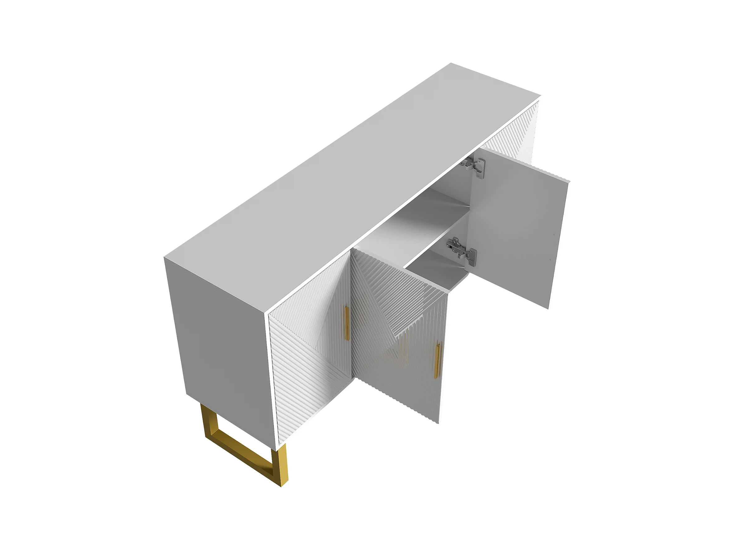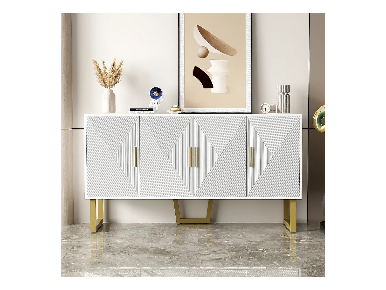 Buffet 140x40x80cm - armoire avec 4 portes, pieds en métal, brillant, design géométrique blanc