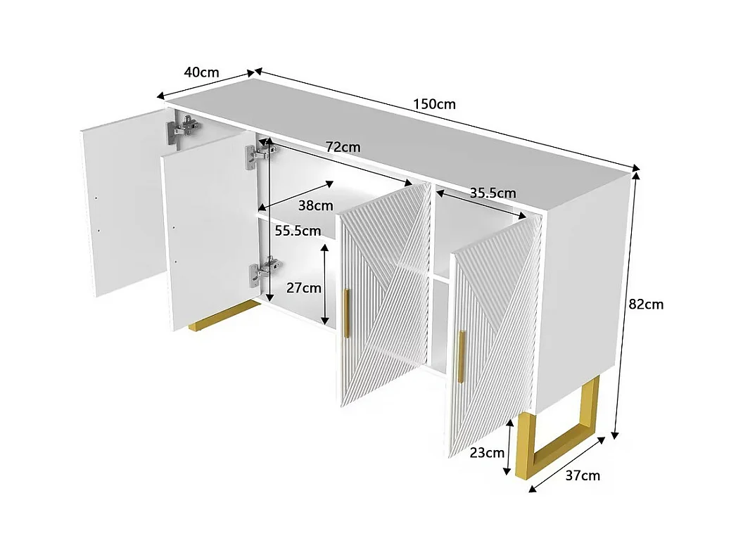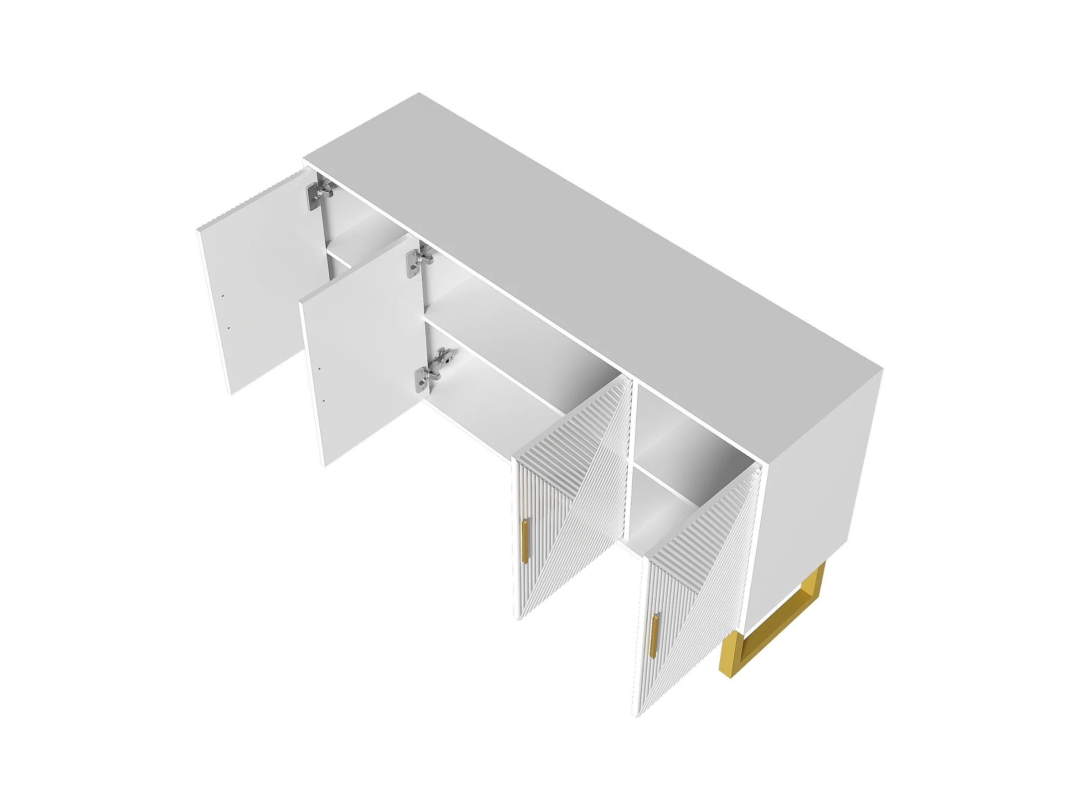 Buffet 150x40x82cm - Armoire avec 4 portes texturées brillantes et poignées dorées, étagères réglables en hauteur - Blanc