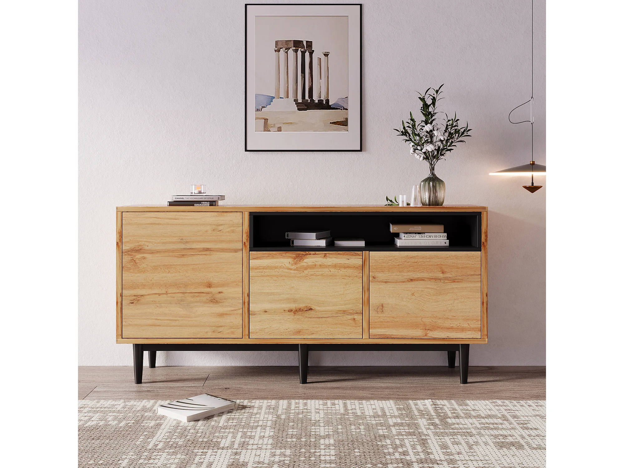 Buffet 160x35x76 cm, 3 portes, étagères réglables, montage facile, MDF, noir et bois naturel