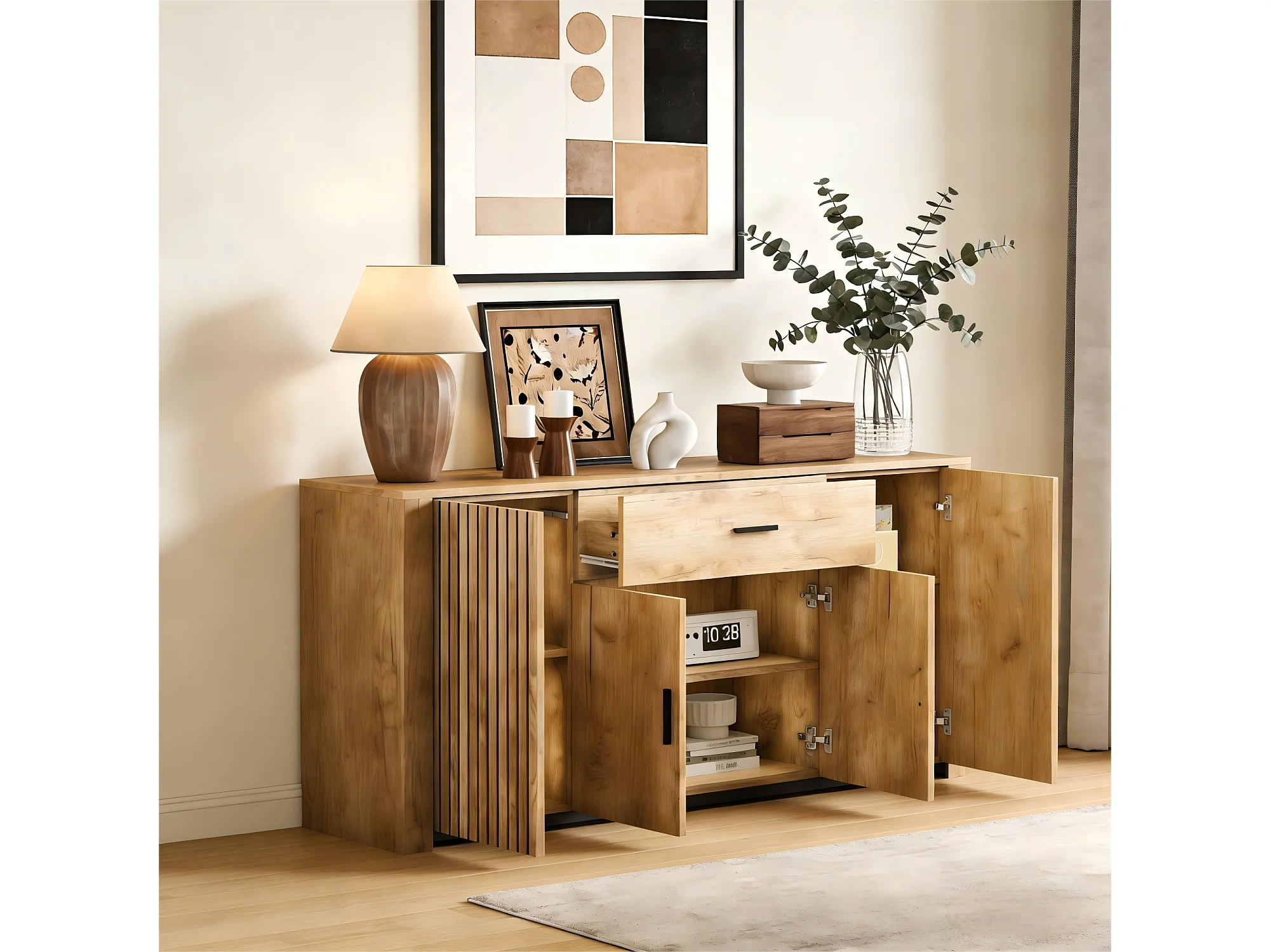 Buffet 160x40x75 cm - 4 portes et 1 tiroir - Étagères réglables - Finition bois - Panneaux de particules - Naturel