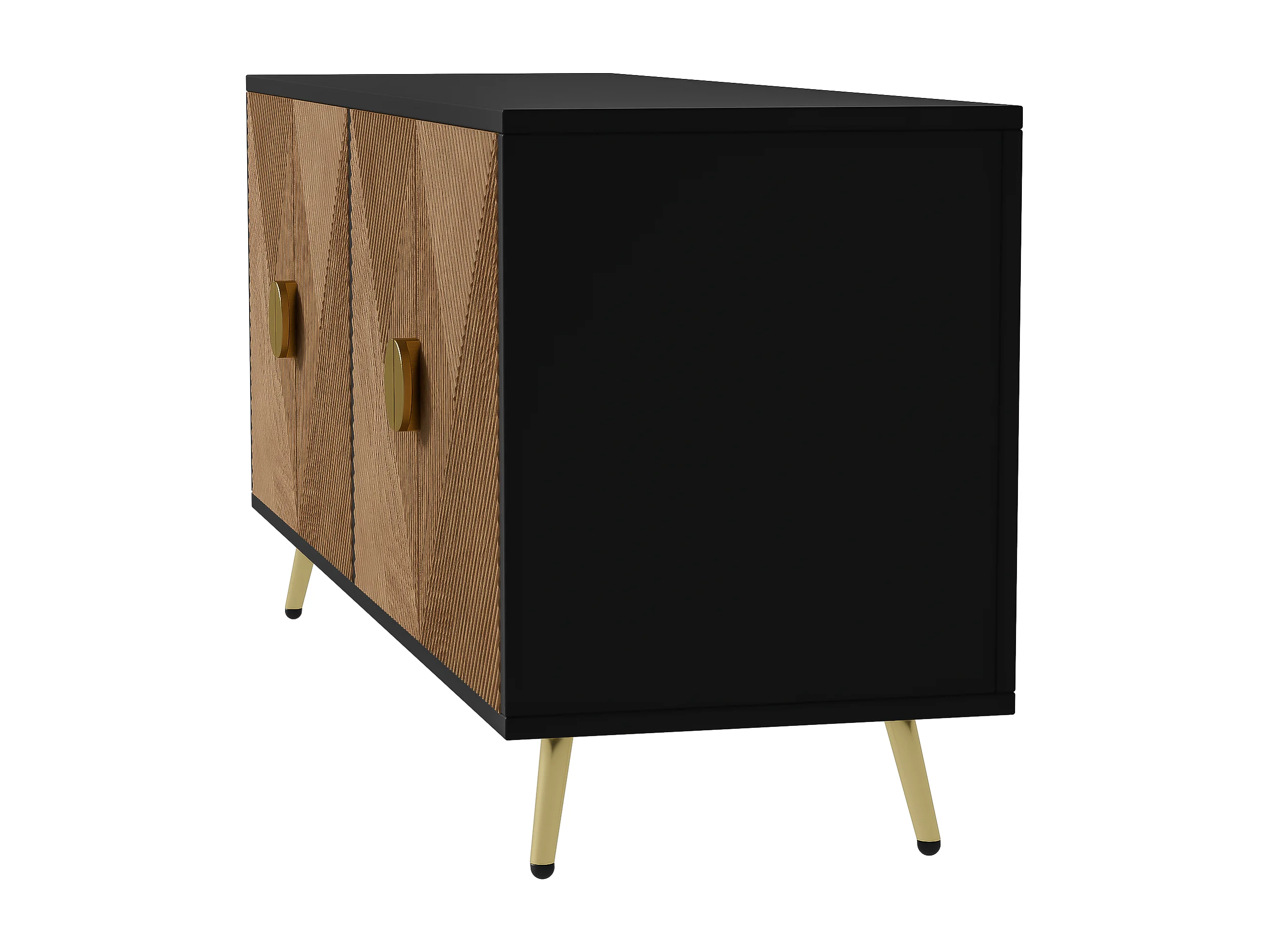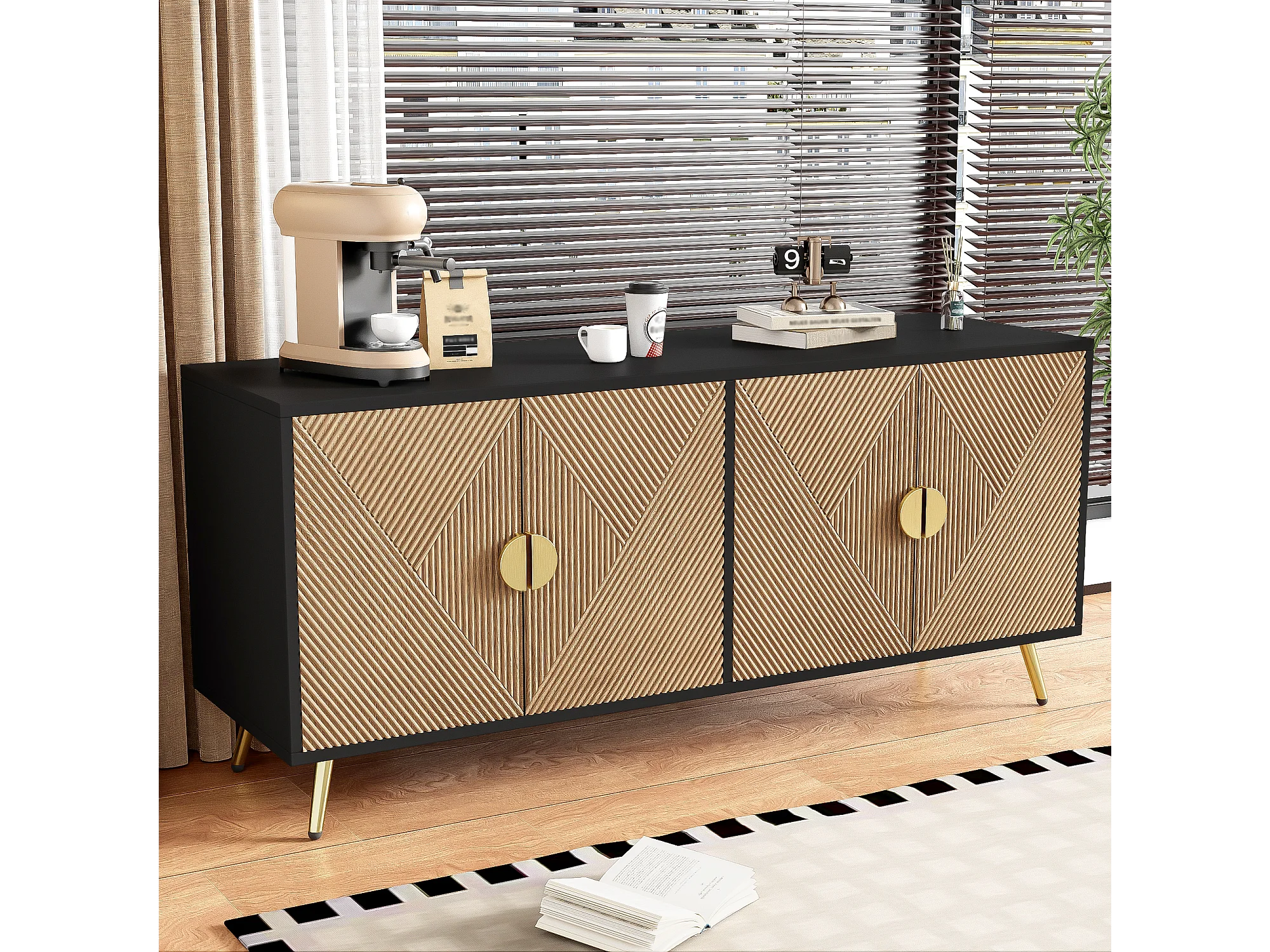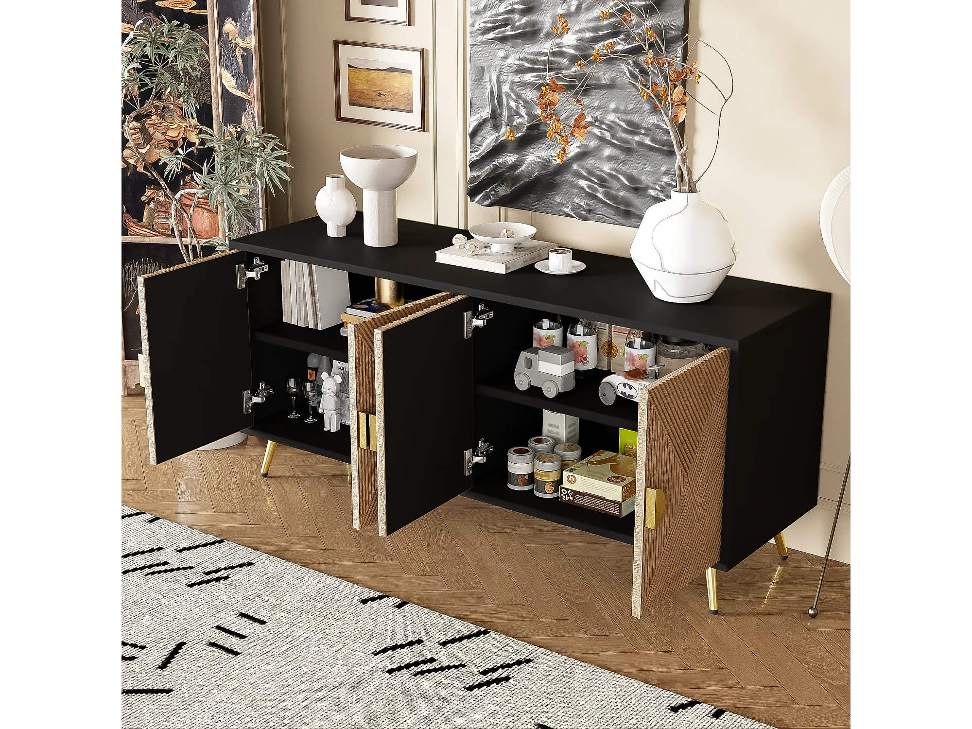 Buffet 160x40x75 cm avec casiers MDF et panneaux de particules noir et couleurs naturelles pour salon et cuisine