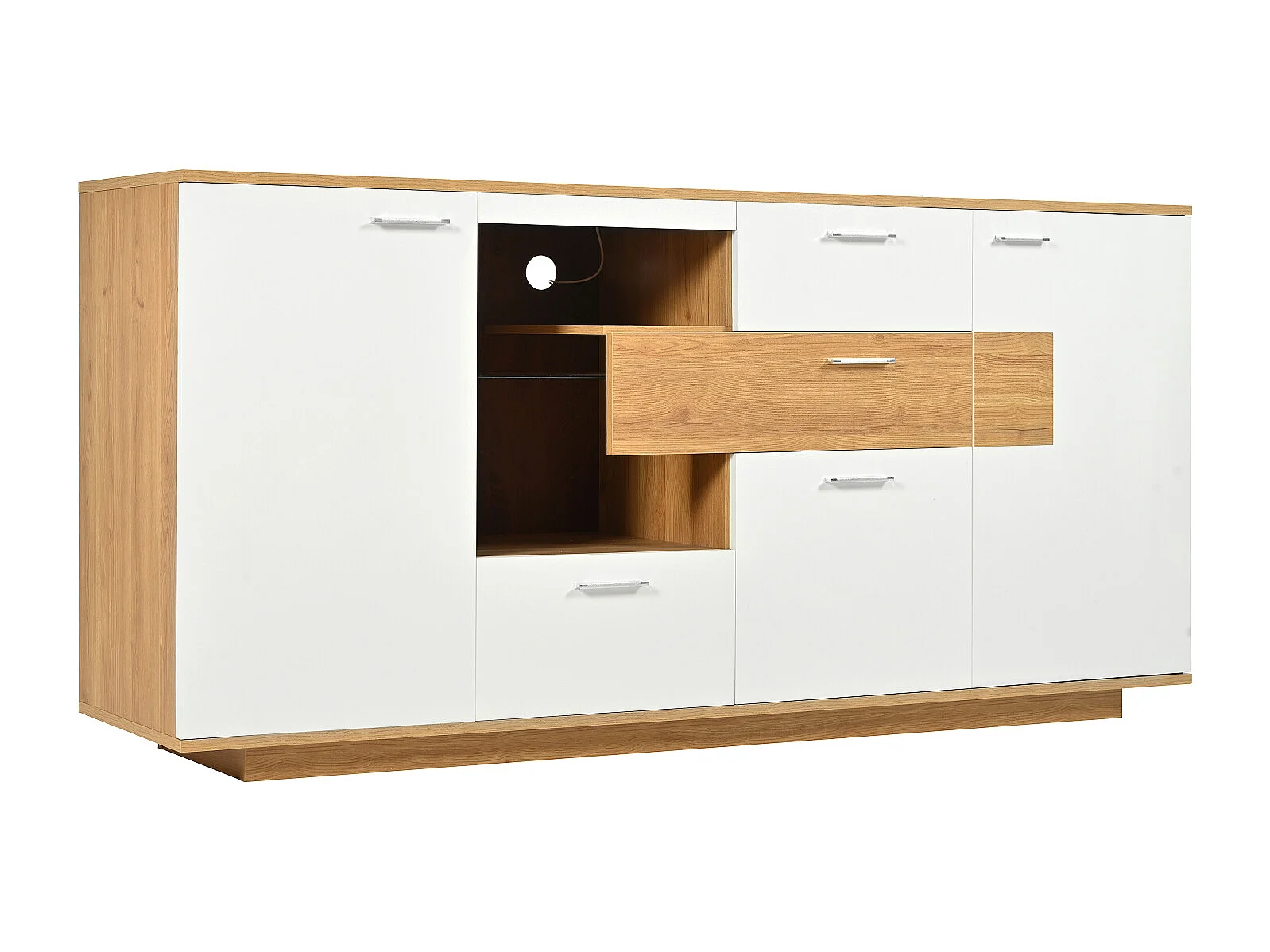Buffet 160x40x77cm avec 4 tiroirs, 2 portes, 1 niche et LED, corps en placage bois et blanc