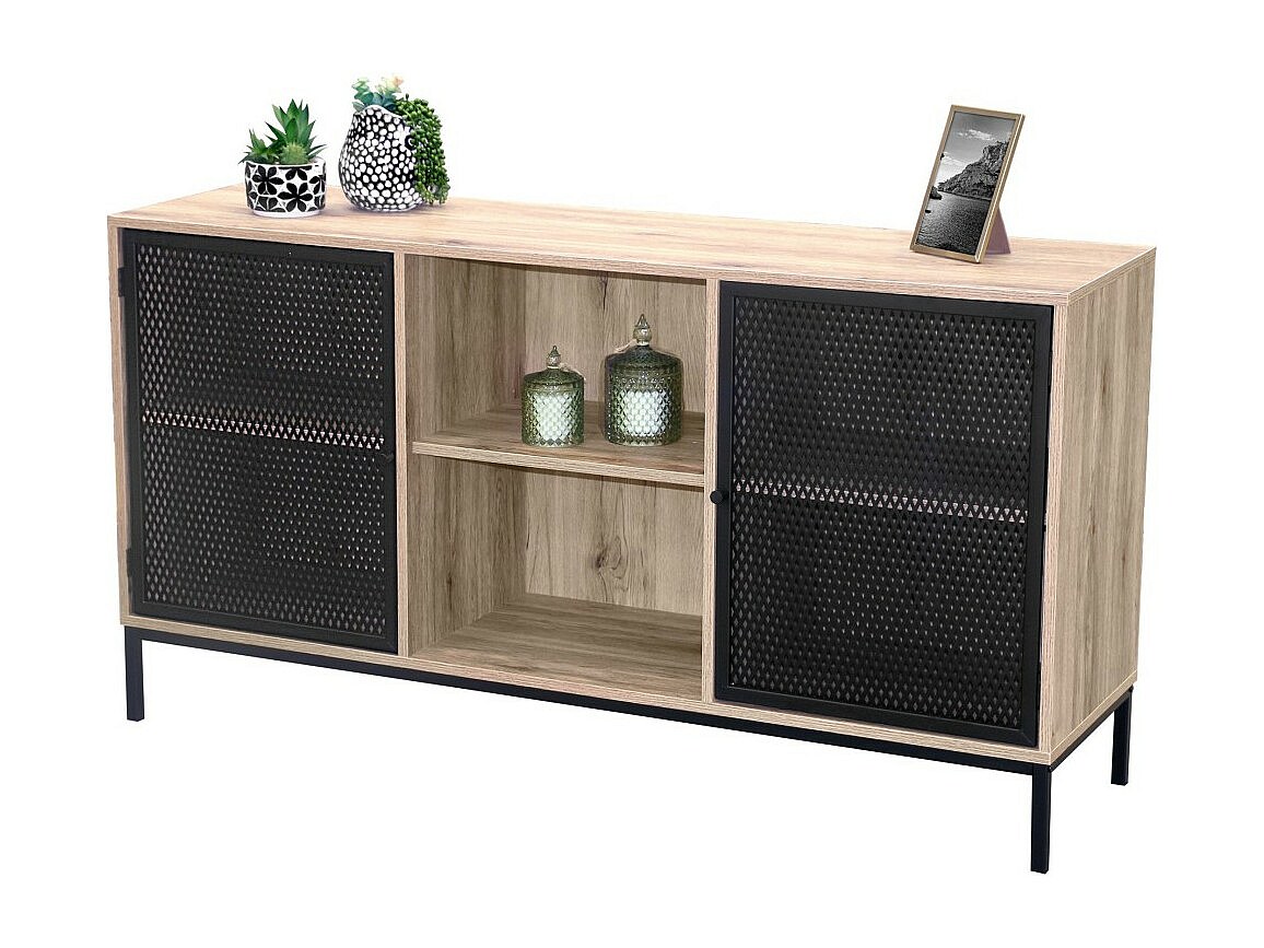 Buffet 2 portes avec grillage en métal noir – Coloris chêne clair, dimensions 100x40xH75 cm – Collection METALIX