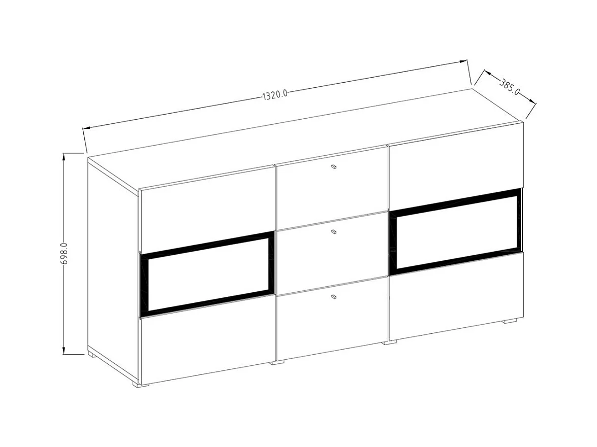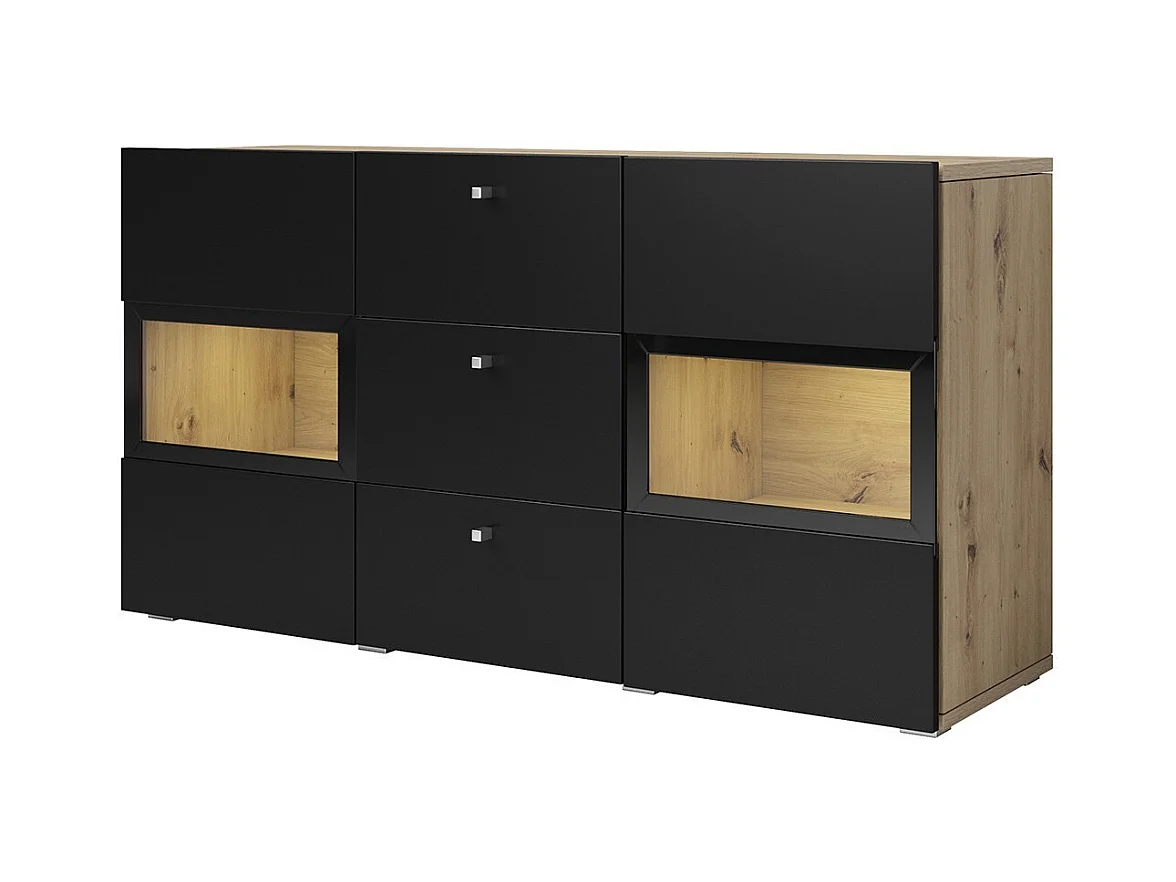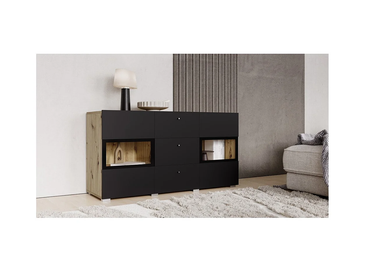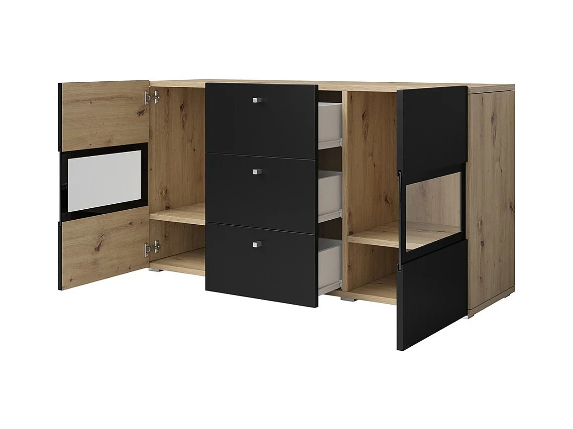 Buffet RAMOS 130 cm – Chêne et noir super mat – 2 portes vitrées et 3 tiroirs – Sans LED