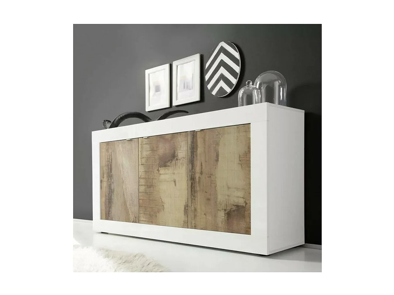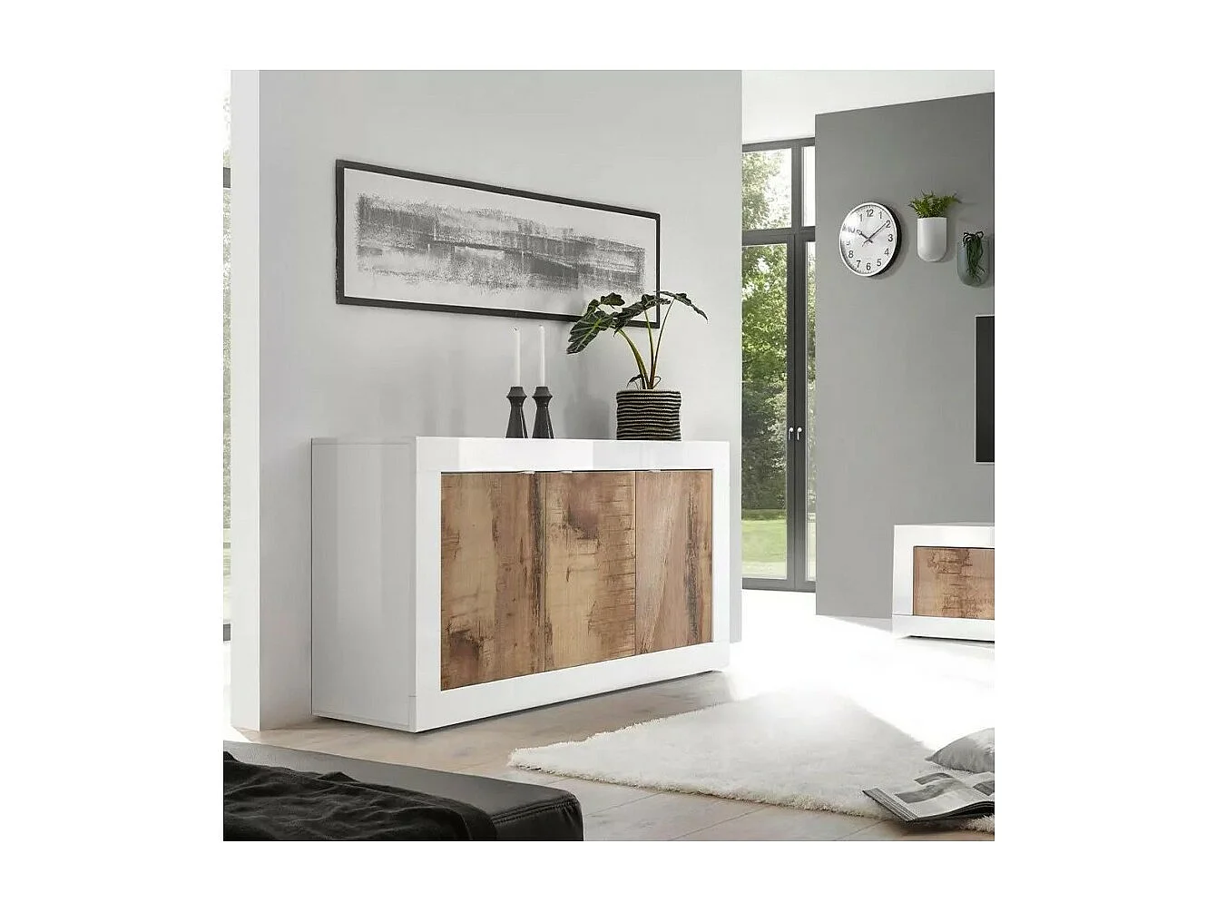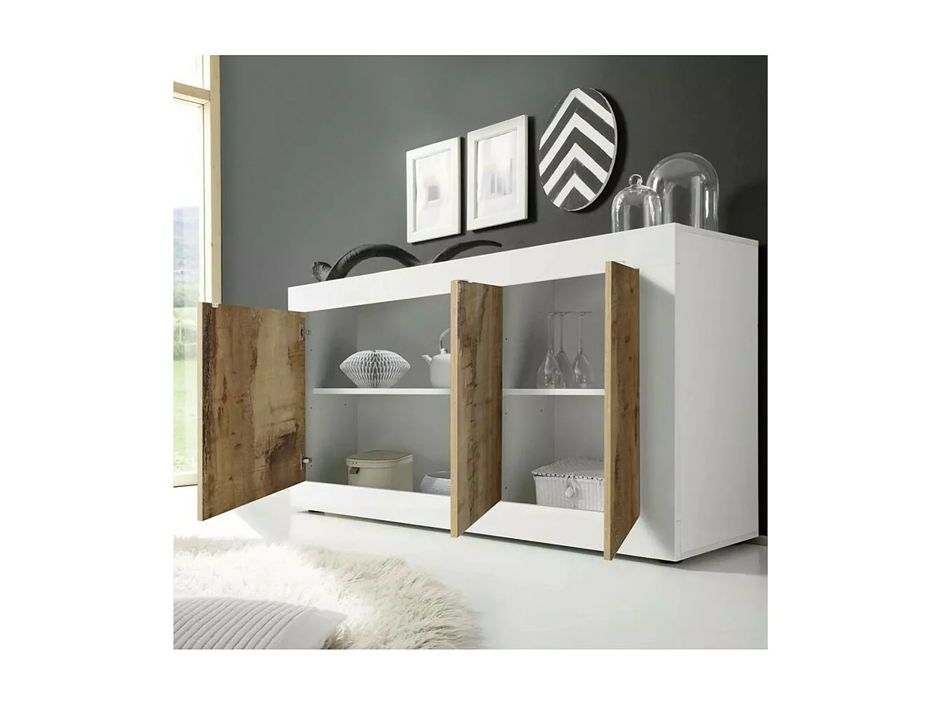Buffet 3 portes, collection ISORA, coloris blanc et chêne clair, idéal pour votre salon ou salle à manger