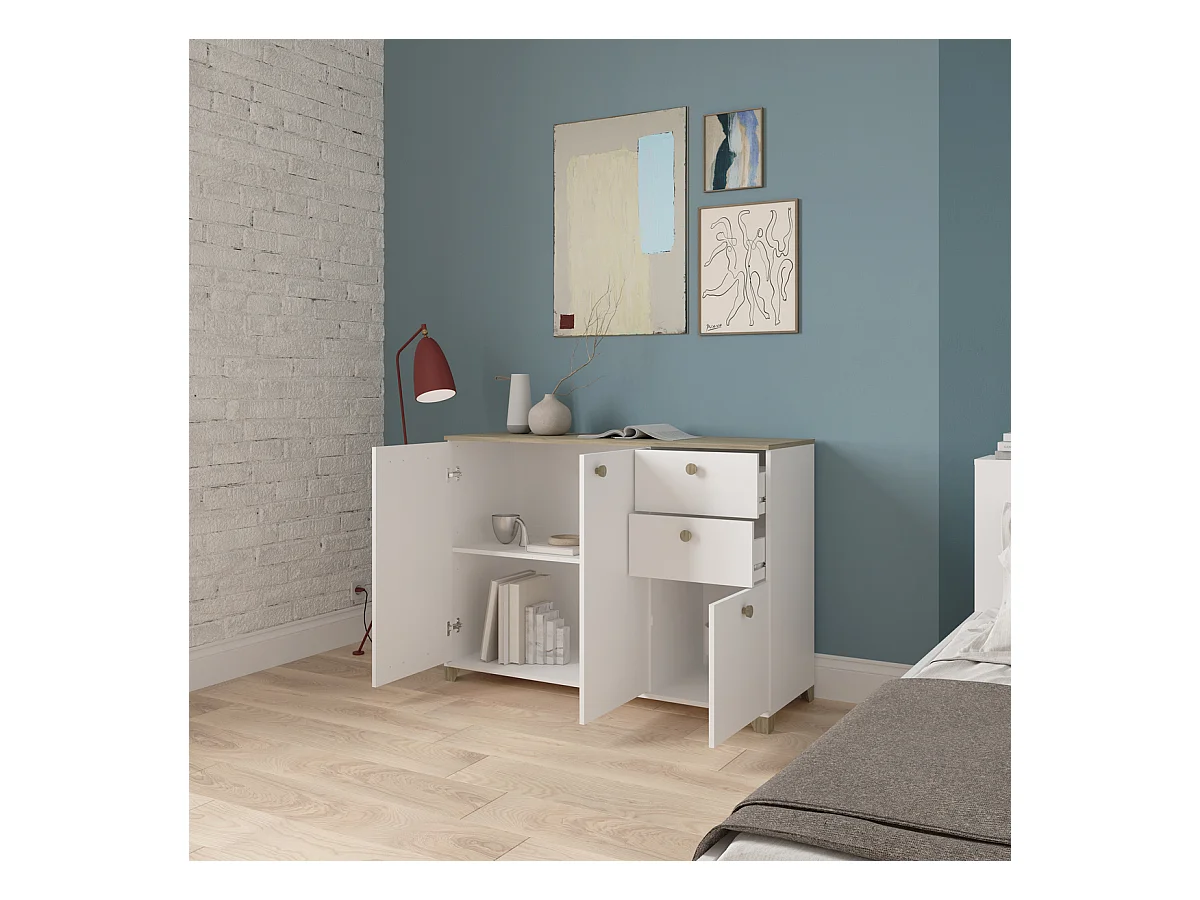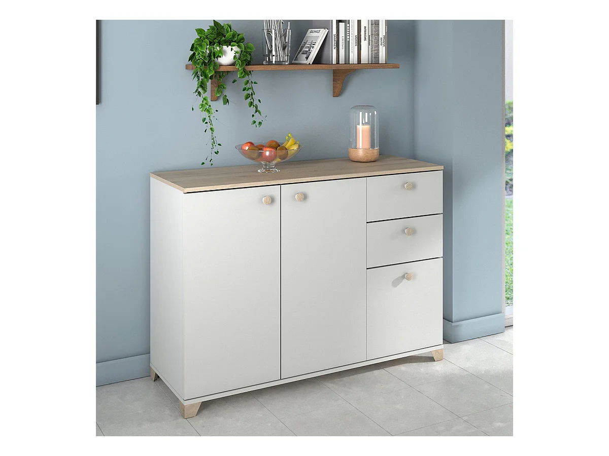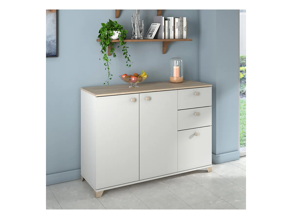 Buffet 3 portes et 2 tiroirs décor chêne kronberg et blanc - L119,6 cm