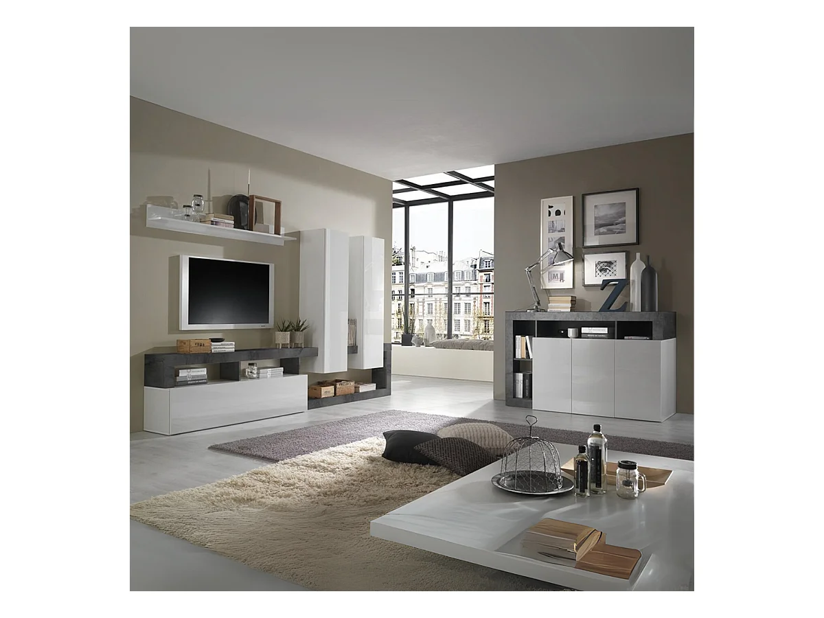 Buffet Bellevue, Buffet de salon, Meuble TV, Buffet pour salon, Armoire moderne avec 3 portes, 144x42h80 cm, Ciment et Blanc