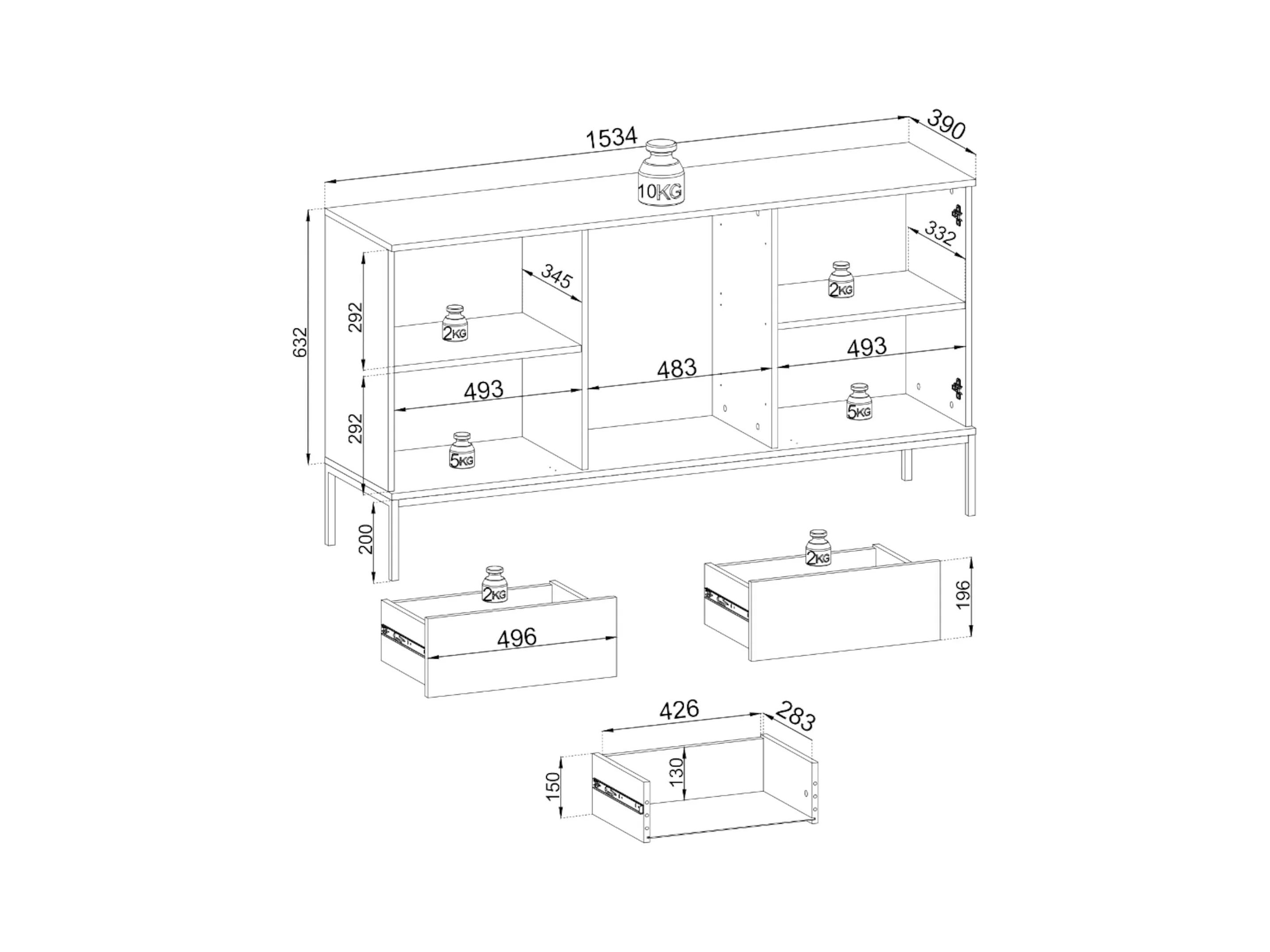 Buffet à trois portes - 154 cm - avec tiroirs - suspendu - grège - EVO