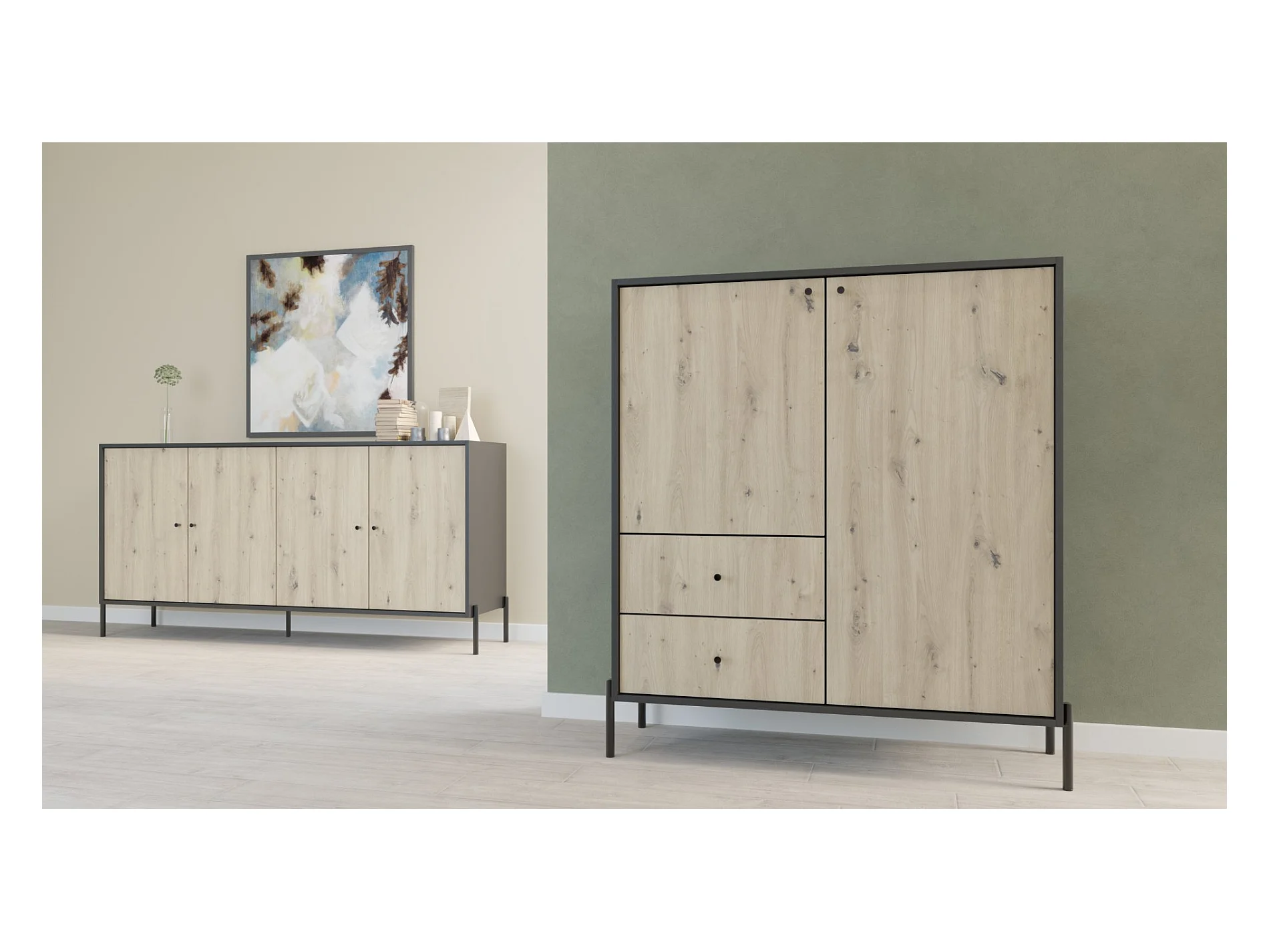 Buffet haut - 100 cm - 2 tiroirs - noir/aspect chêne artisan - RAVIERO