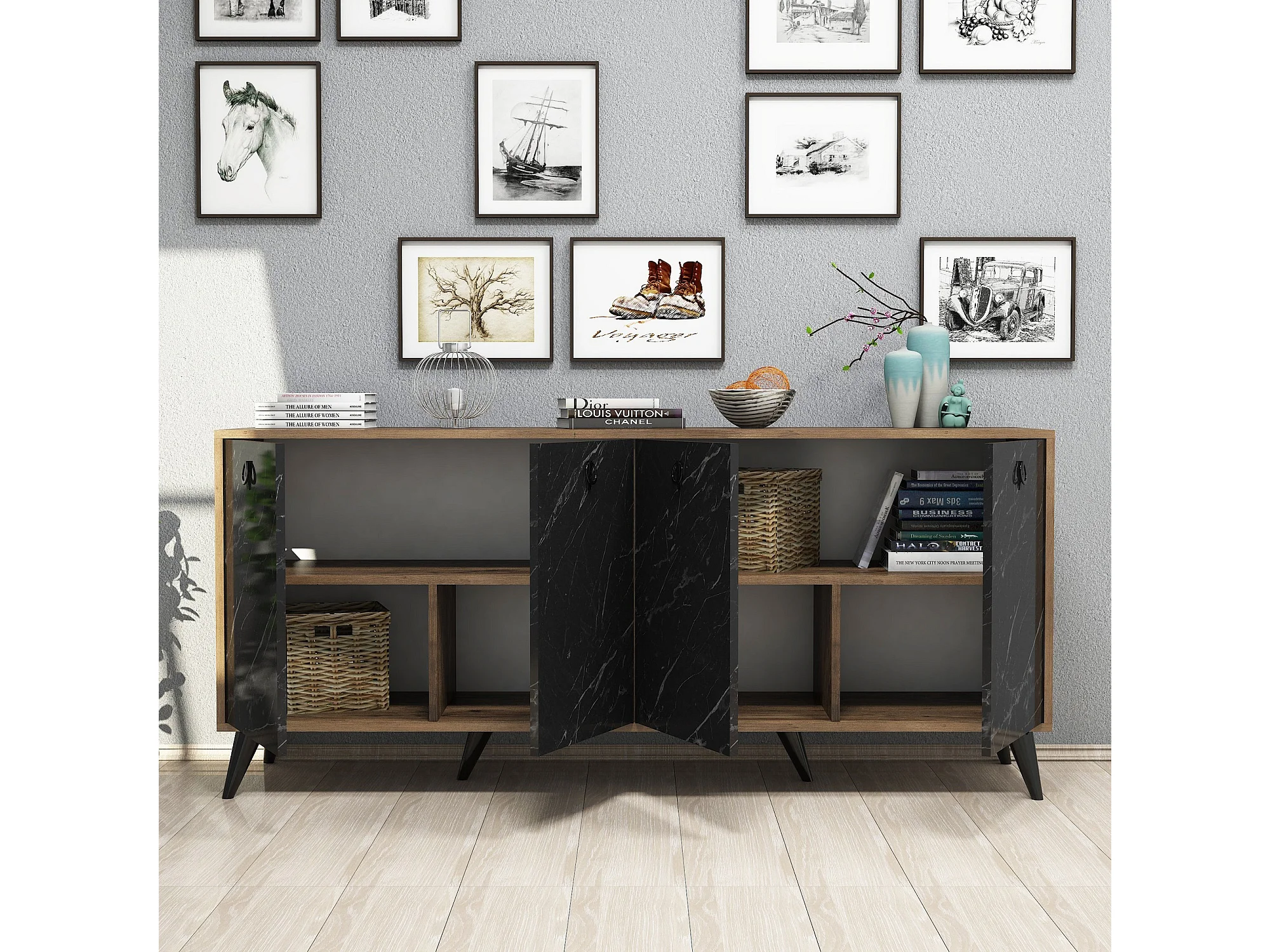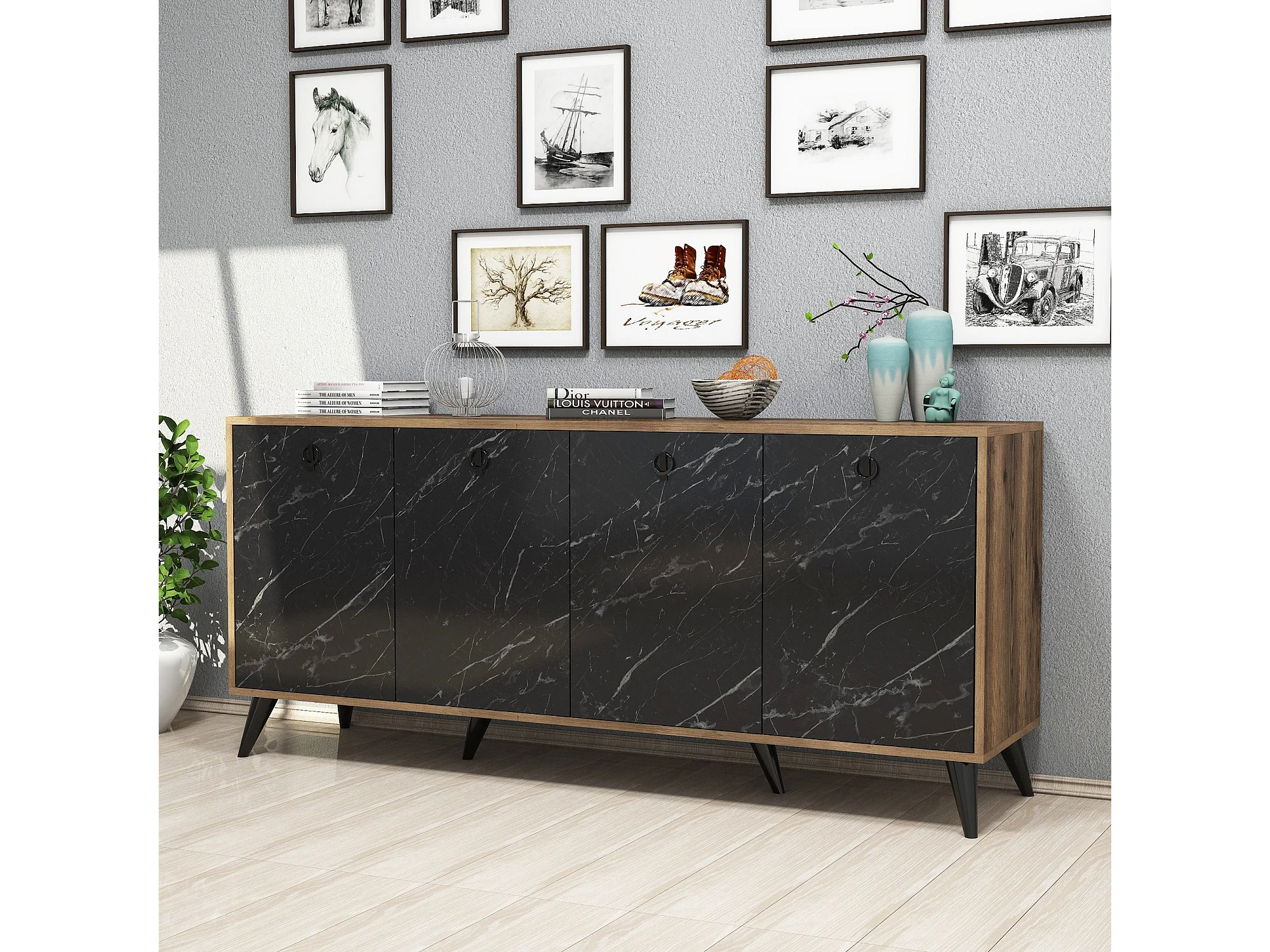 Buffet 4 portes Ancon 180x80cm Bois Naturel et Noir effet marbre