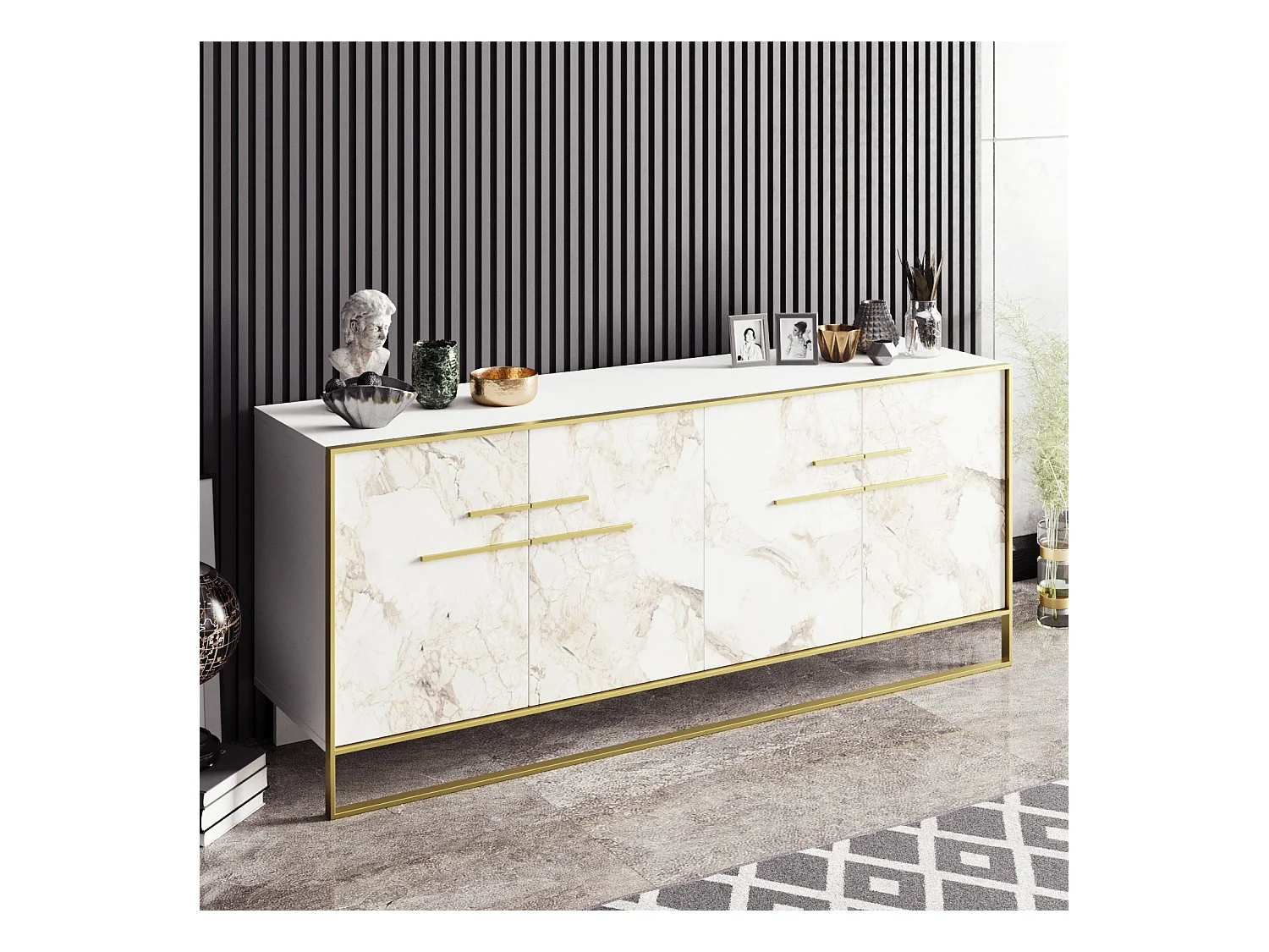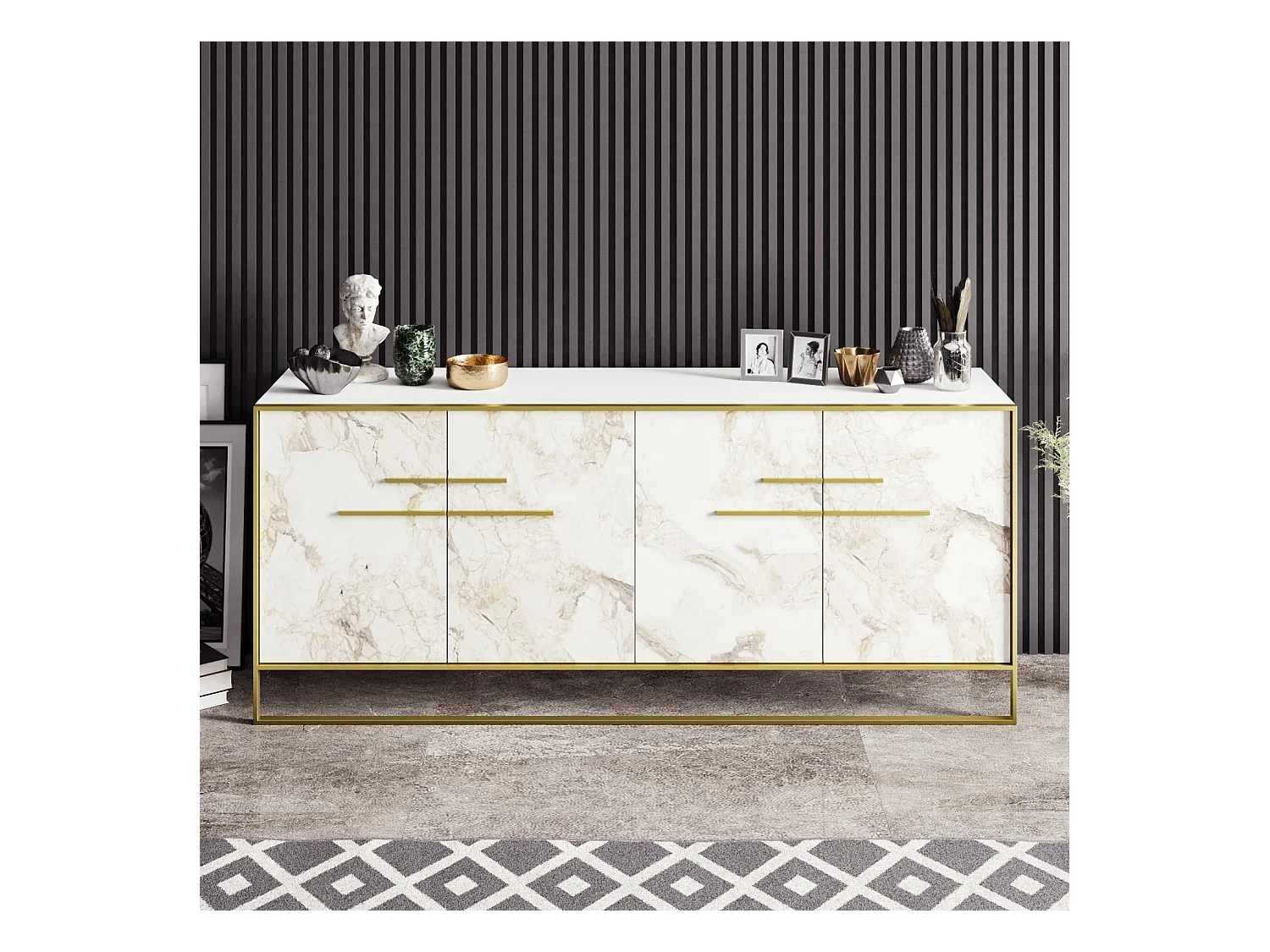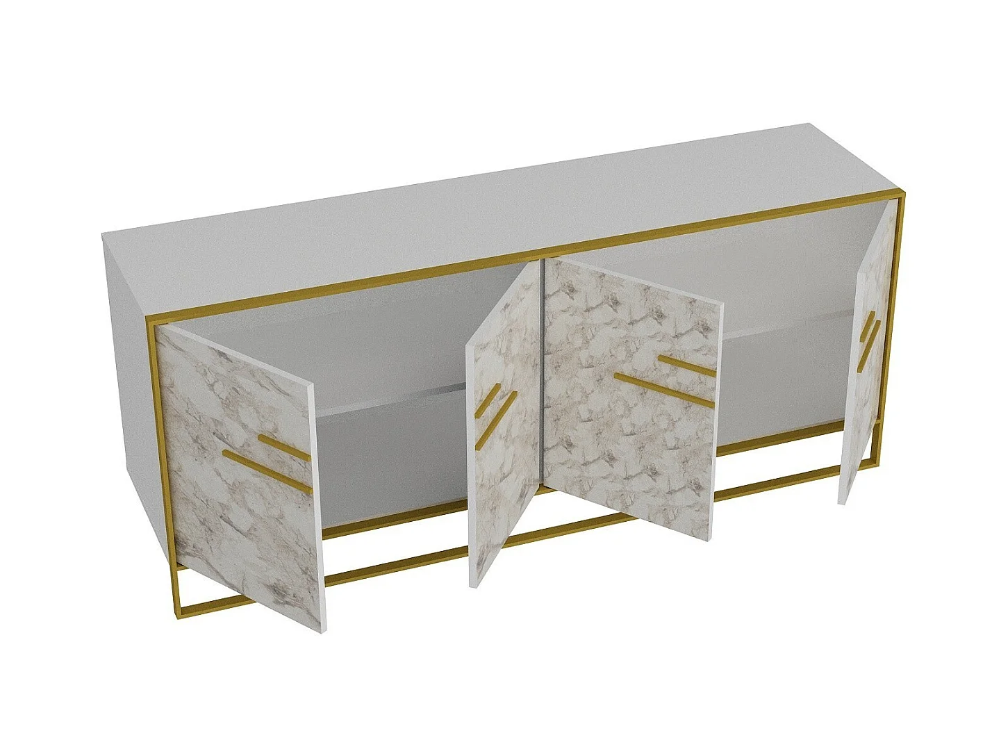 Buffet 4 portes Anita 179,9x75cm Métal Or et Bois Blanc effet marbre