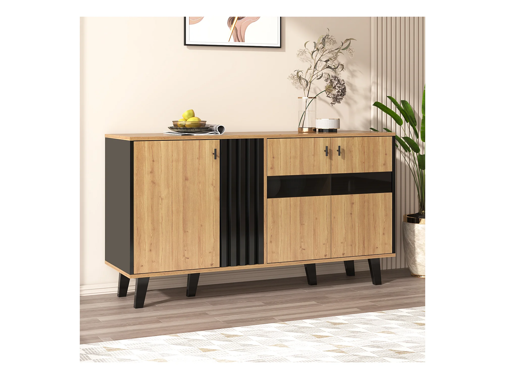 Buffet 4 portes, bois et noir, avec éclairage LED, verre, MDF, (140x78.5x41 cm)