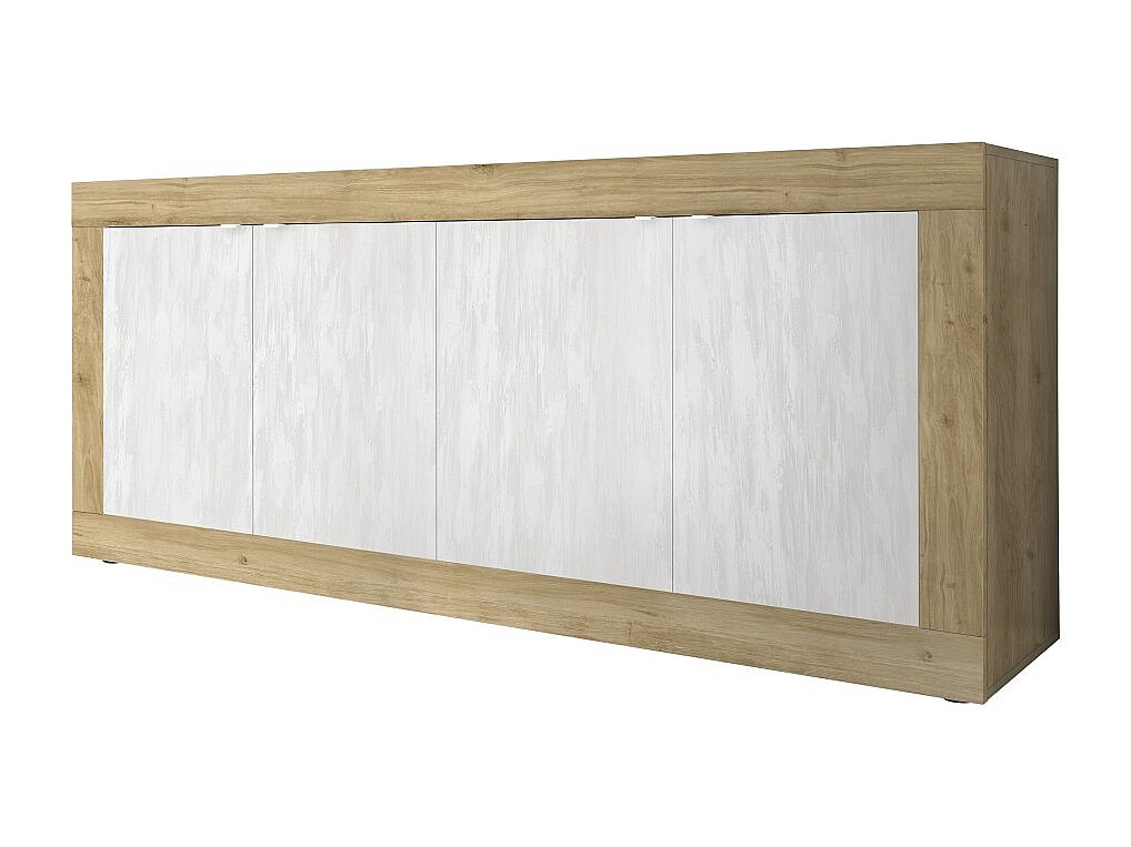 Buffet 4 portes, collection ISORA, coloris blanc et chêne clair, idéal pour un salon ou une salle à manger moderne