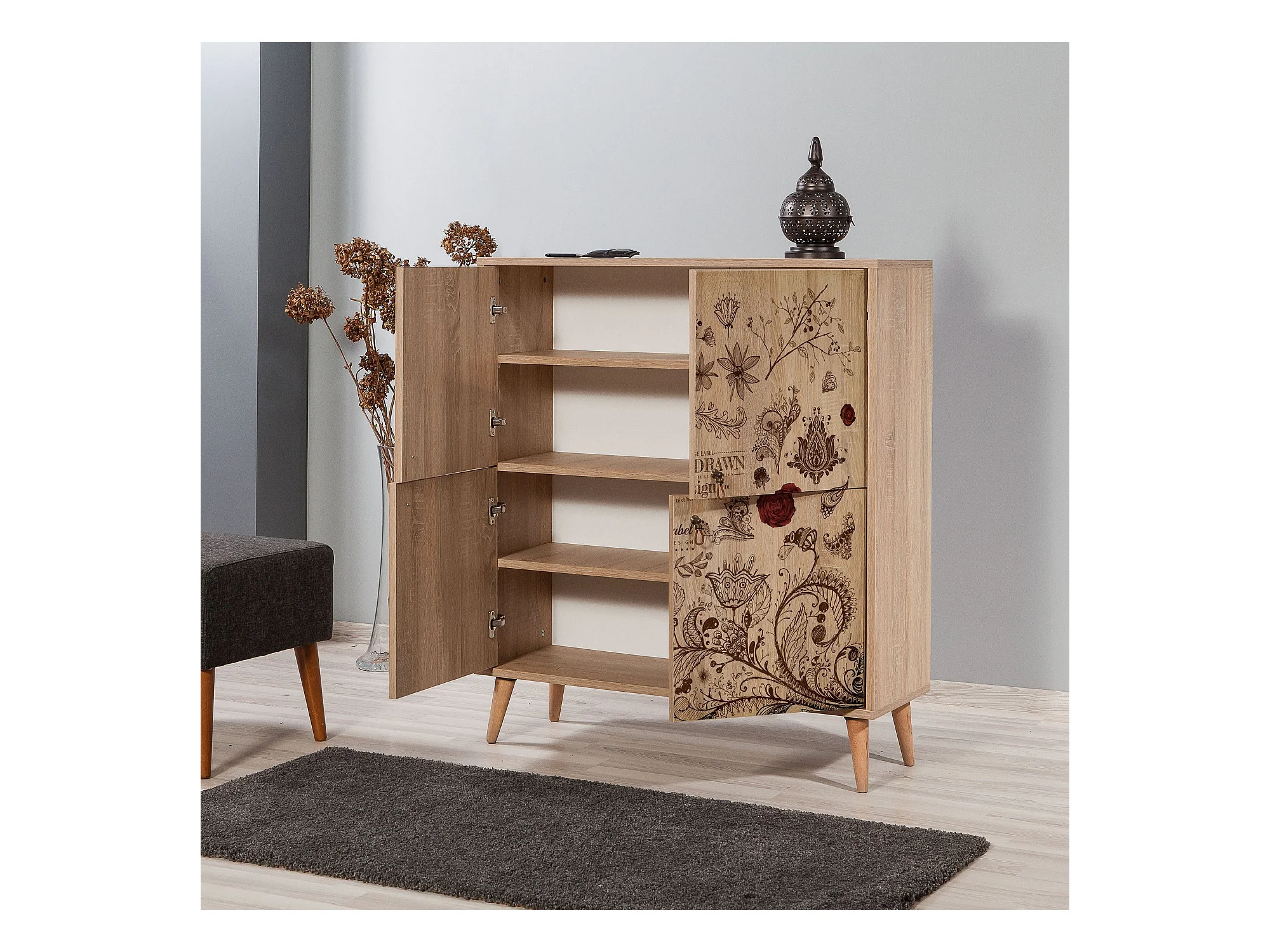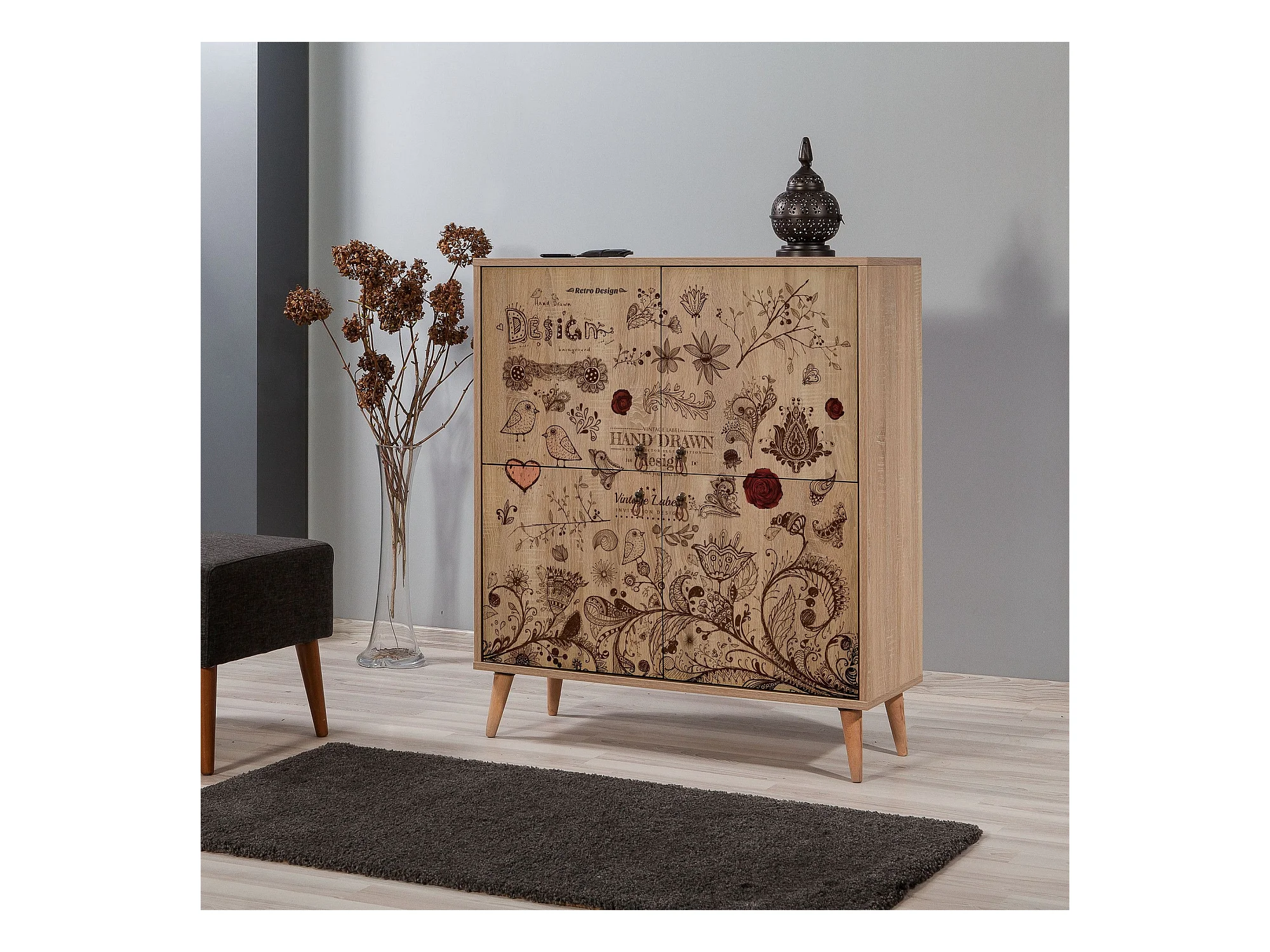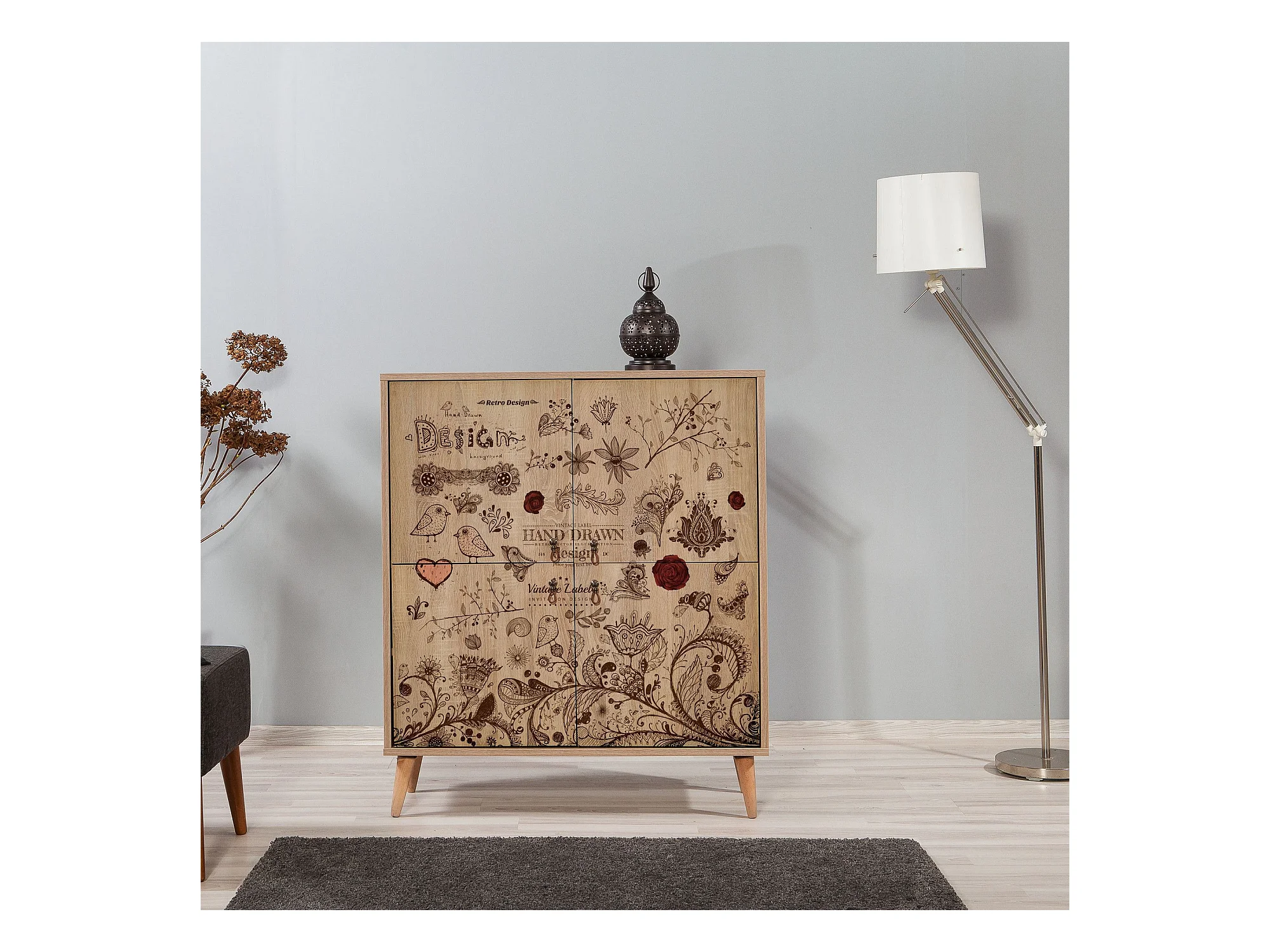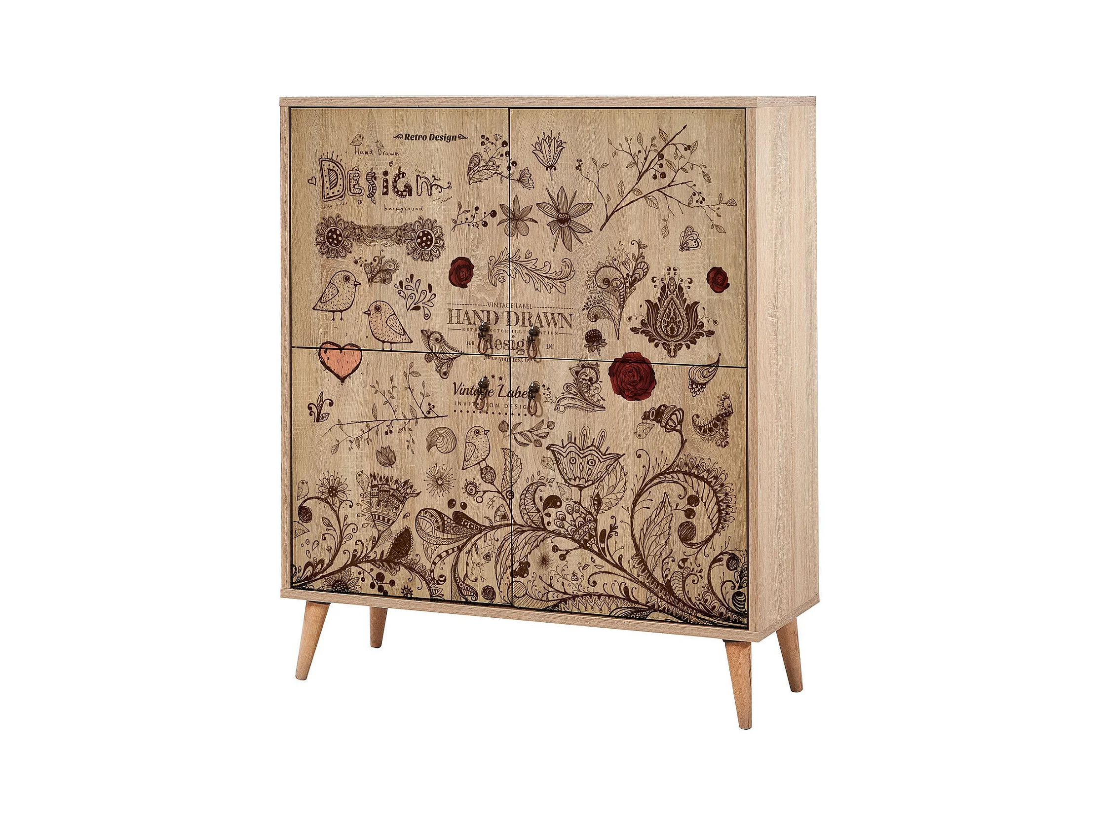 Buffet 4 portes Soho 95x111cm Motif Oiseaux et fleurs Bois Naturel et Marron